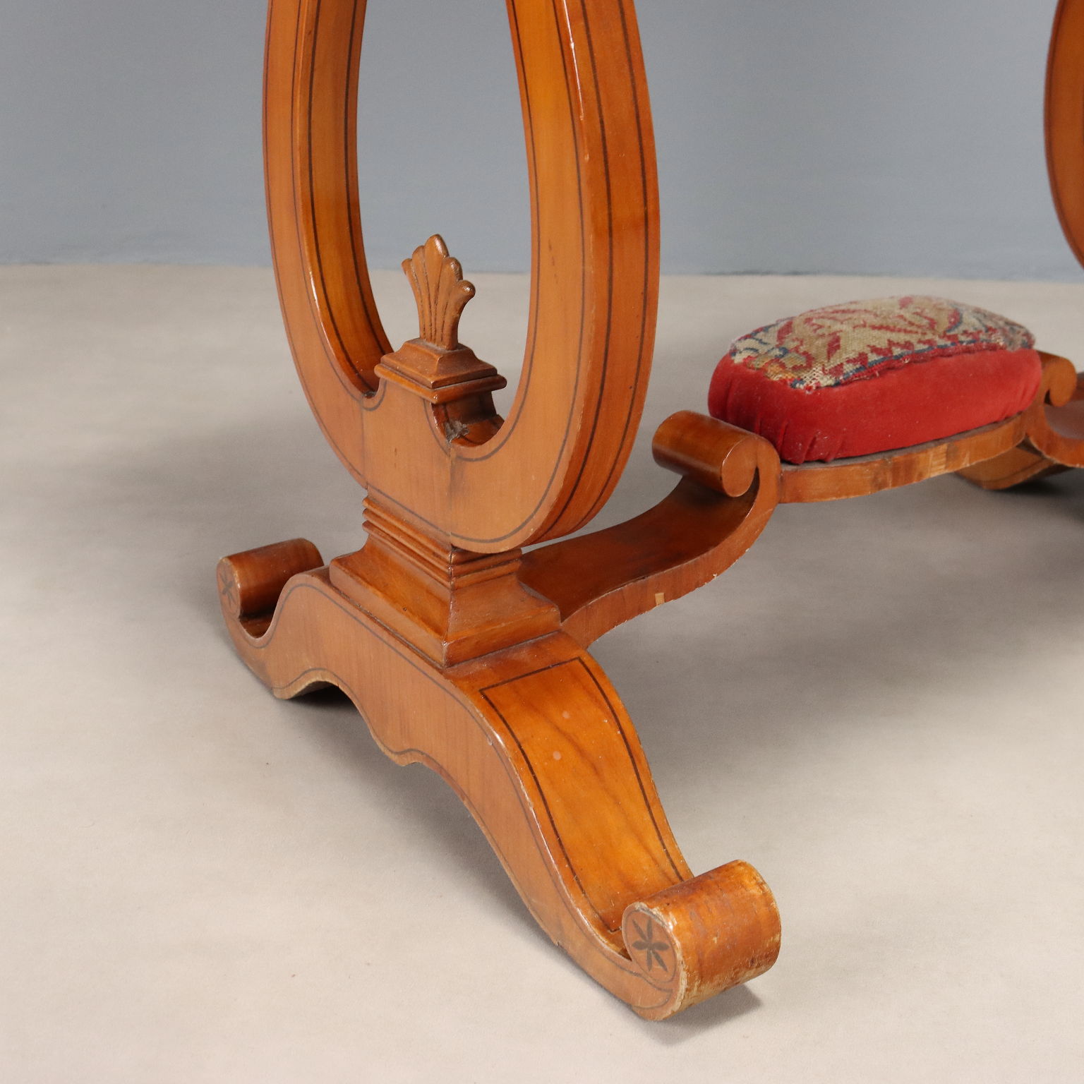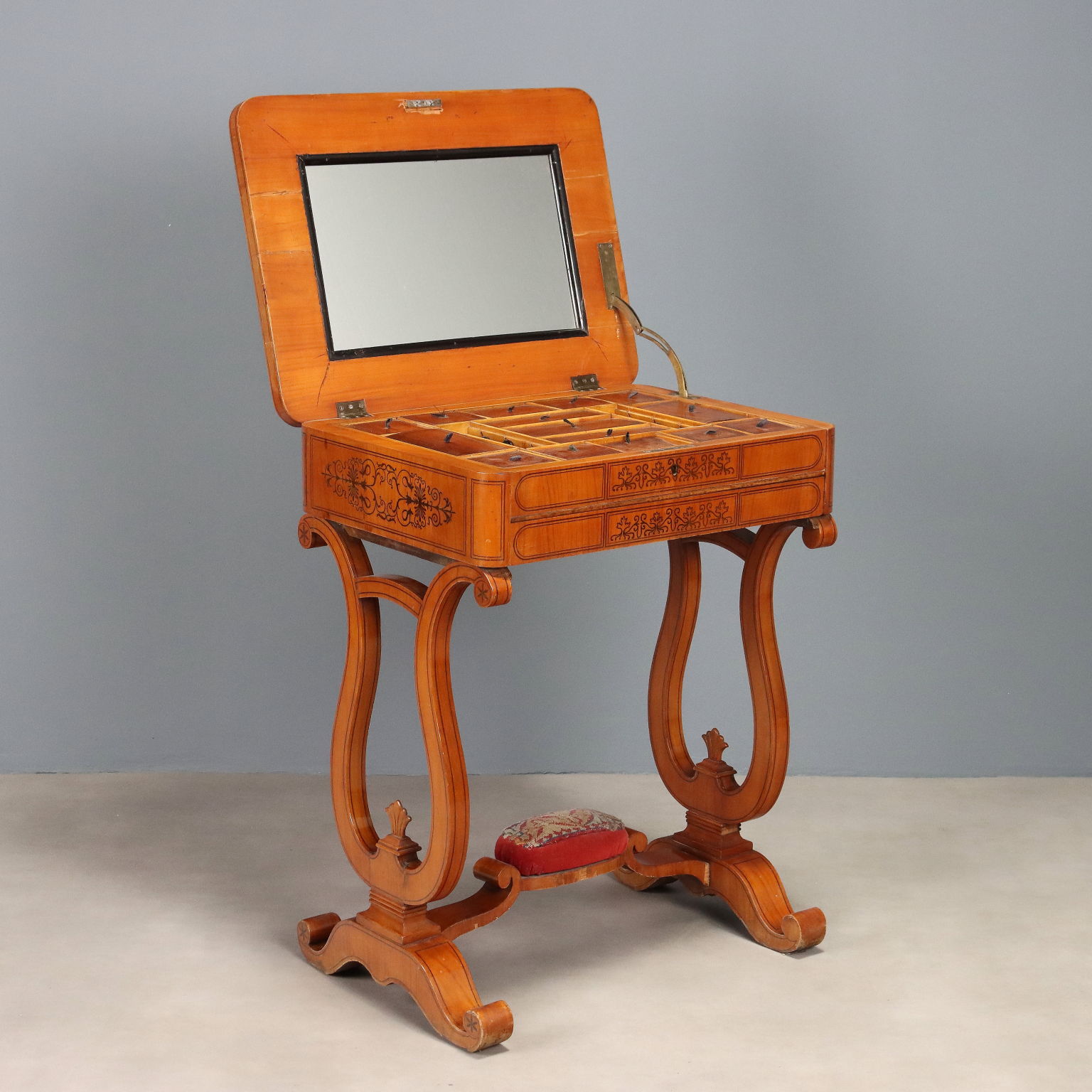 Charles X cherrywood and walnut inlay work table. Drop-leaf top concealing a mirror behind it and various compartments. Drawer in the lower section, lyre legs joined by a crosspiece to the base with a central bearing. Italy, second quarter of the 19th century.