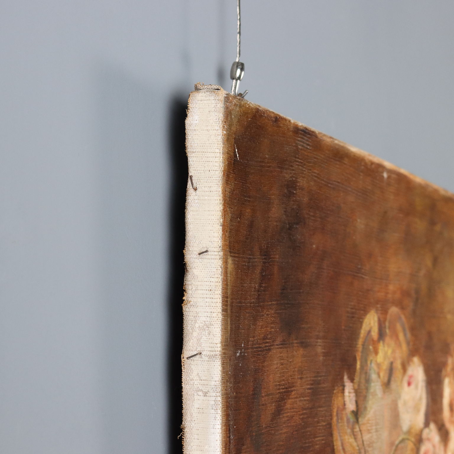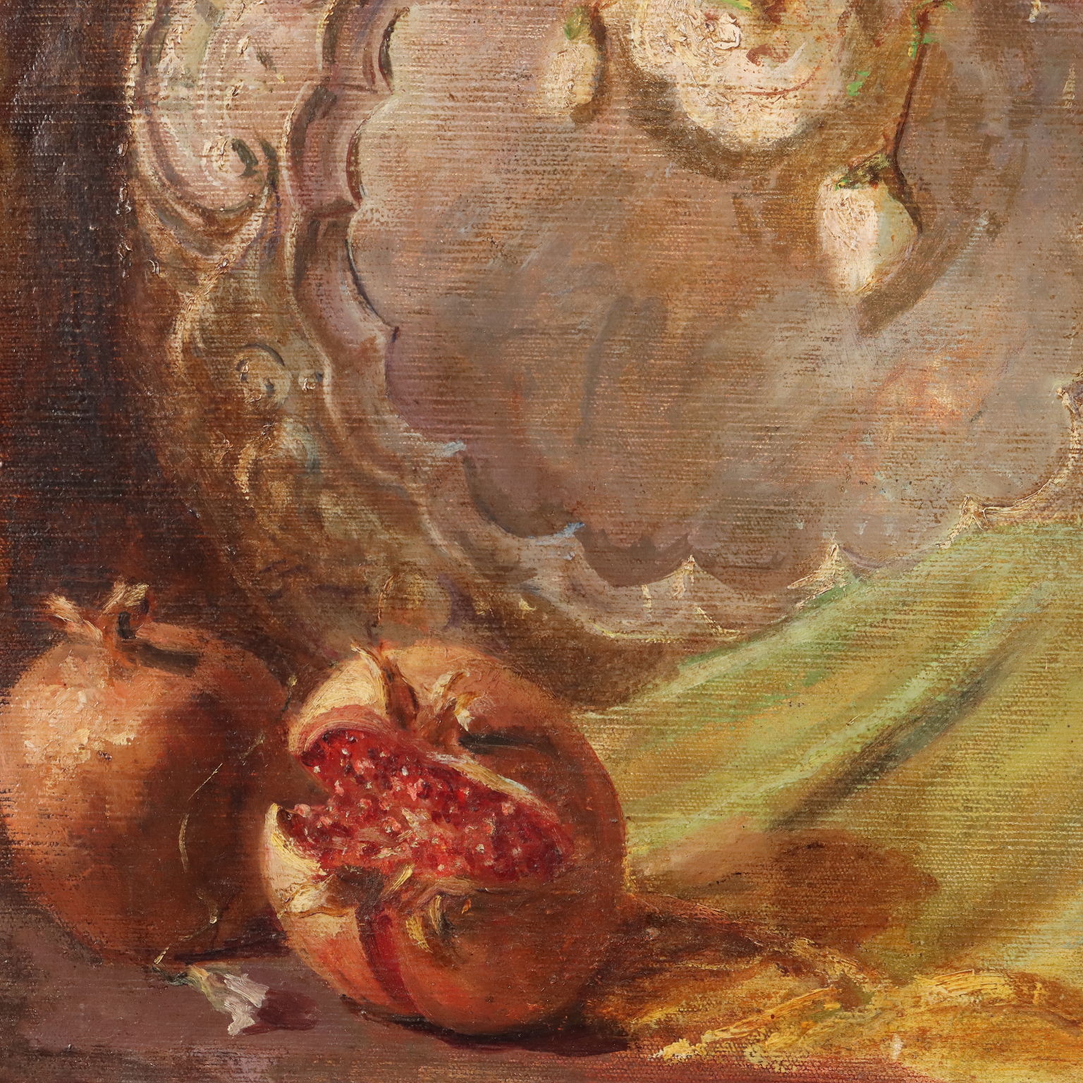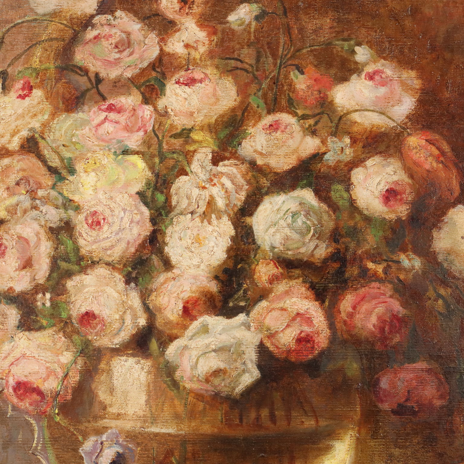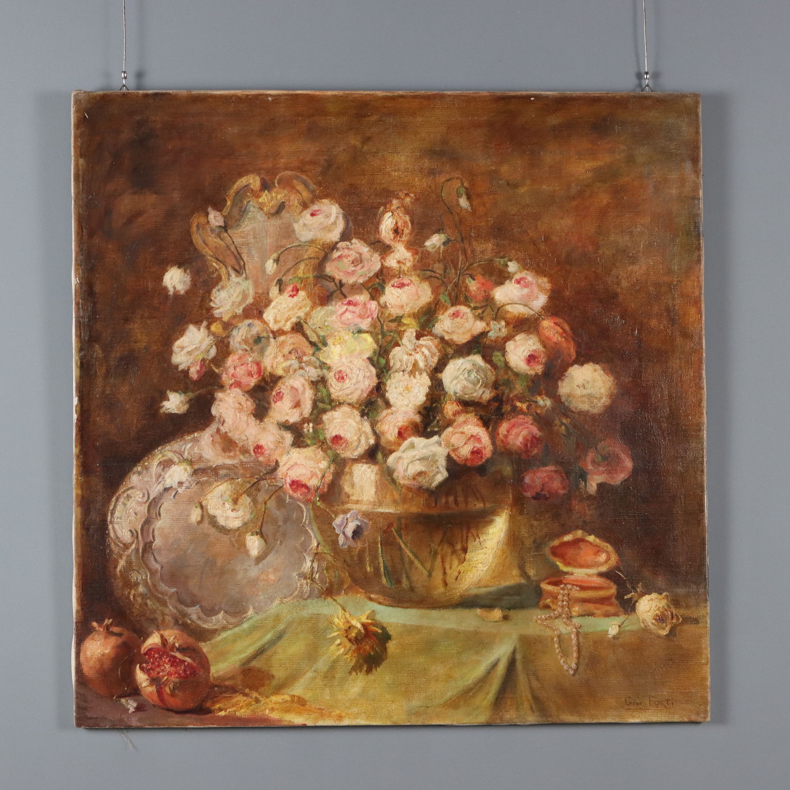 Oil on canvas. Unidentified signature lower right. An elegant and refined composition of roses in delicate shades of pink and white, arranged in a gilded metal basin, sits on a small table along with pomegranates, a symbol of fertility and prosperity, an embossed silver plate, and a casket containing a pearl necklace. The background, in a single, earthy, nuanced color, highlights the light effects of the flowers and objects.