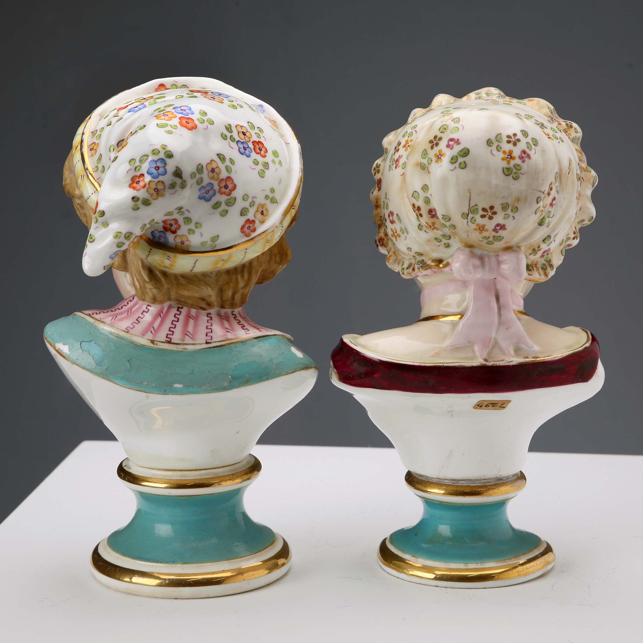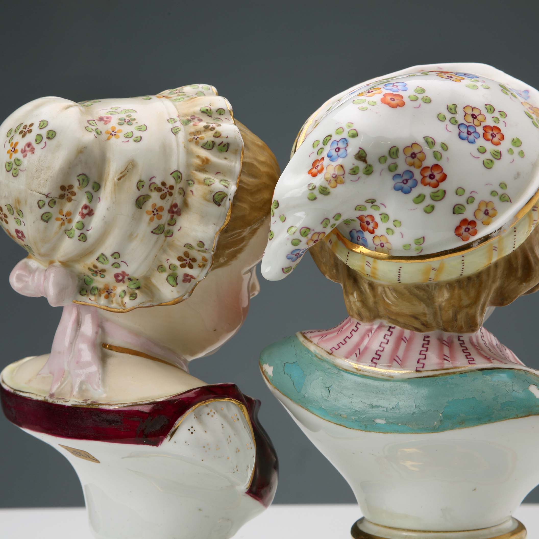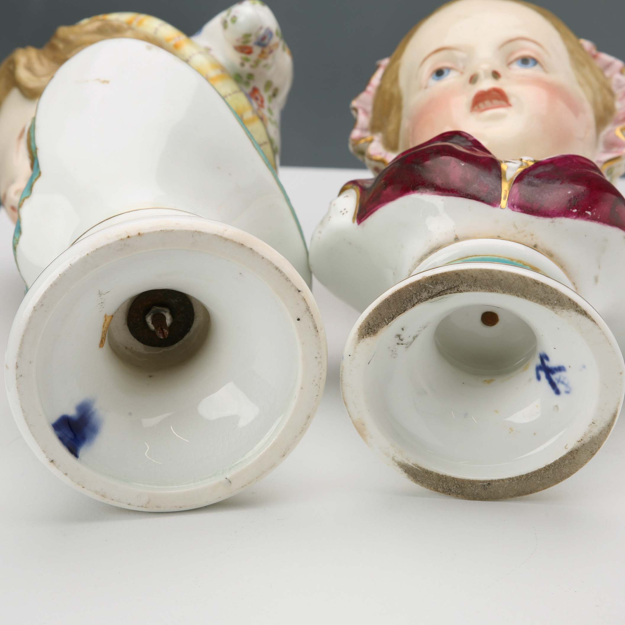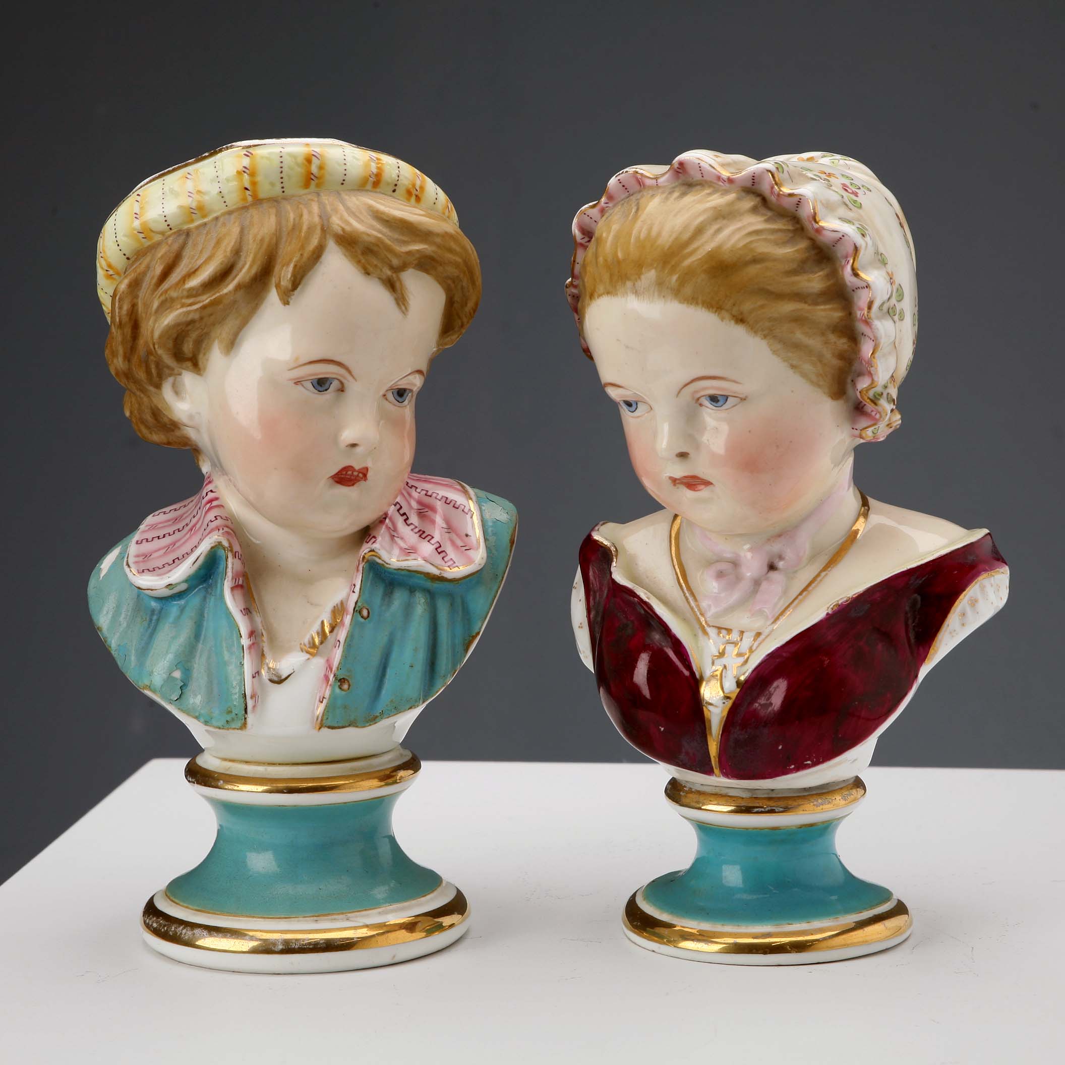 A pair of polychrome-decorated porcelain busts of children. Manufactory mark in blue underglaze.