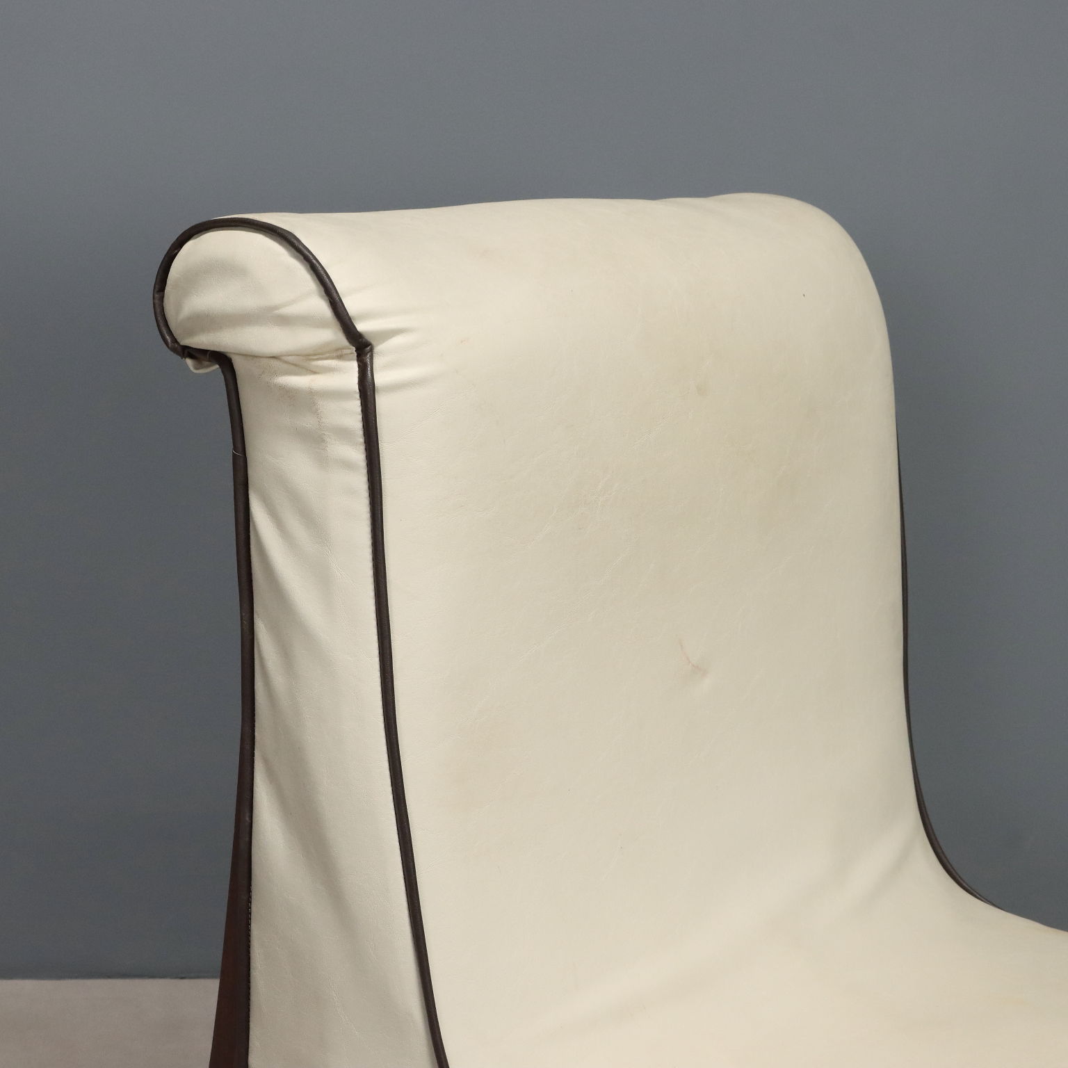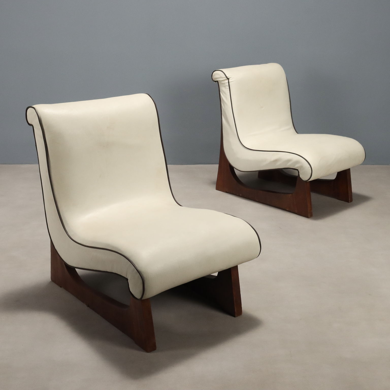 Pair of vintage armchairs with foam padding and original period white vinyl upholstery, wooden legs. These seats are ready for upholstery and upholstery renewal, choosing from the many options available in our workshop.