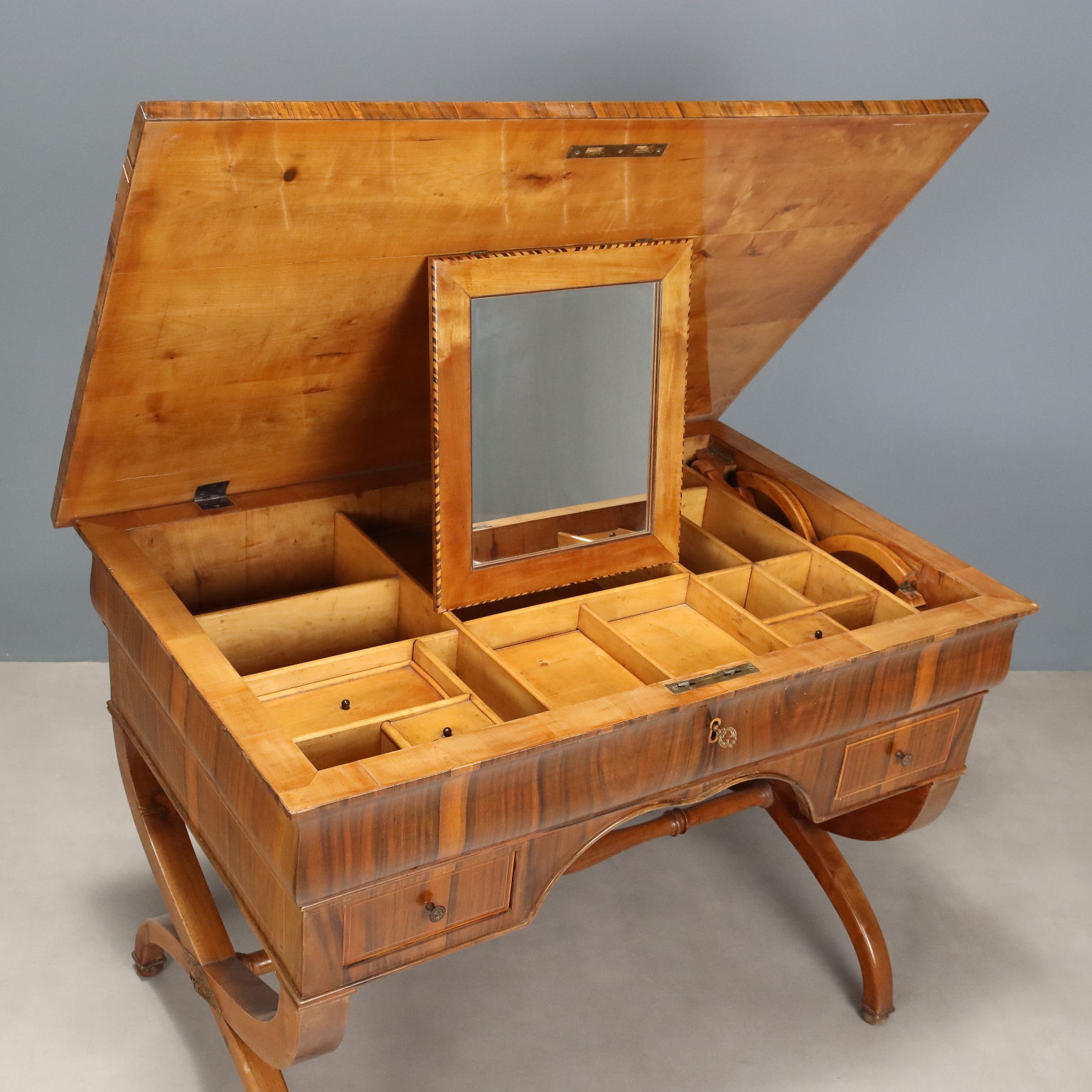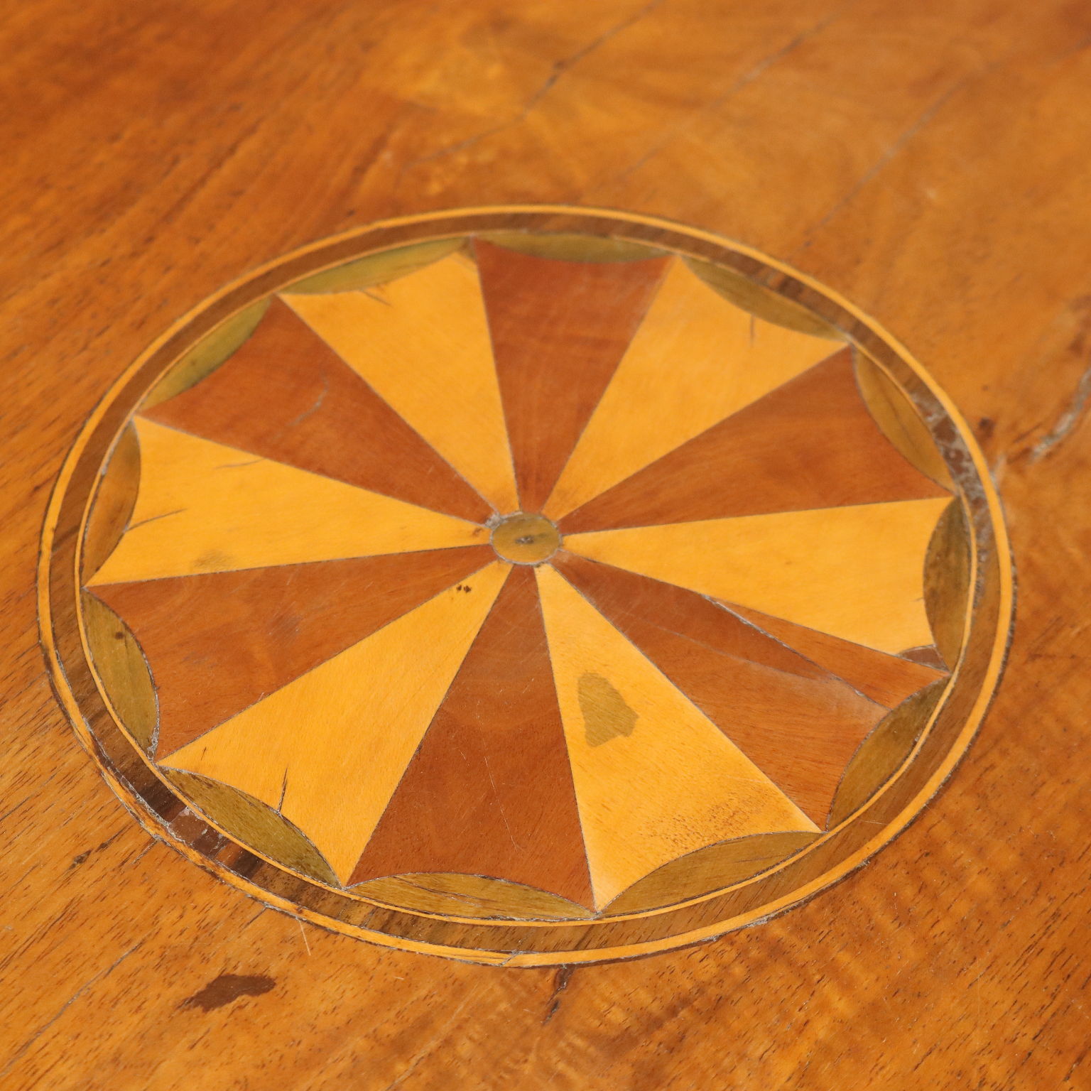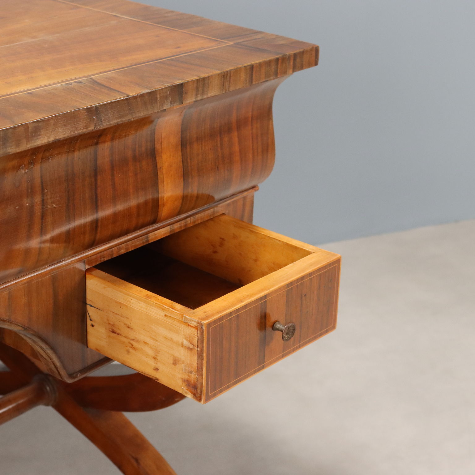 Large walnut worktable. A drop-leaf top conceals open compartments, drawers, and maple sewing tools. A mirror serves as a support for the open top. Central inlay in various woods, maple trim. A pair of drawers on the front, crossed saber legs joined by a turned crosspiece. Italy, mid-19th century.