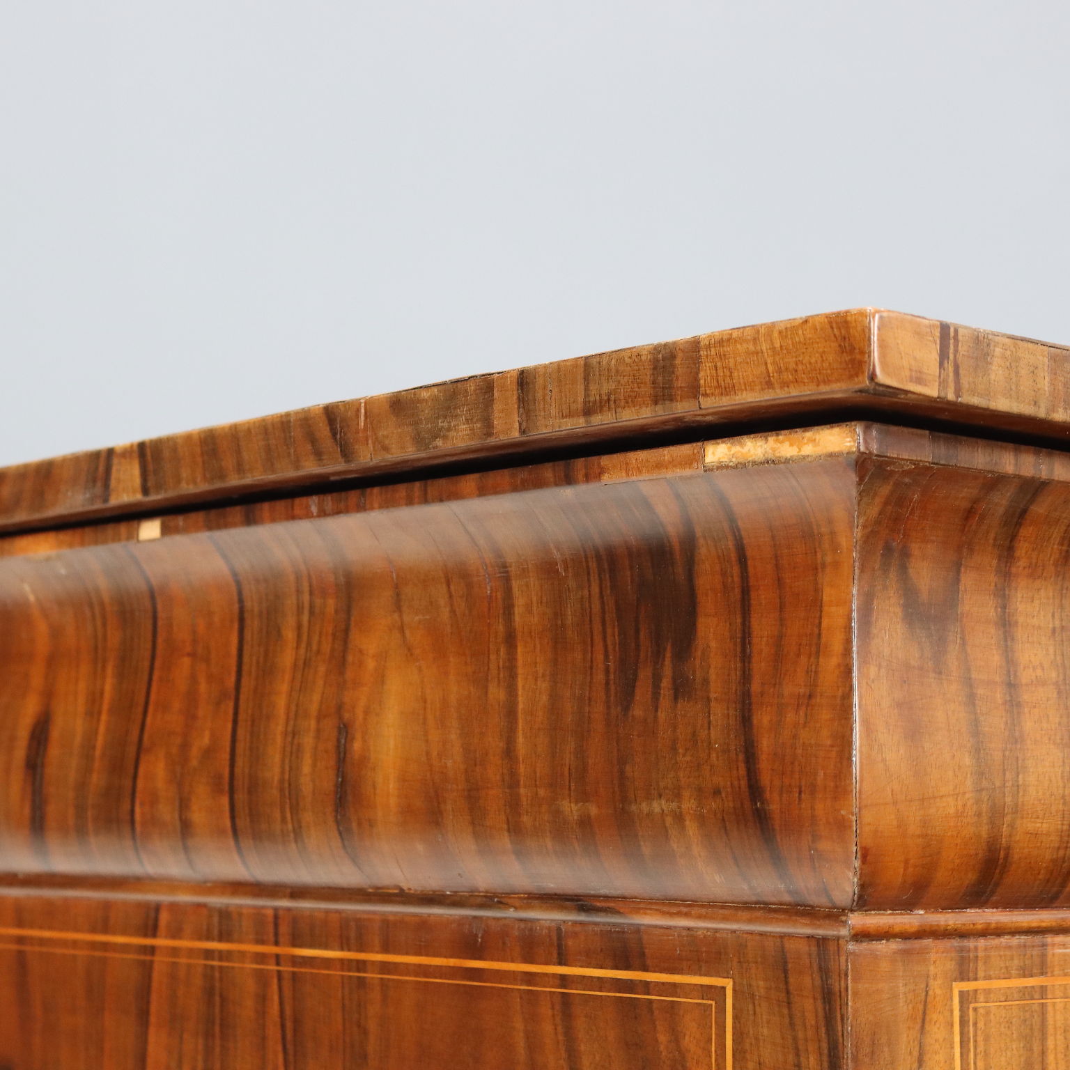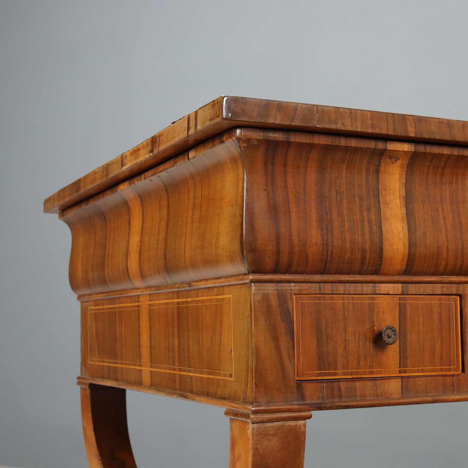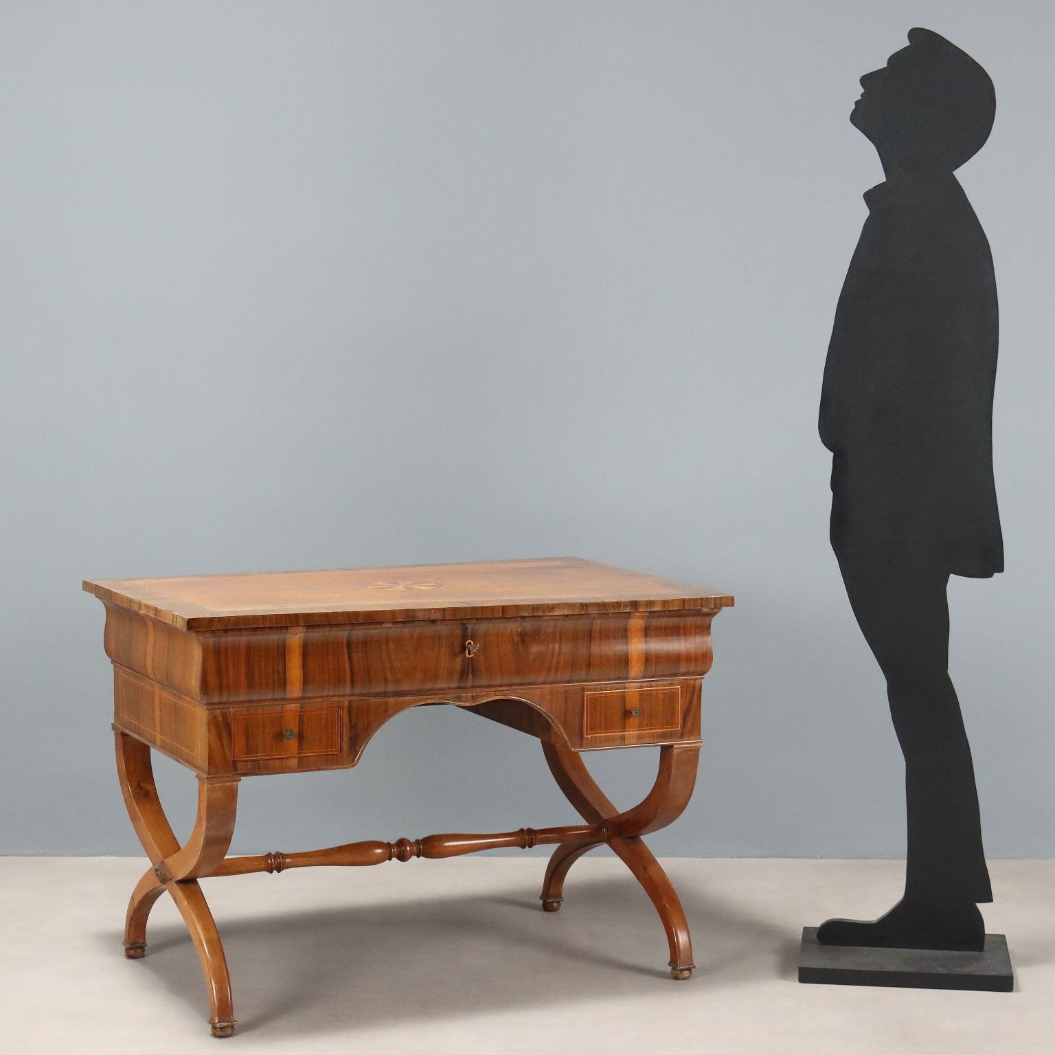 Large walnut worktable. A drop-leaf top conceals open compartments, drawers, and maple sewing tools. A mirror serves as a support for the open top. Central inlay in various woods, maple trim. A pair of drawers on the front, crossed saber legs joined by a turned crosspiece. Italy, mid-19th century.
