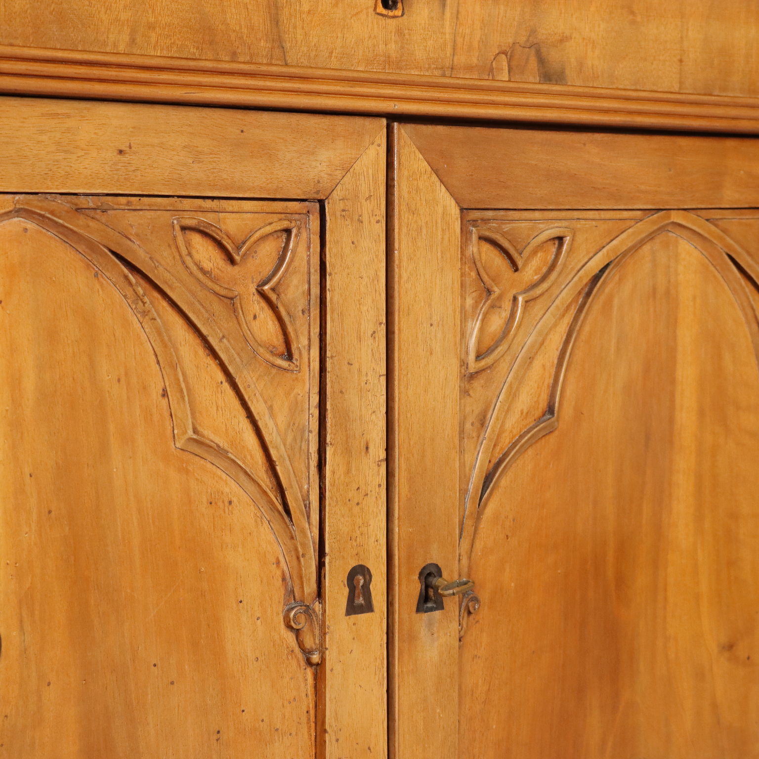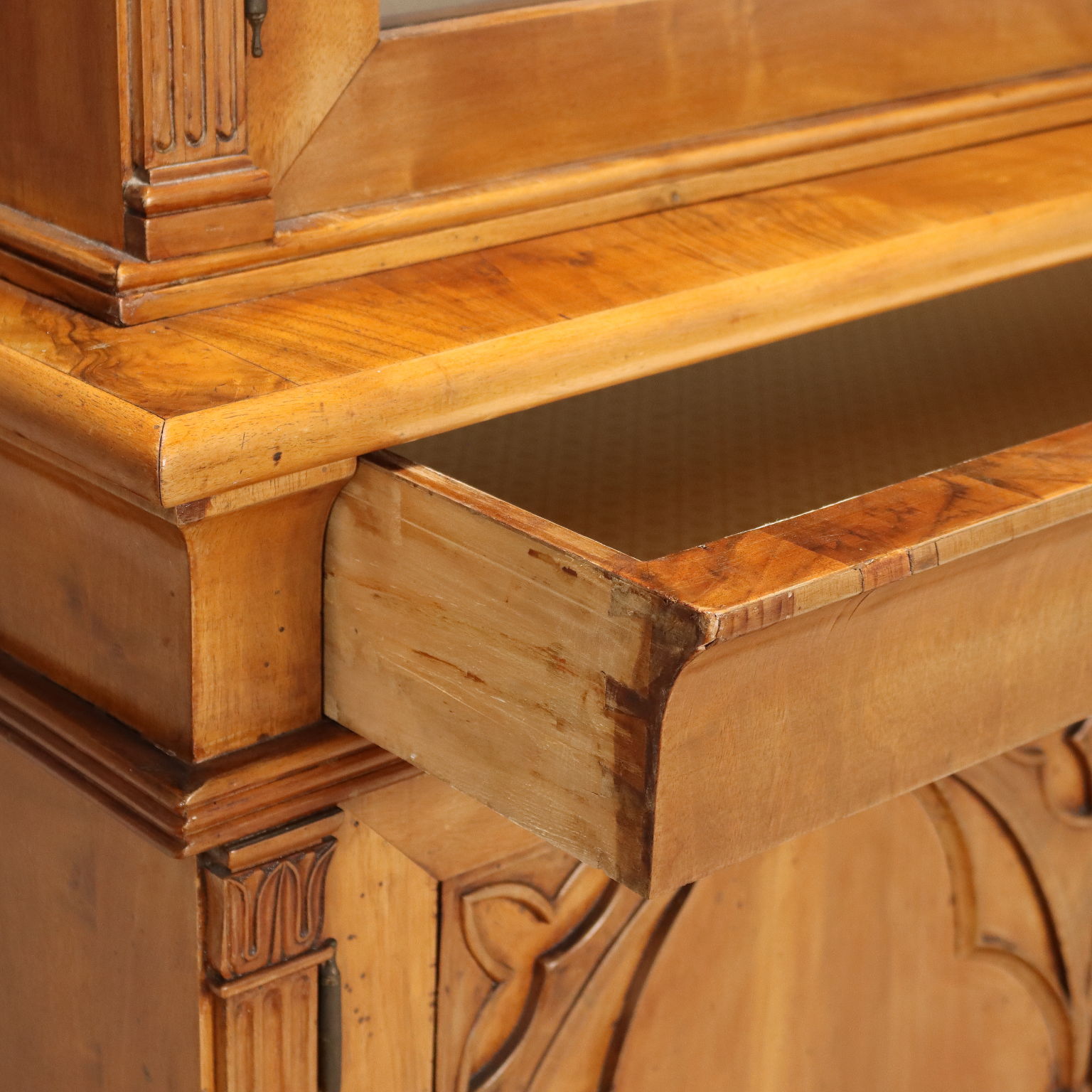 Neo-Gothic walnut sideboard. The upper part features adjustable internal shelves, glass doors, tapered uprights, and a pair of paneled doors and a drawer underneath. Plinthed legs. France, mid-19th century.