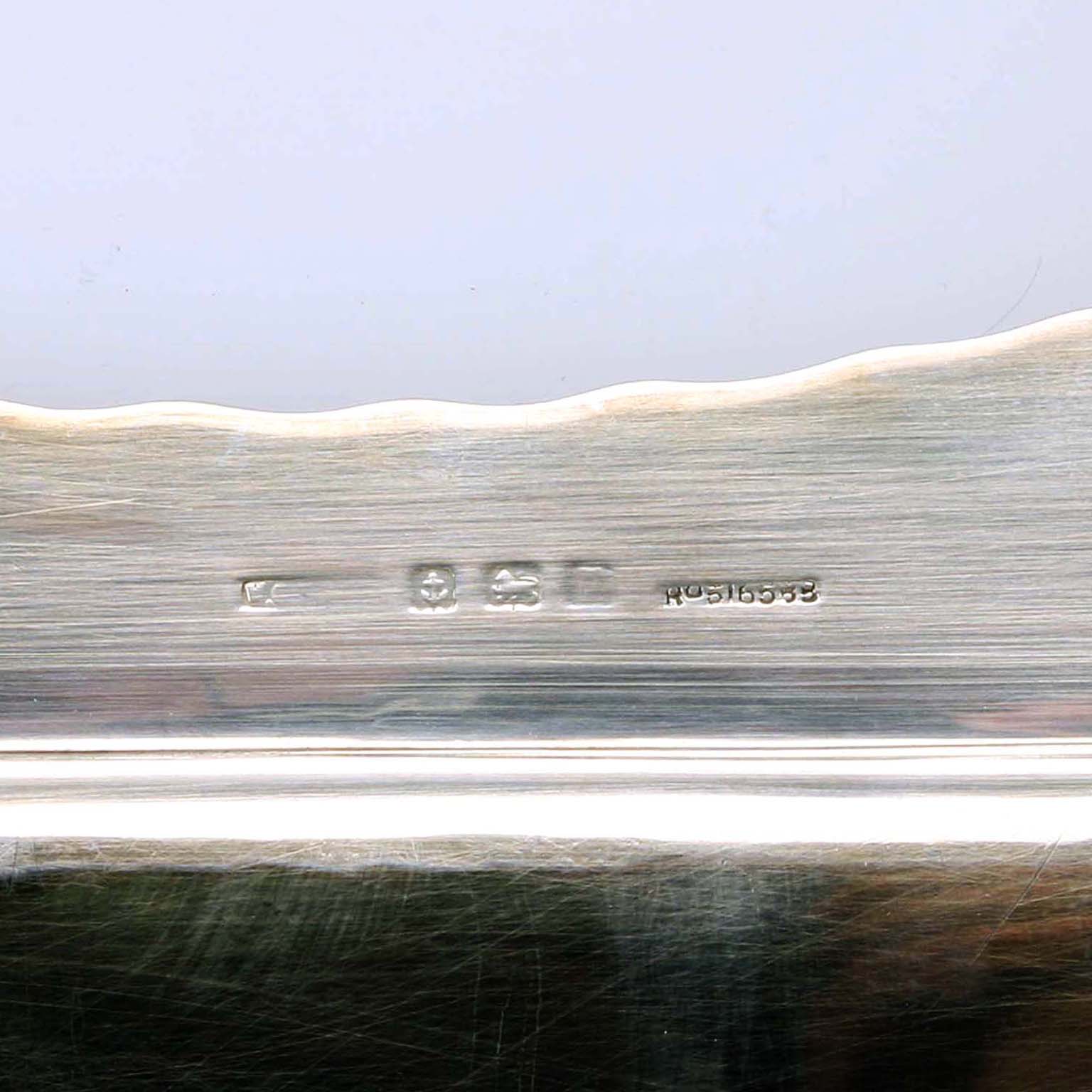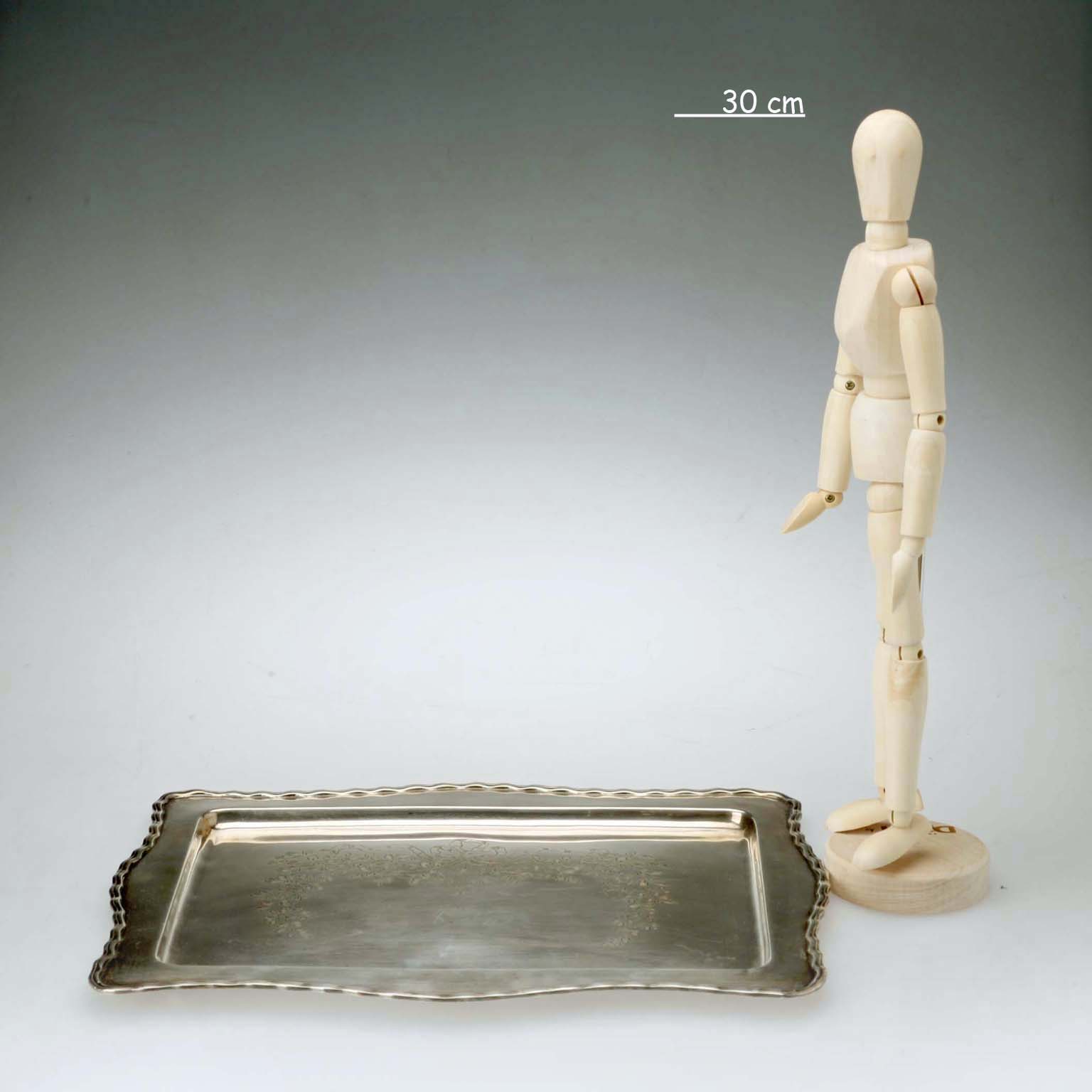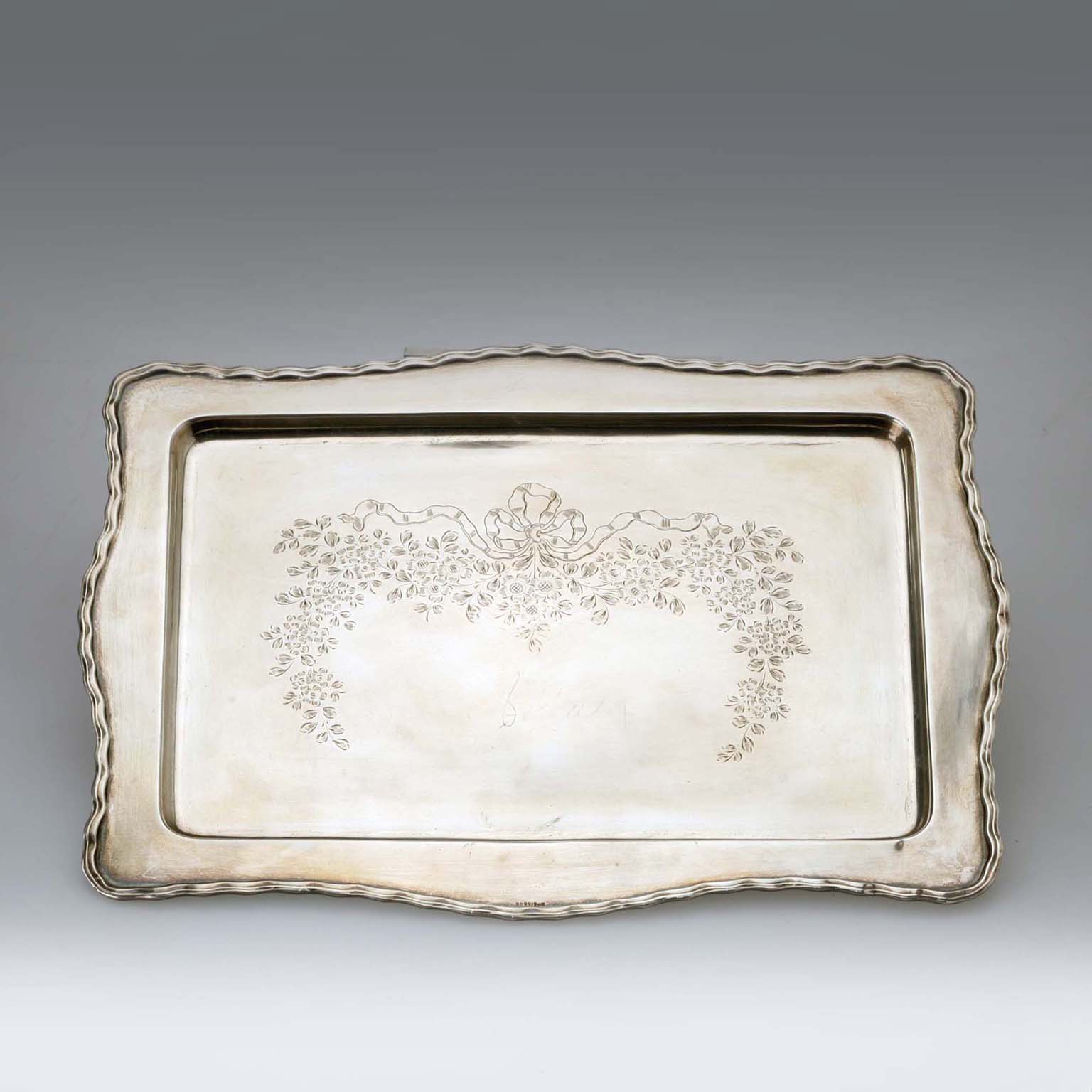Rectangular tray with a wavy edge in 925 silver. The plate is engraved with a garland of flowers and ribbons. Silver hallmarks engraved on the back. Weight 420 grams.