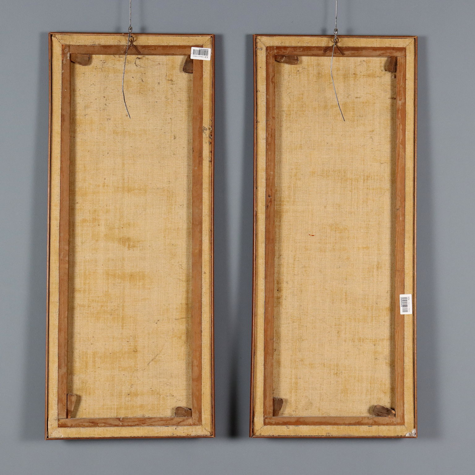 Oil on canvas. Unidentified signature lower right. Decorative panels with various flowers—roses, carnations, violets—scattered freely on a light background. There are several small, scattered losses of color, the background color predominating. Framed with slat frames.