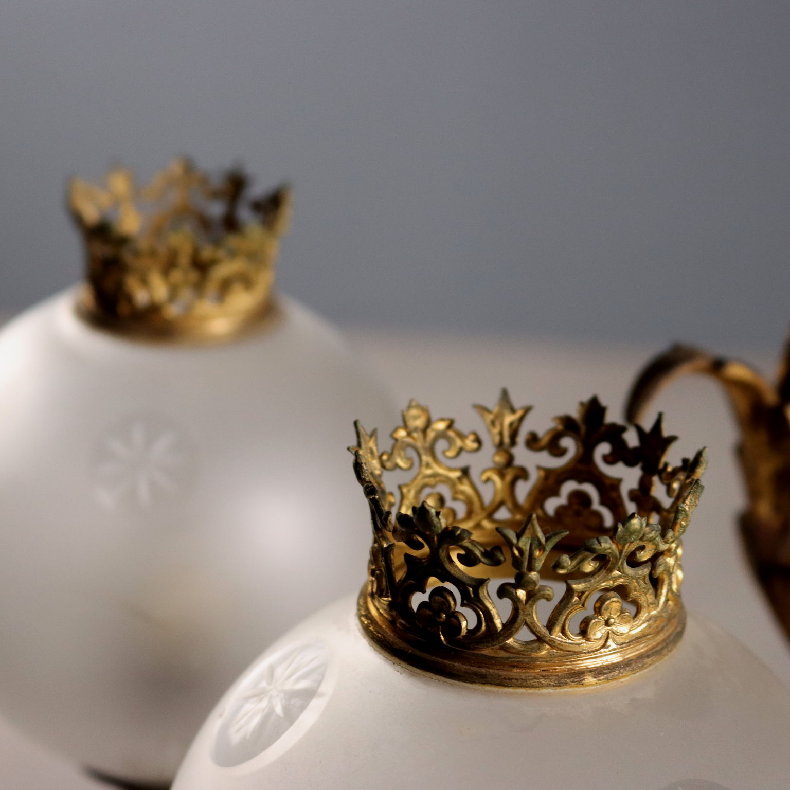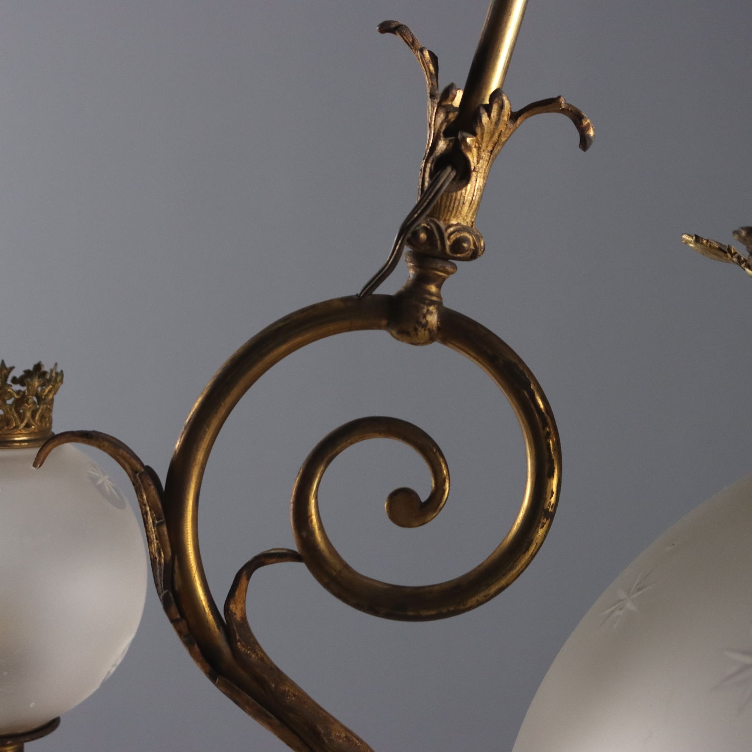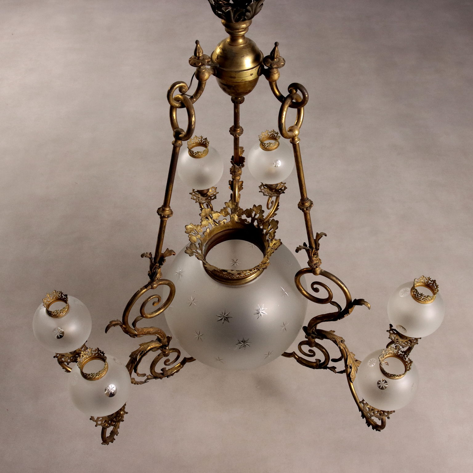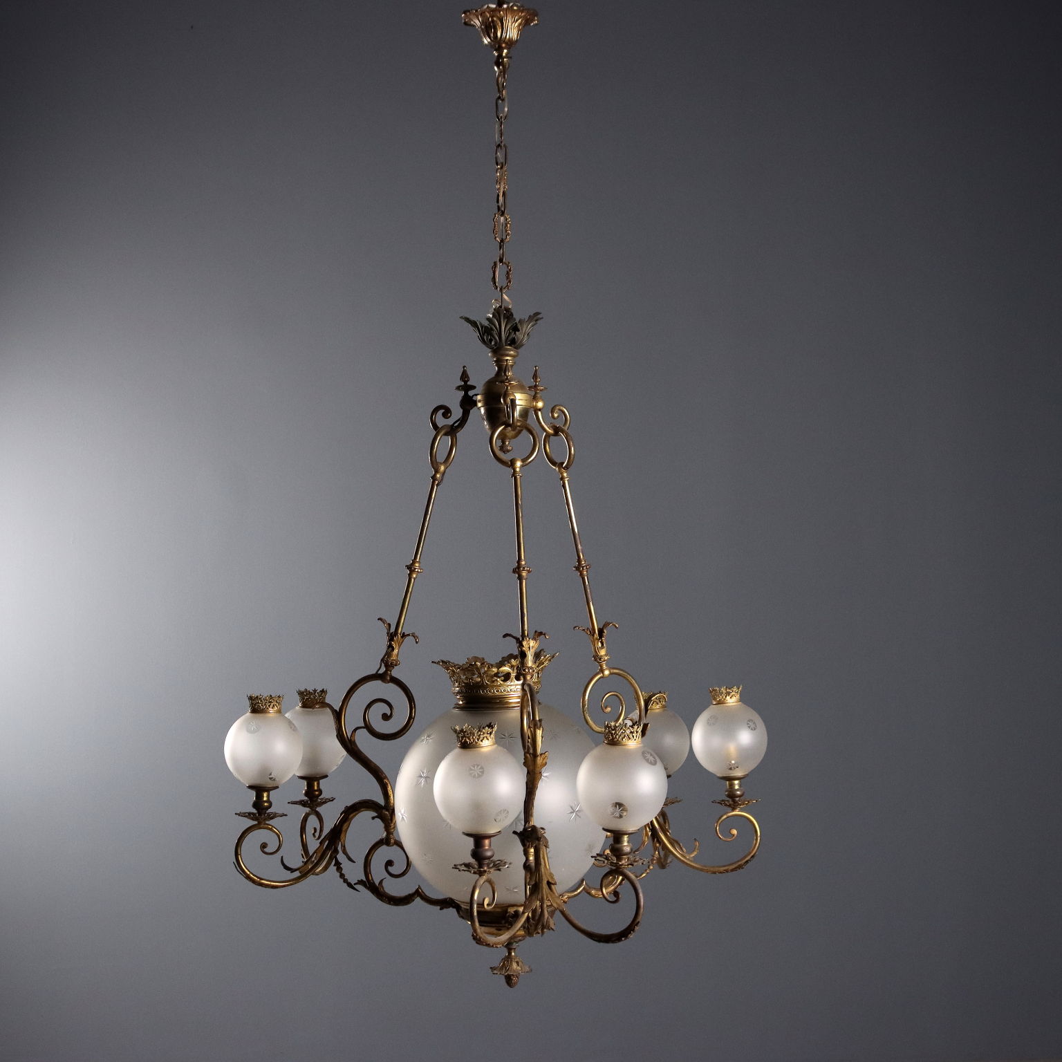 Seven-light chandelier. Gilded bronze structure, decorated with curls and leaves. Three groups of wavy arms support a pair of opaline glass bowls with engraved star details, surmounted by a chiseled bronze crown, as does the large central bowl. Italy, late 19th century.