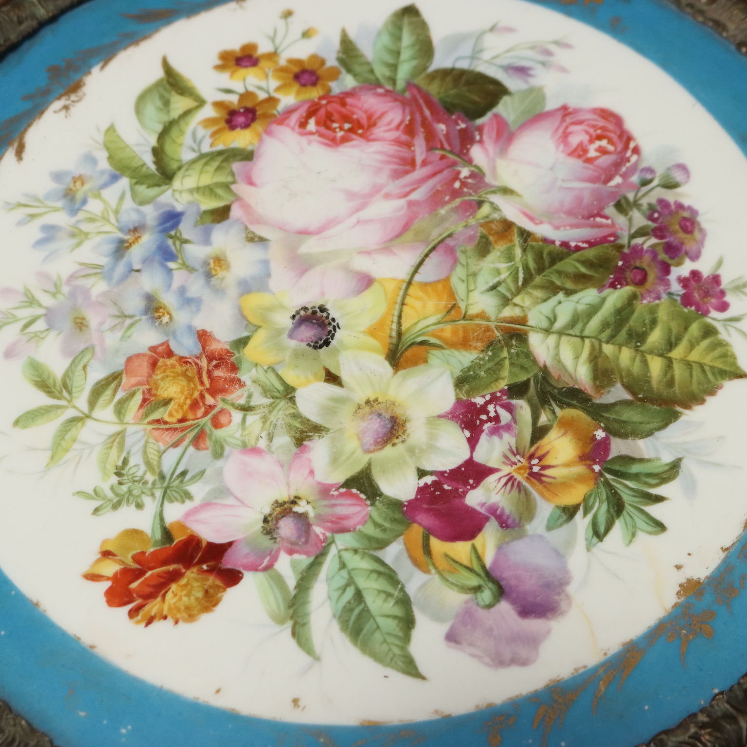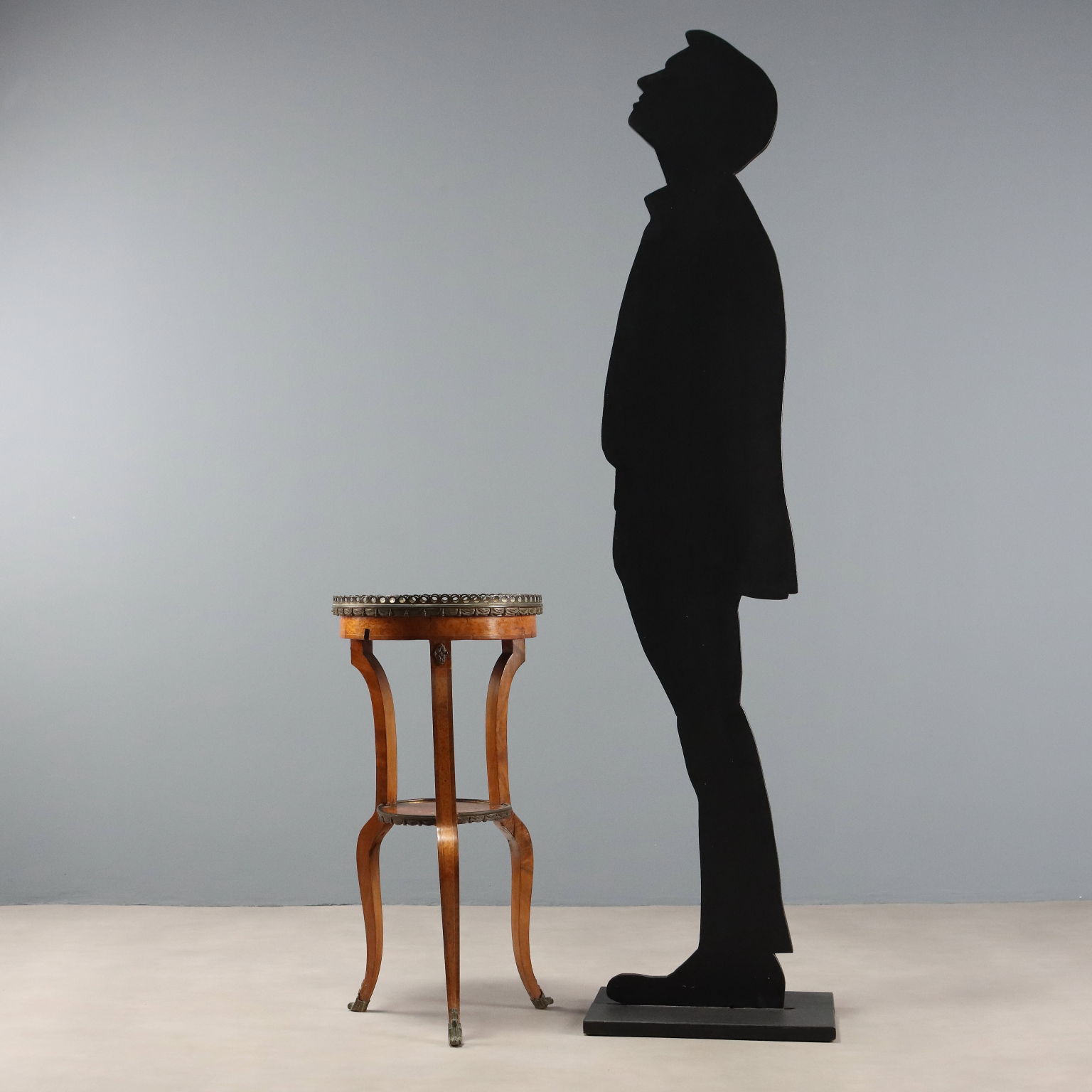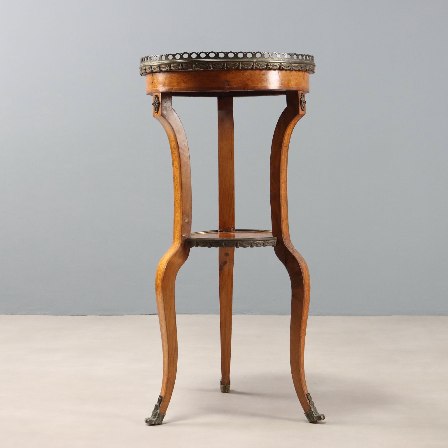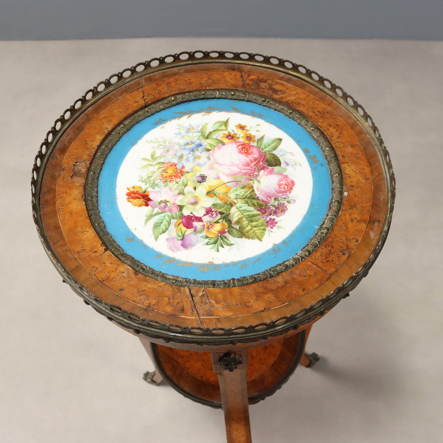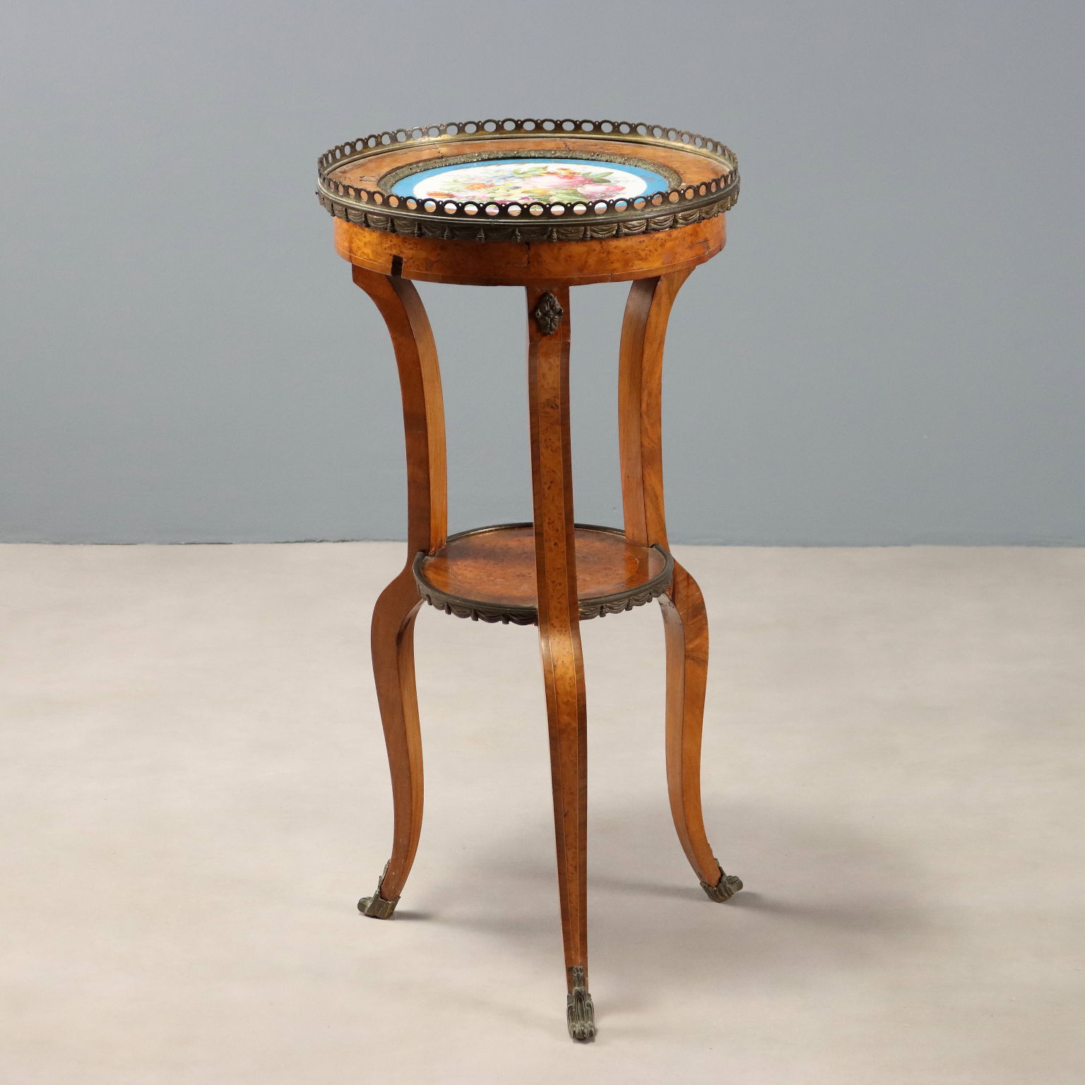 Walnut and maple burl coffee table. The top has a painted ceramic insert, secured by a chiseled and gilded bronze molding, as do the top's balustrade, the frame of the lower table, the inserts, and the feet of the three curved legs. France, 20th century.
