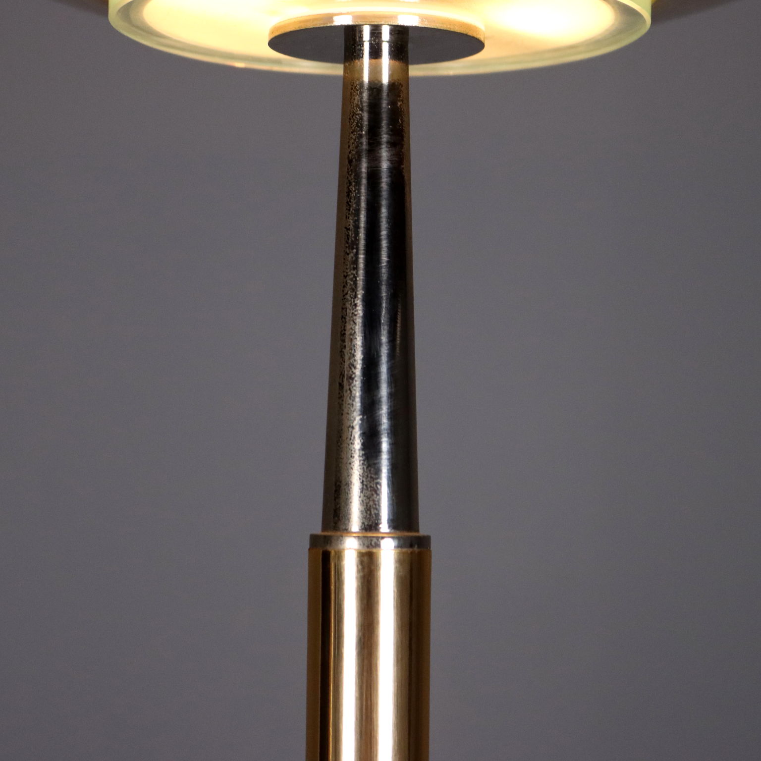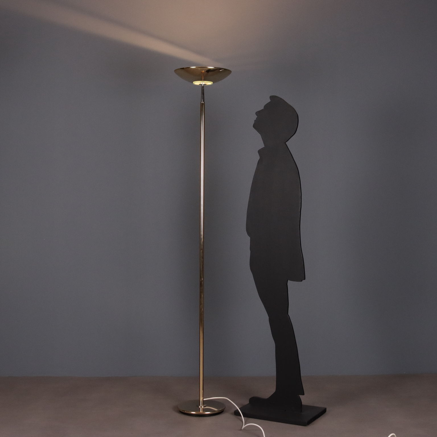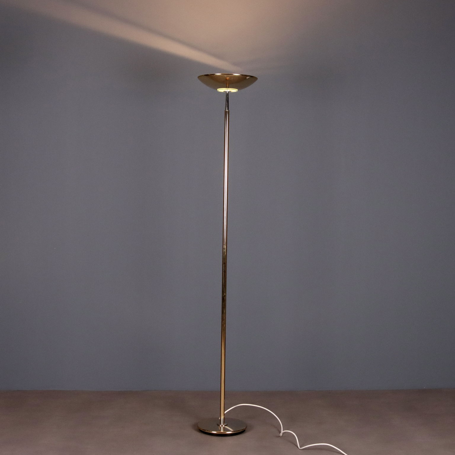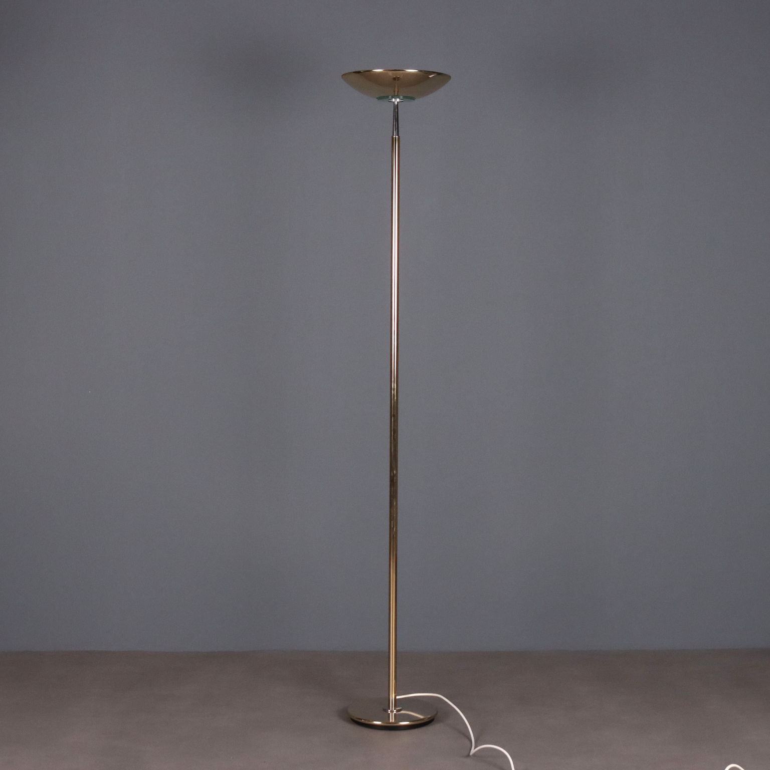 Floor lamp in brass-plated metal with glass and aluminum inserts with dimmable halogen light.