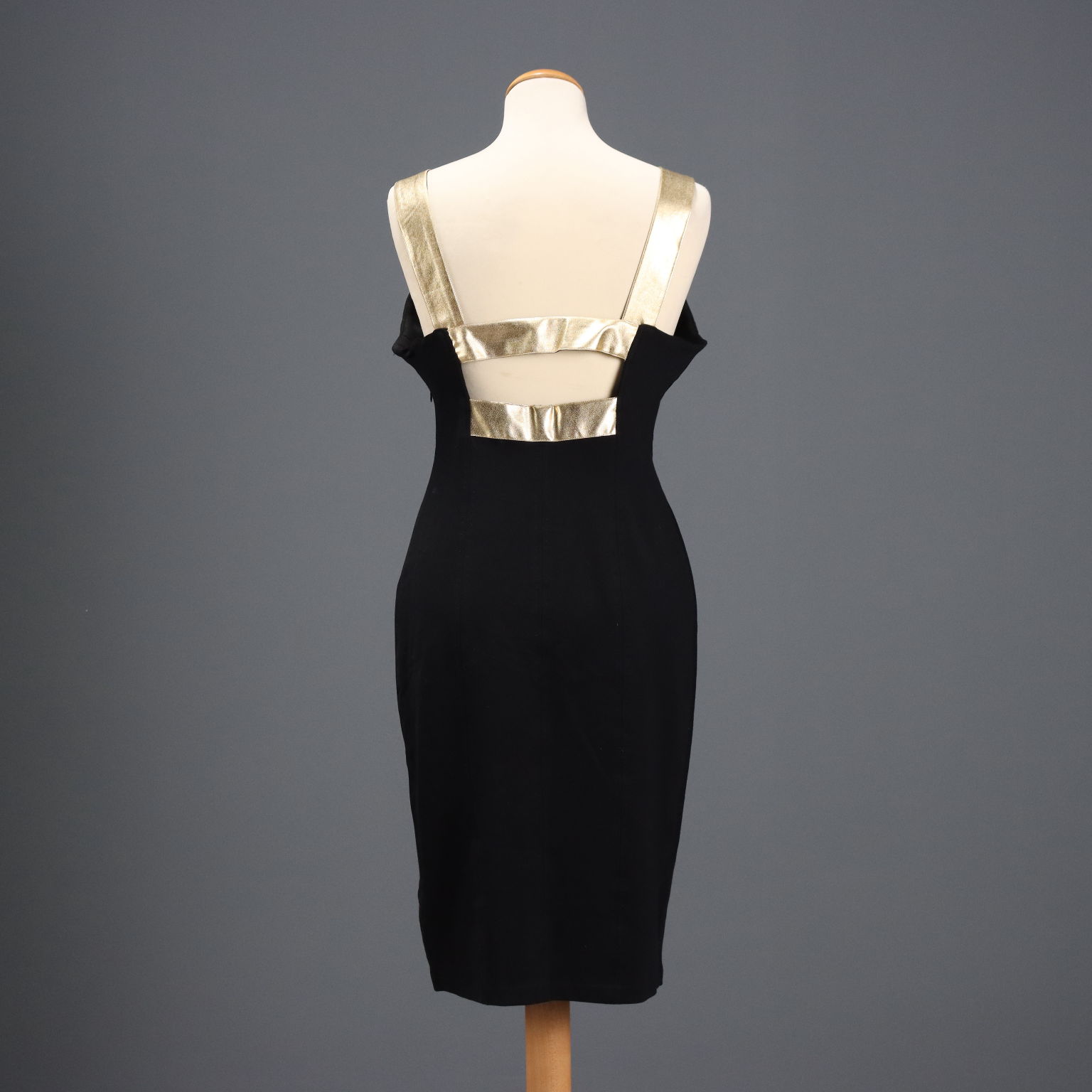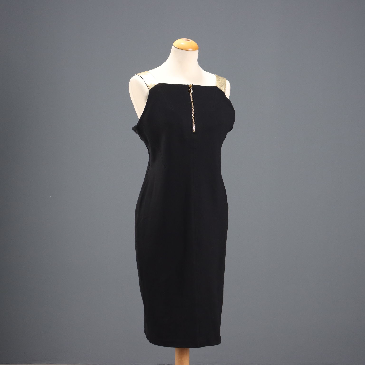 Strappy dress in black stretch fabric with gold details and a zip. In the absence of a size label, we provide some measurements. Length (measured from the zipper opening on the front): 90 cm. Chest: 45 cm.