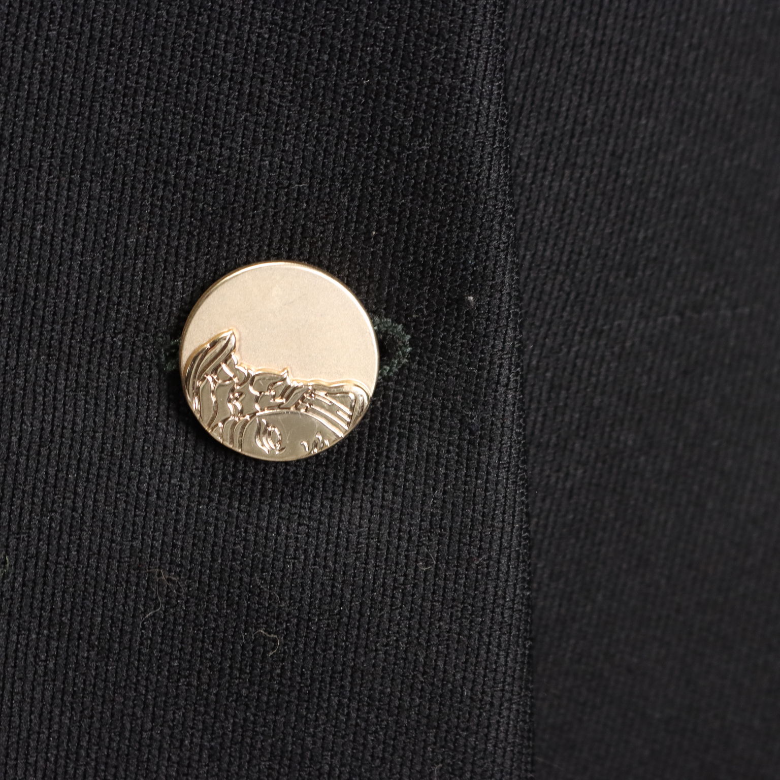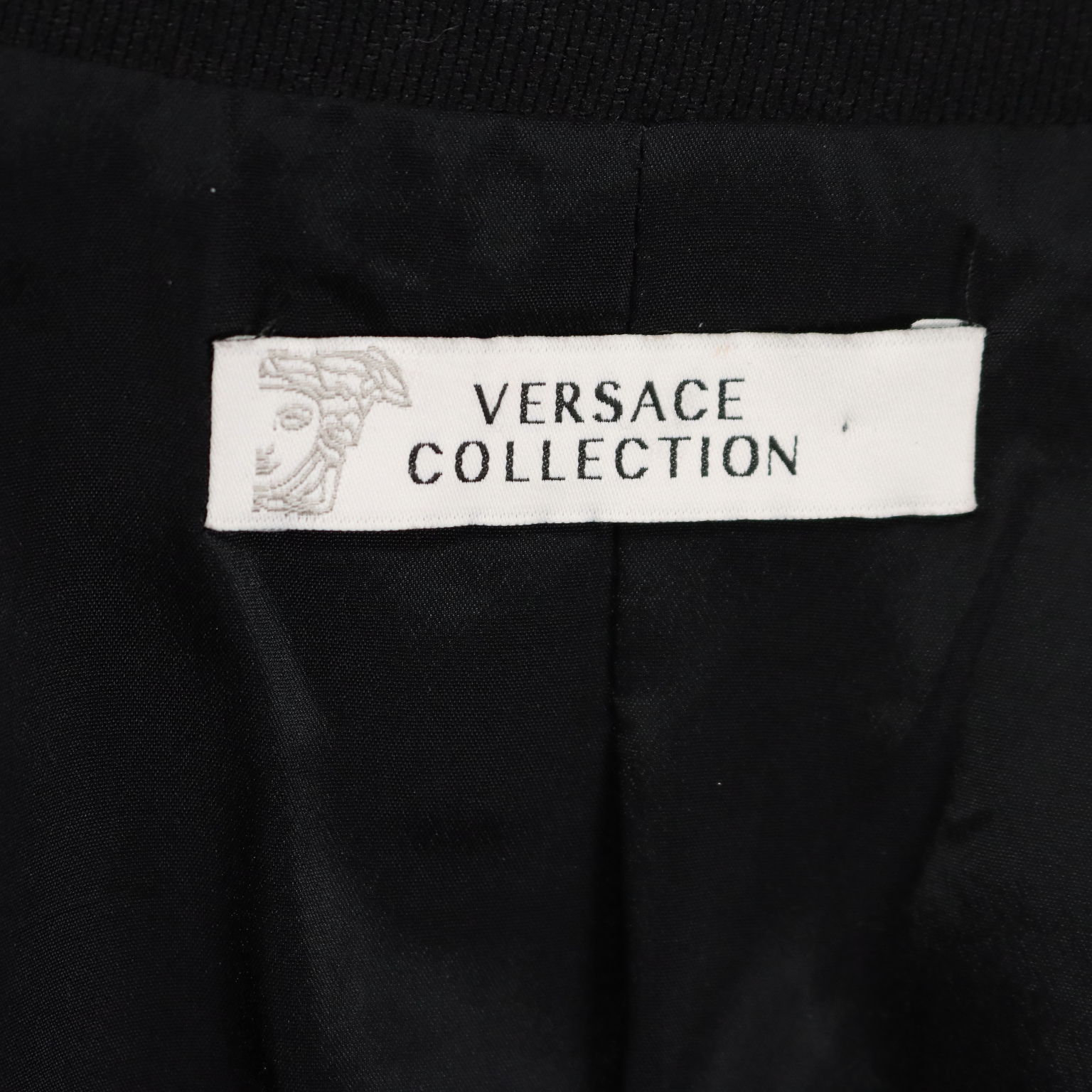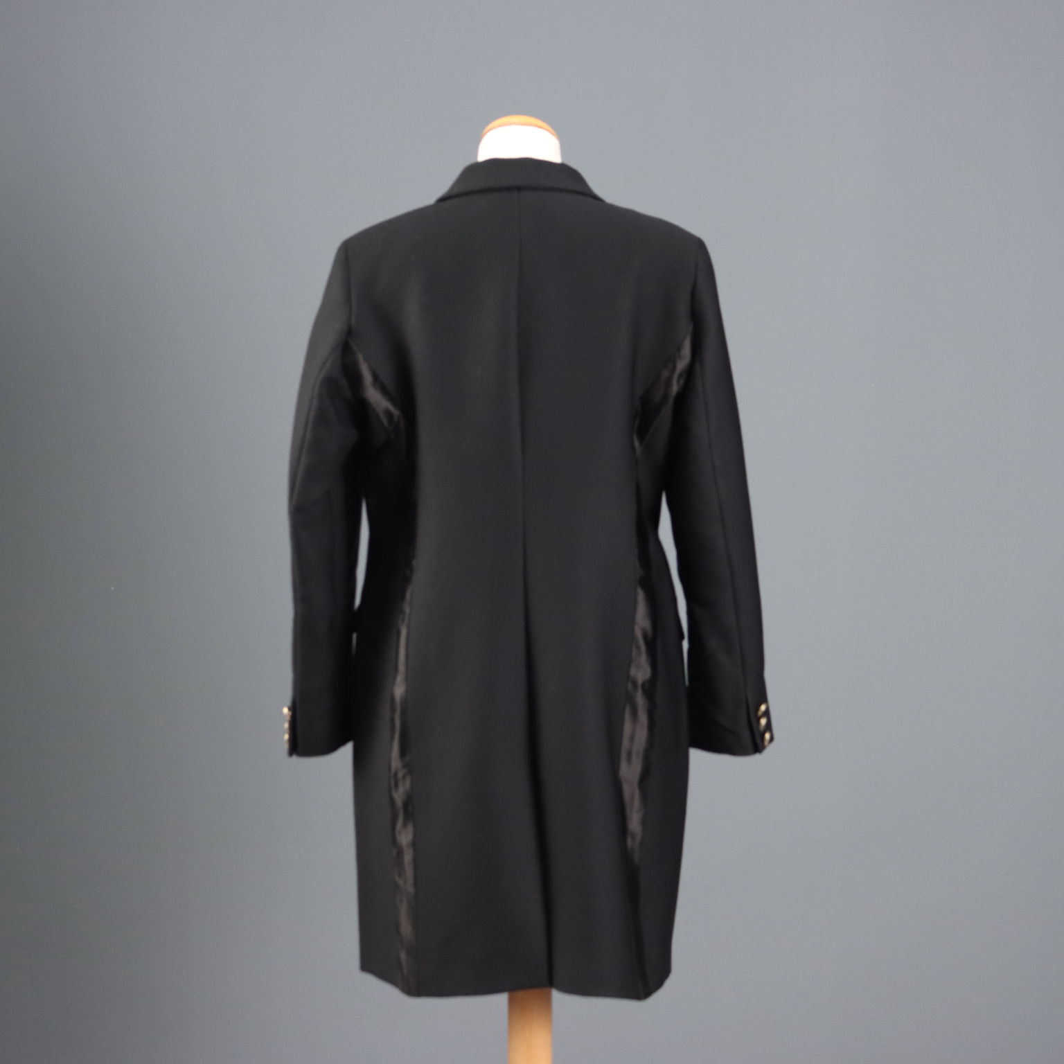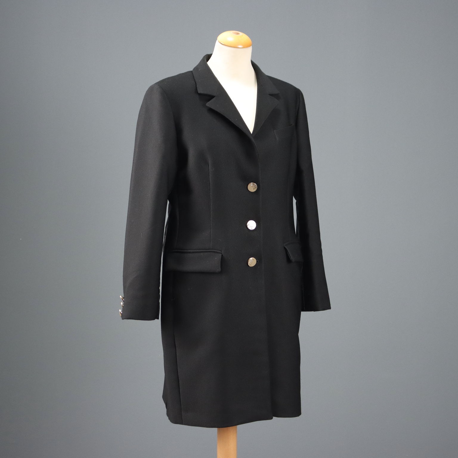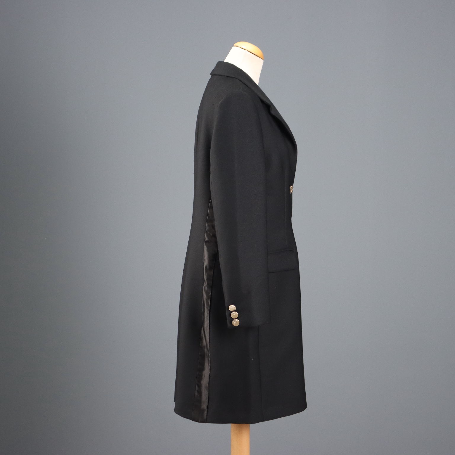 Lined coat with black satin details, single-breasted fastening and two pockets. The gold buttons feature the Maison's Medusa emblem. Length: 89 cm. Shoulder width: 42 cm. Sleeve length: 58 cm. Armhole: 50 cm.