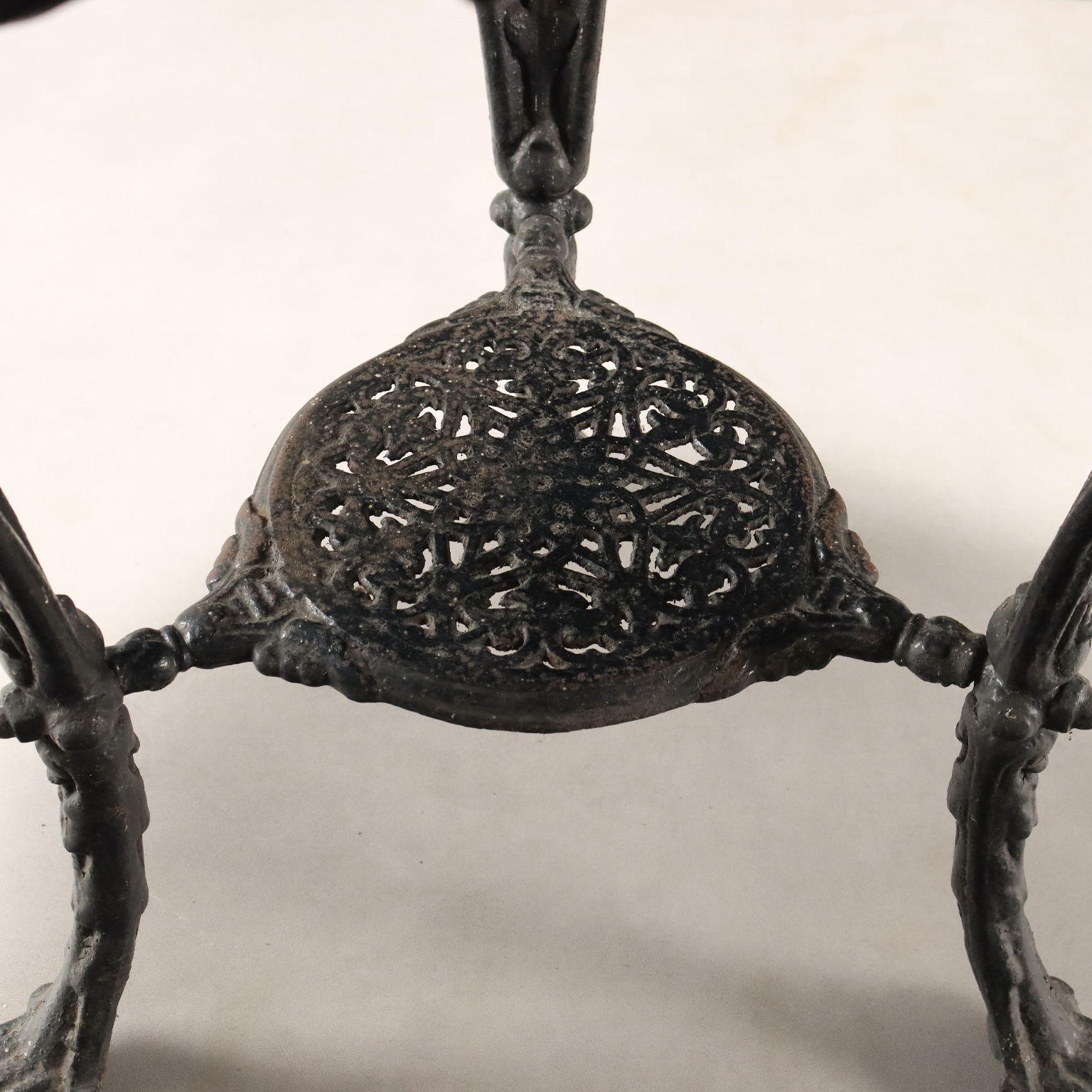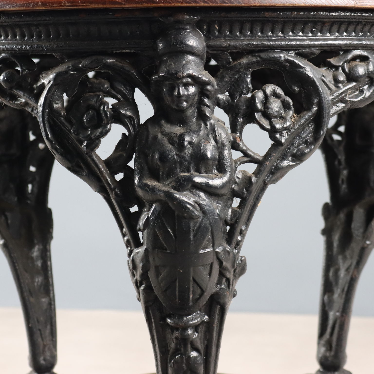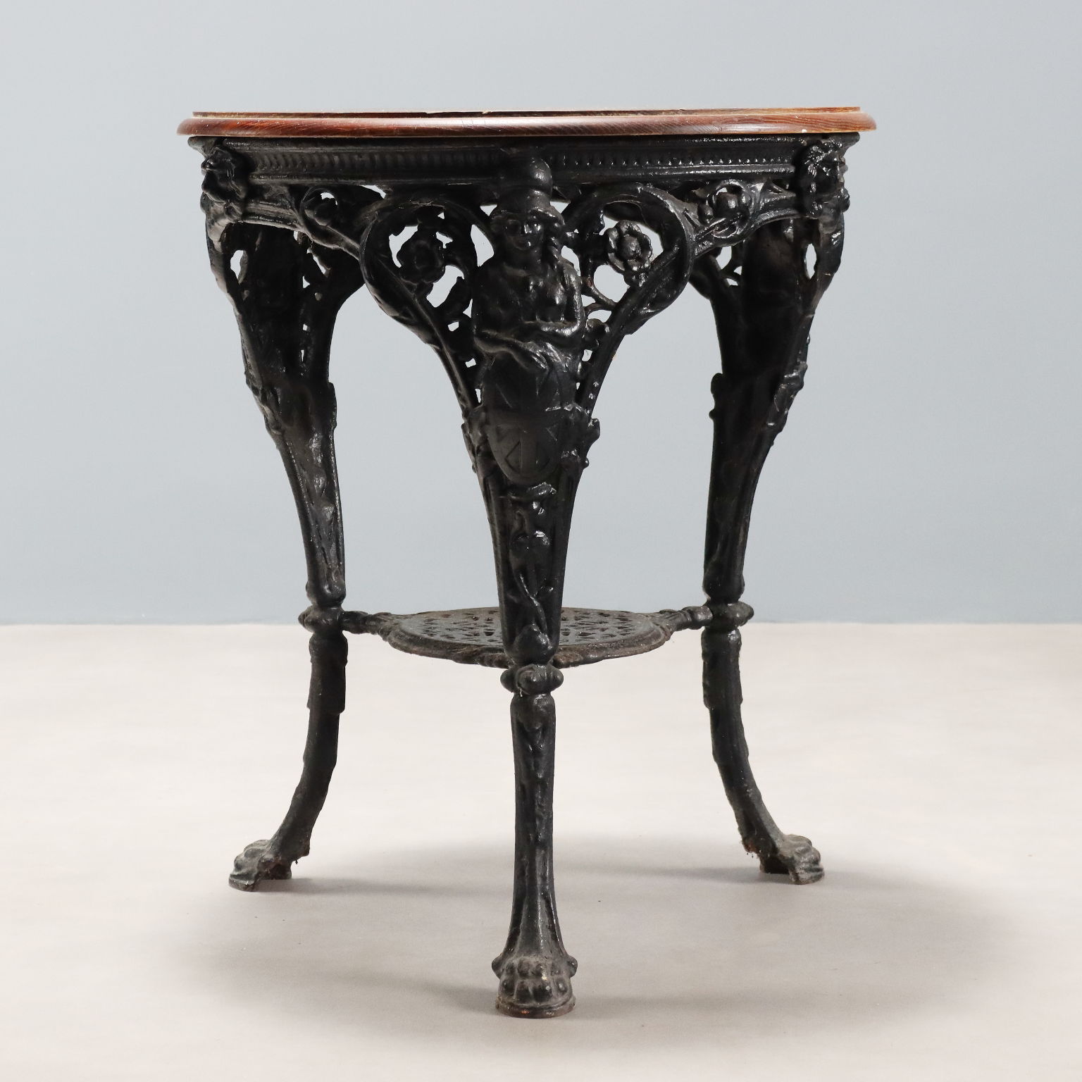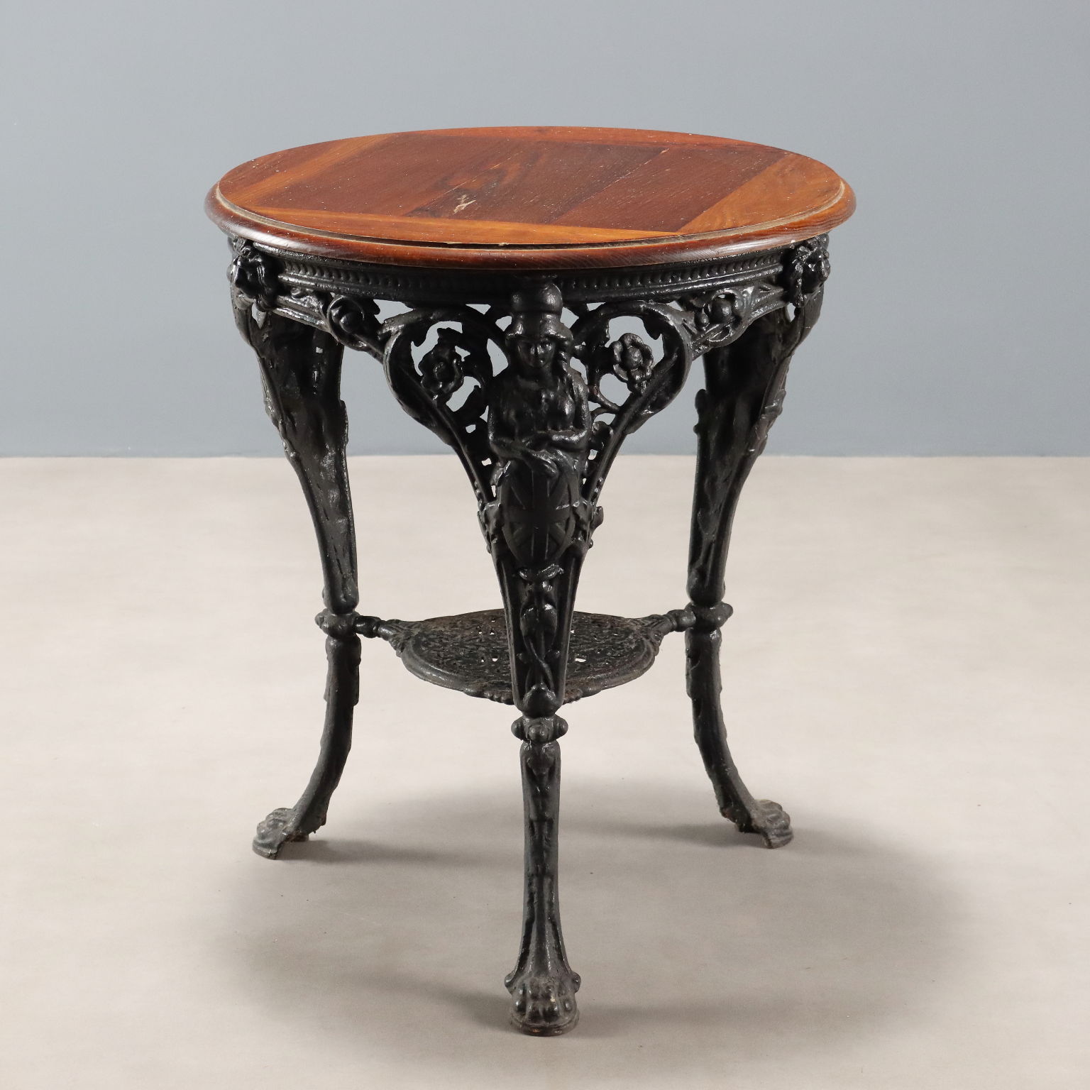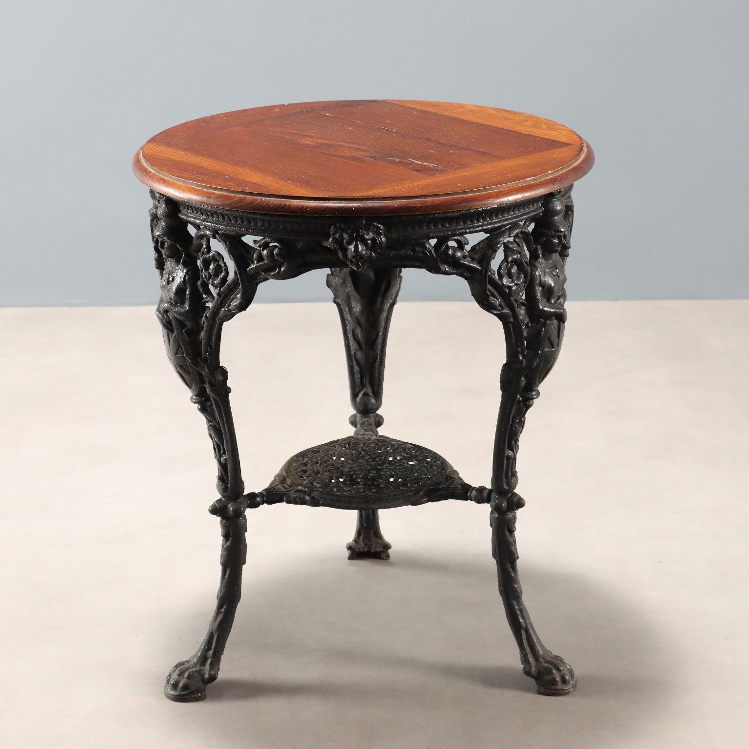 Cast iron coffee table. Round oak top supported by three curved legs joined by under-top aprons and a lower shelf. Neoclassical workmanship.