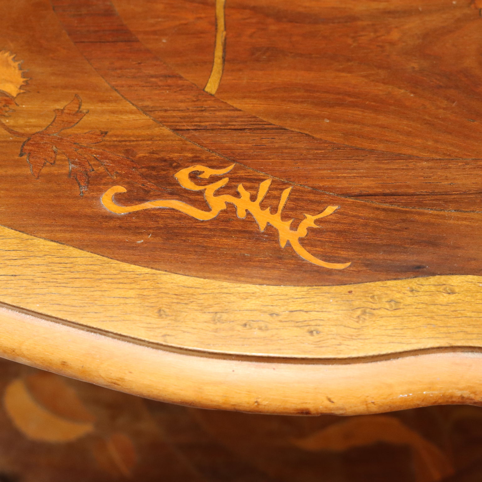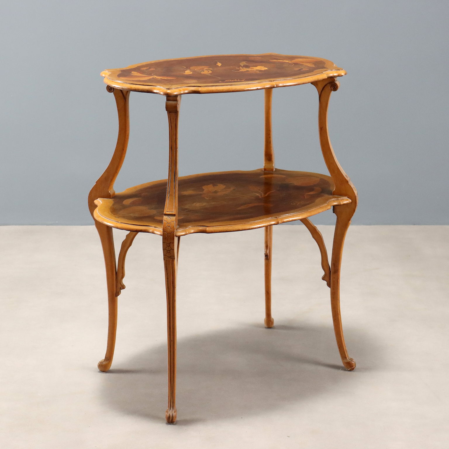 Art Nouveau beech etagere. Biscuit shelves inlaid with floral and leaf motifs in various woods, supported by four curved, carved legs. Italy, early 20th century.