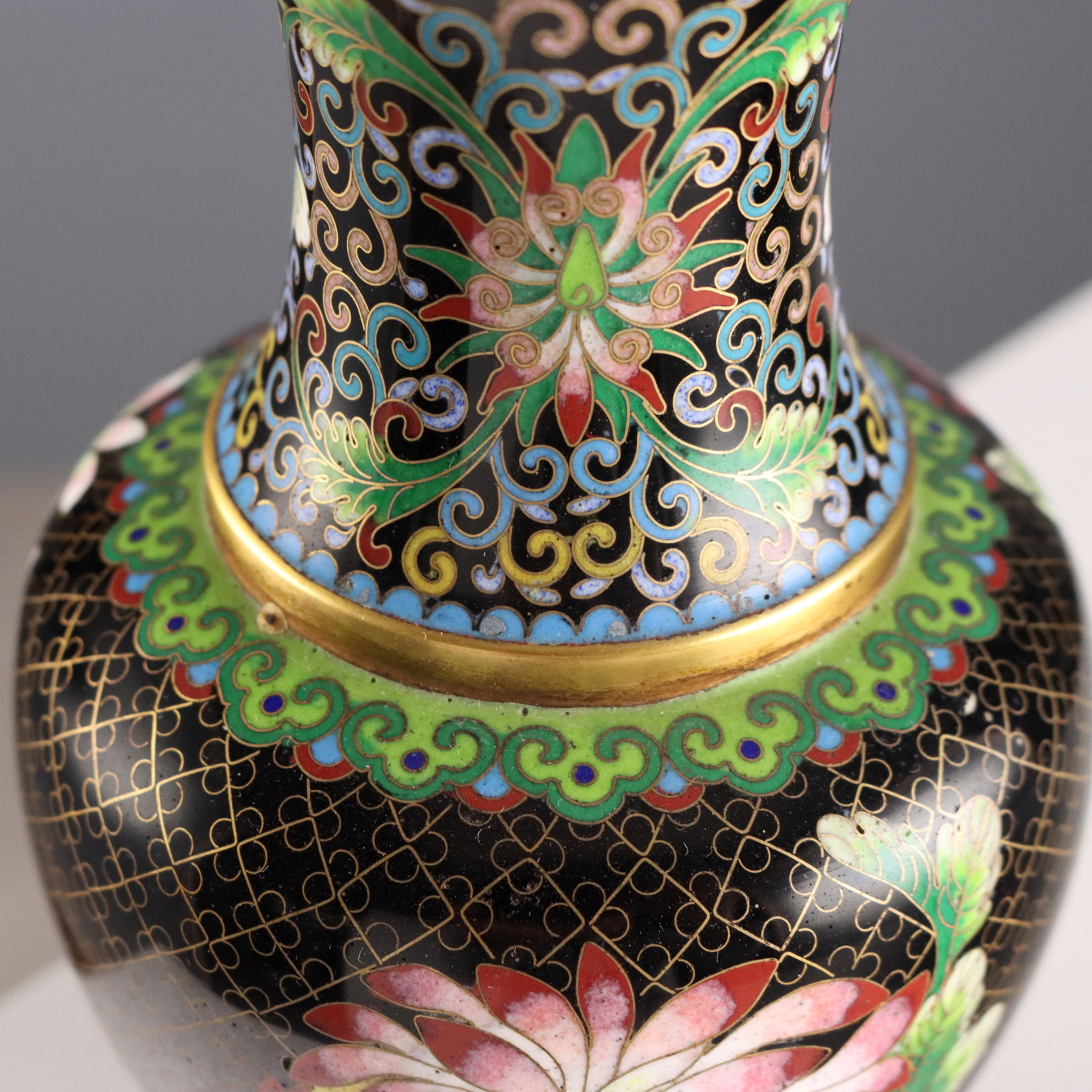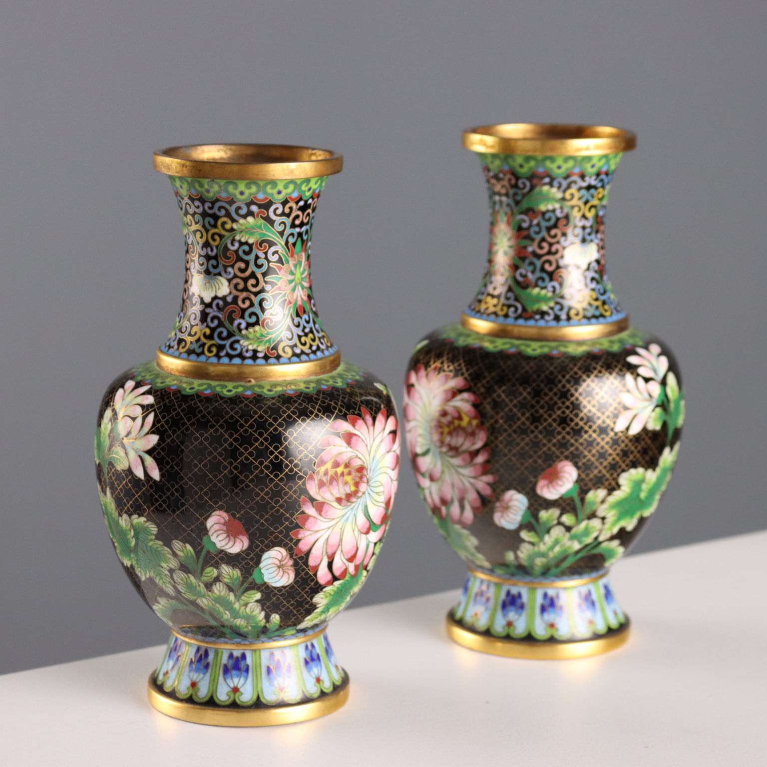 Pair of cloisonné vases decorated with peonies on a black background and gold in the central band, vegetal motifs and repeated on the base and neck.