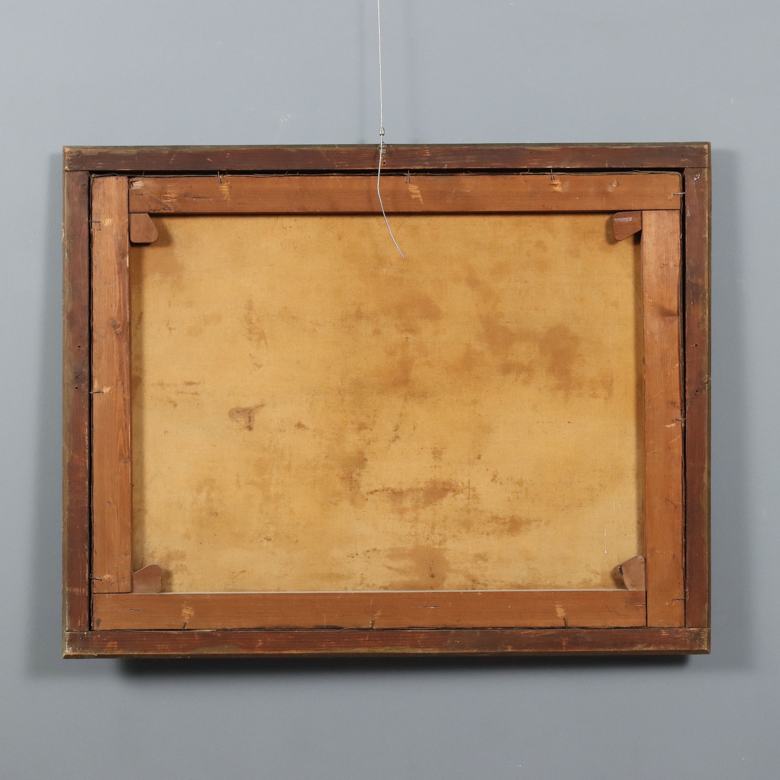 Oil on canvas. Country landscape featuring a small stream, boats traversing it, and flanked by small clusters of rural homes. In the foreground, a woman and her child are walking along the path. The work shows traces of previous restoration and relining. Dirt stains. It is presented in a contemporary antique frame.