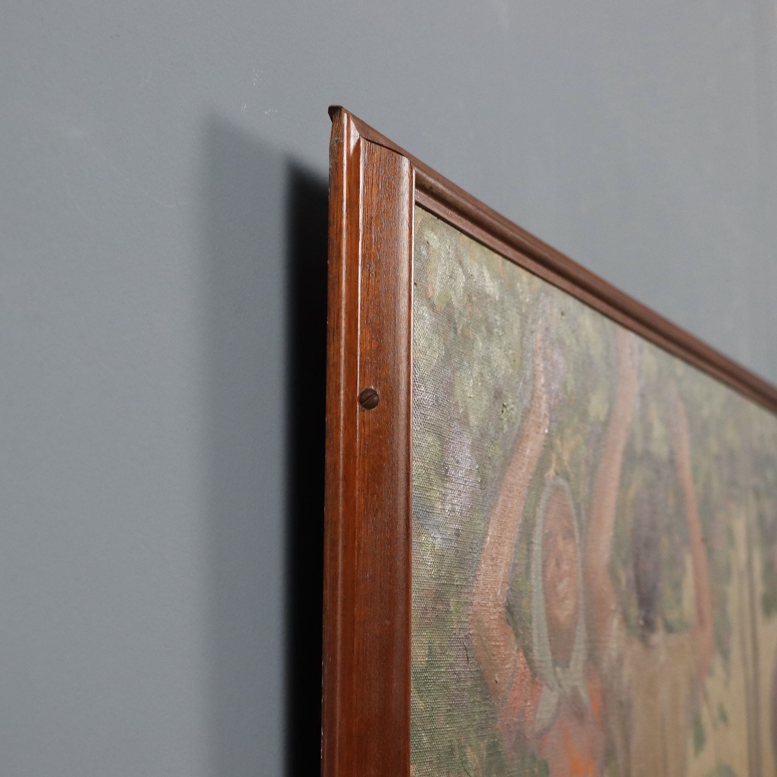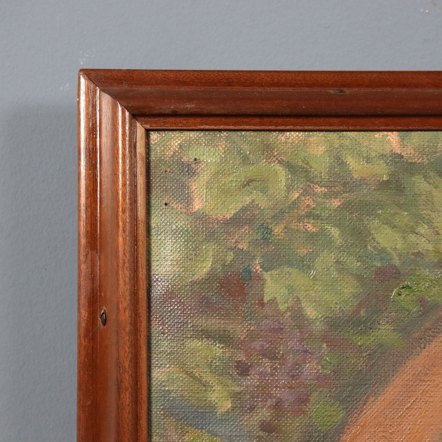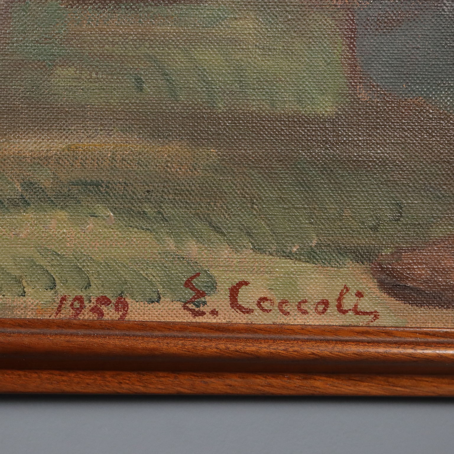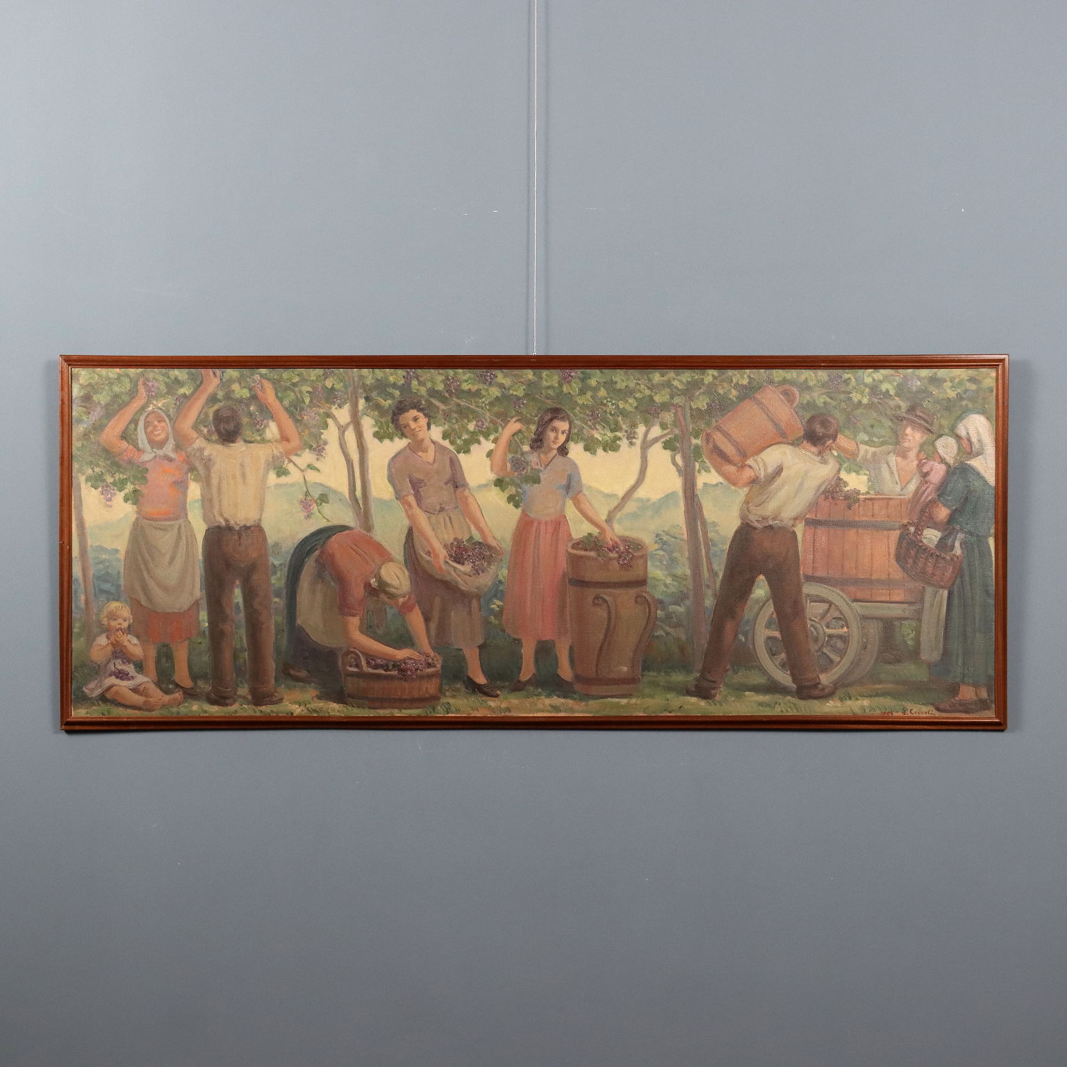 Oil on canvas. Signed and dated lower right. The Brescian artist Eliodoro Coccoli "was not by vocation an easel painter," but rather established himself primarily as an interior and exterior decorator, creating secular frescoes for various Lombard villas and sacred subjects for numerous churches. His canvases are very few, and mostly date from before 1922, the year in which his decorative production greatly expanded, but numerous sketches and several preparatory canvases for frescoes remain. This grape harvest scene may also be part of this type of production, although it is defined and detailed in its details. Coccoli's style cannot be traced to any particular movement; indeed, he is considered an expert in eclecticism: he selects the figurative repertoire best suited to the client's needs, adapting his style to the subject and the architectural characteristics of the location. Furthermore, it demonstrates a refined, at times virtuosic, technical expertise. The work is presented in a frame.