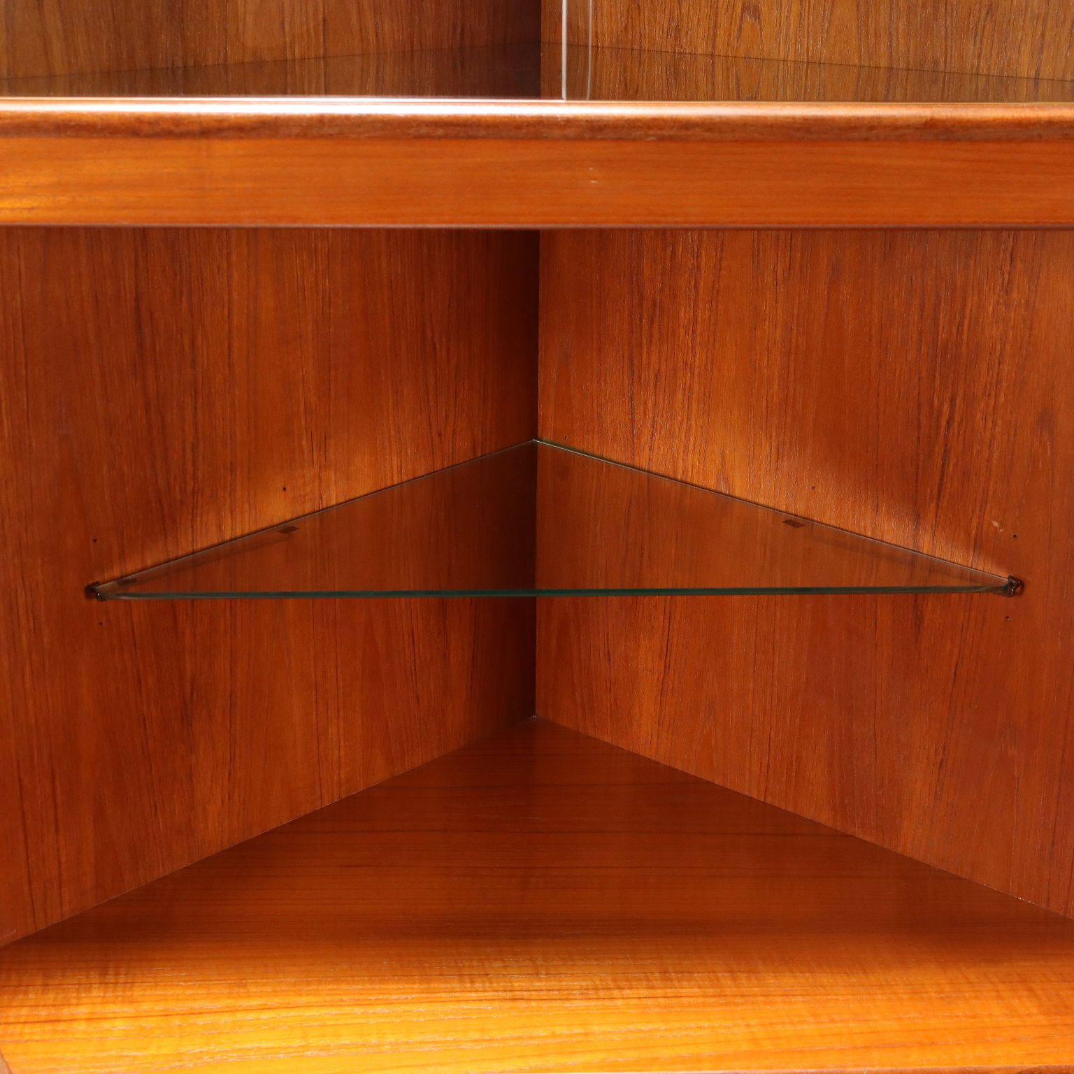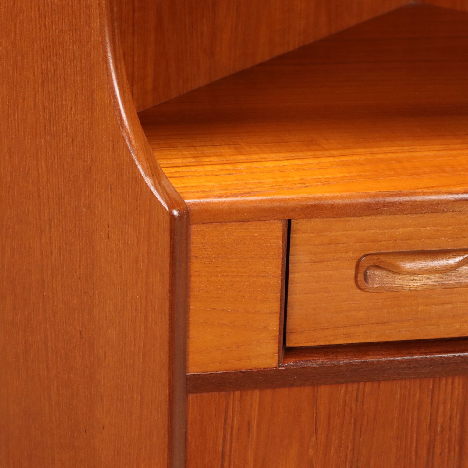 Vintage corner cabinet with open compartments, drawers, and hinged doors. In good overall condition with some signs of wear, made of teak veneer.