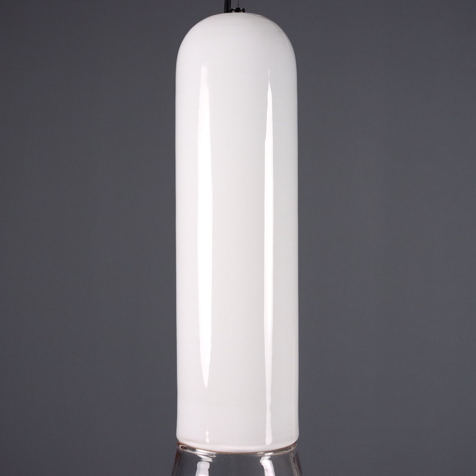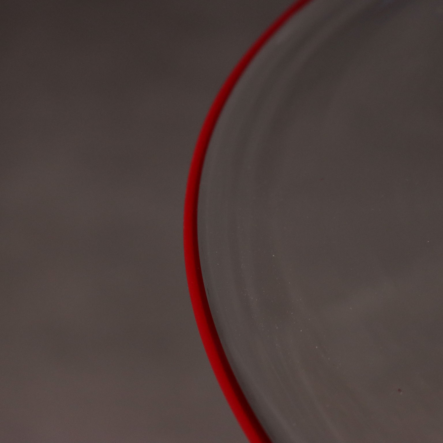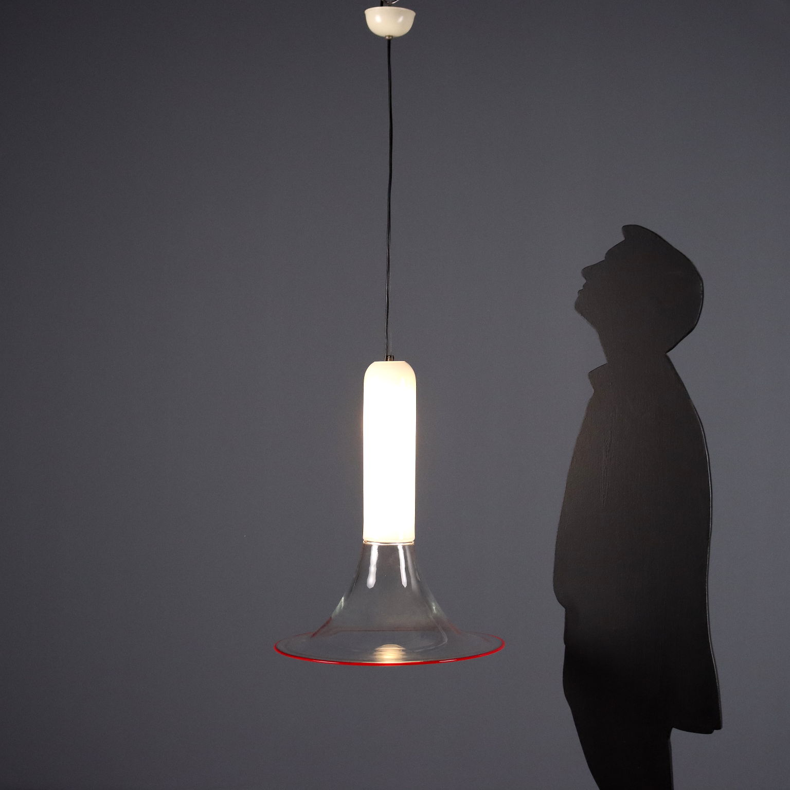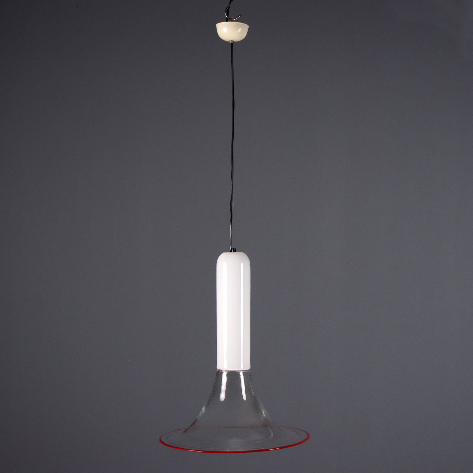 Ceiling lamp in white and transparent Murano glass with red edge.