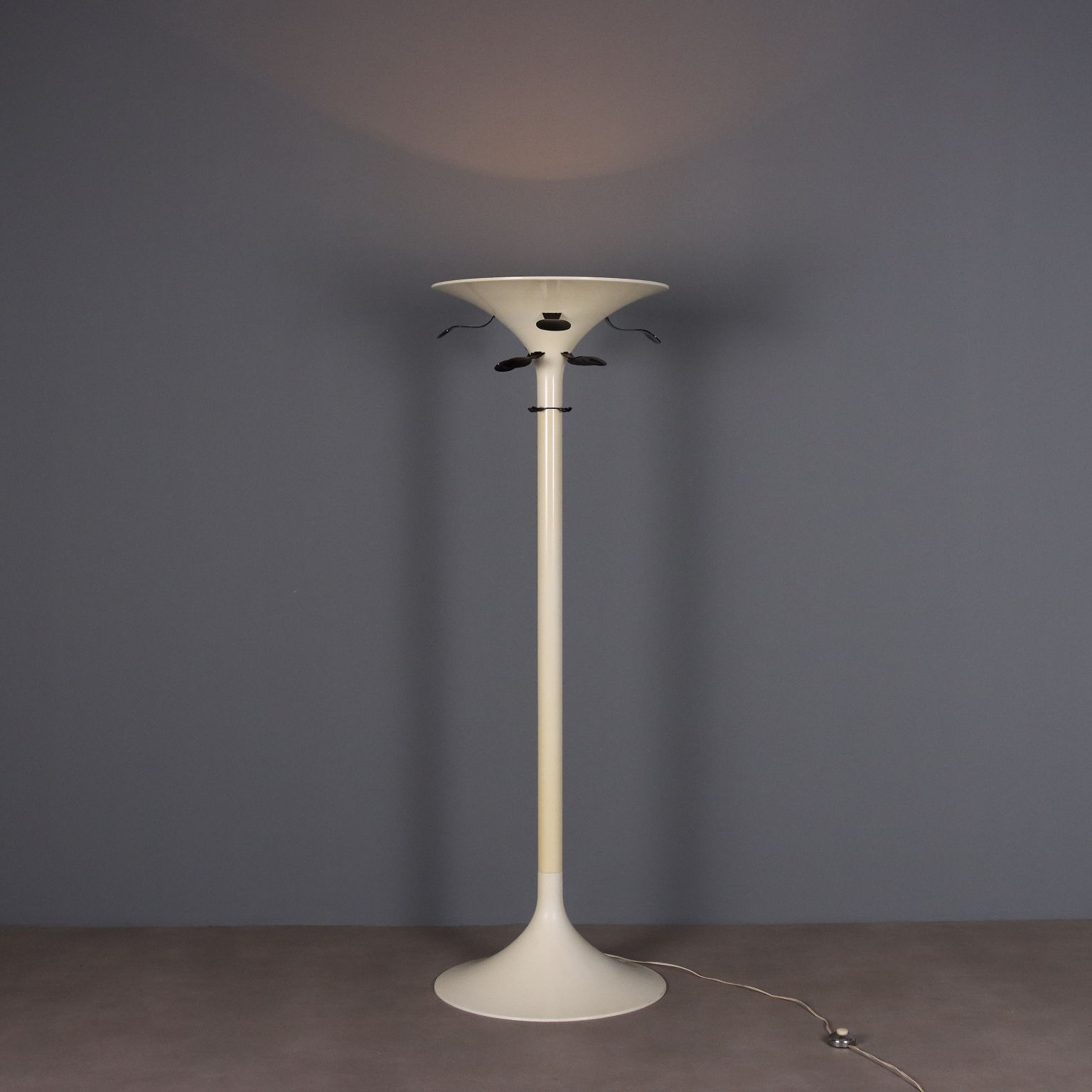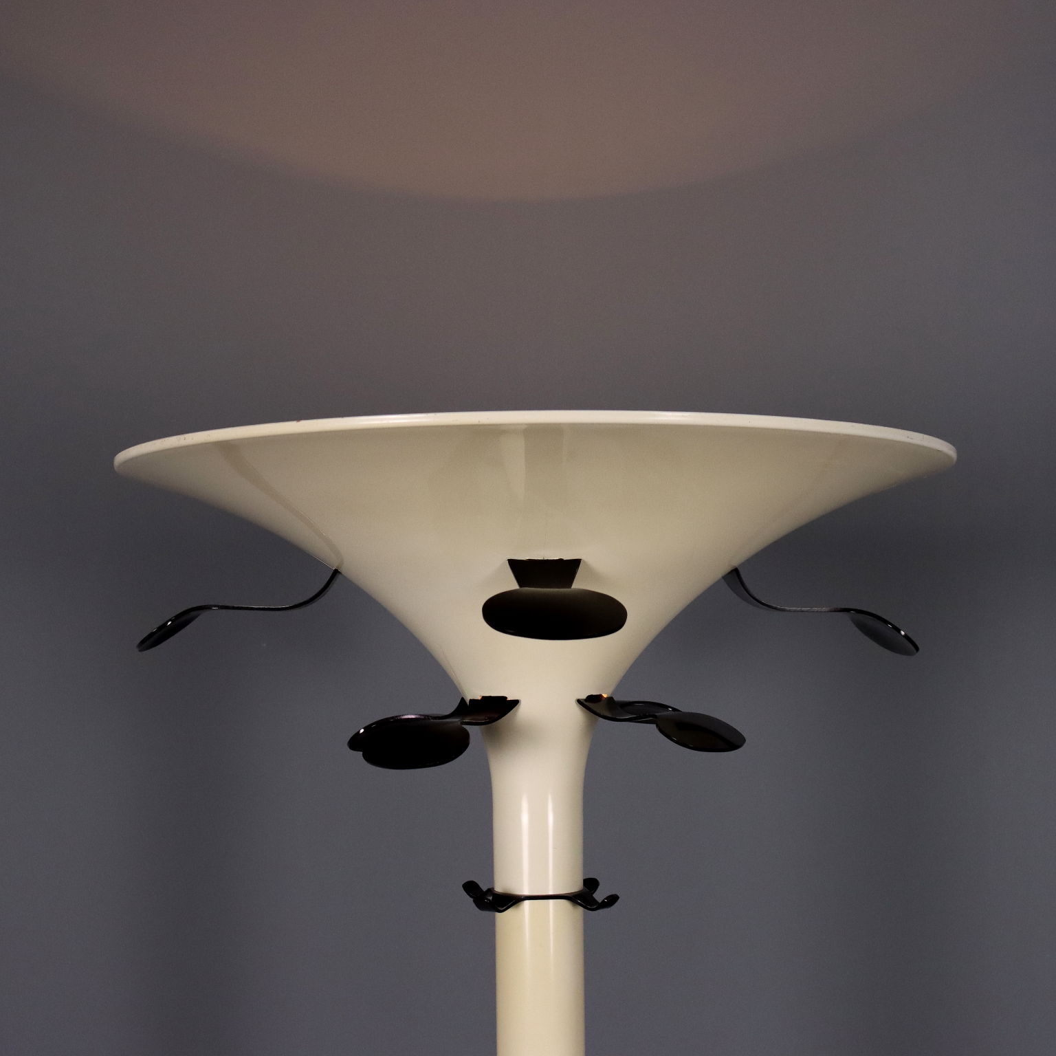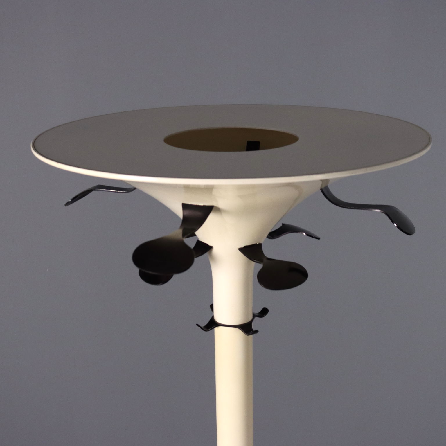 Floor lamp with coat rack in plastic and white lacquered metal.