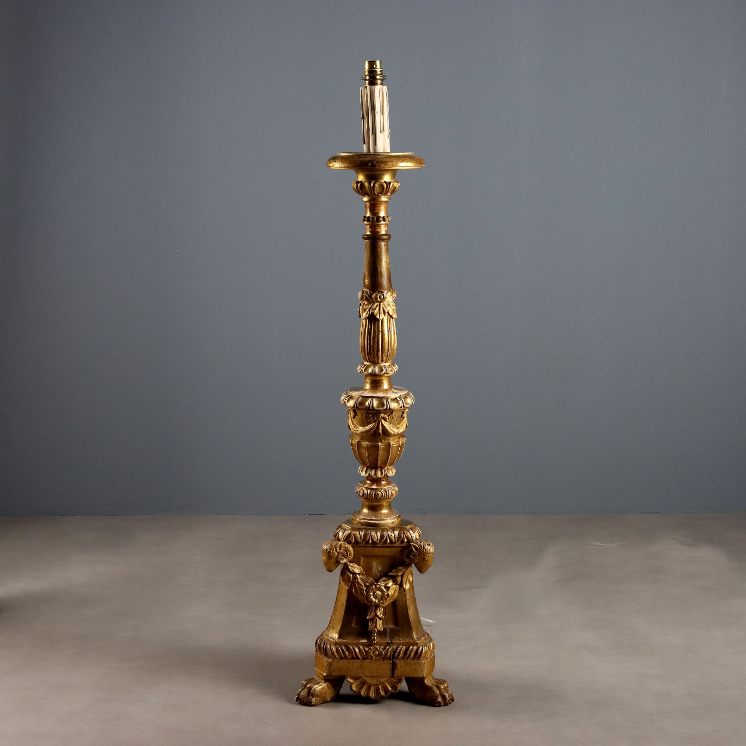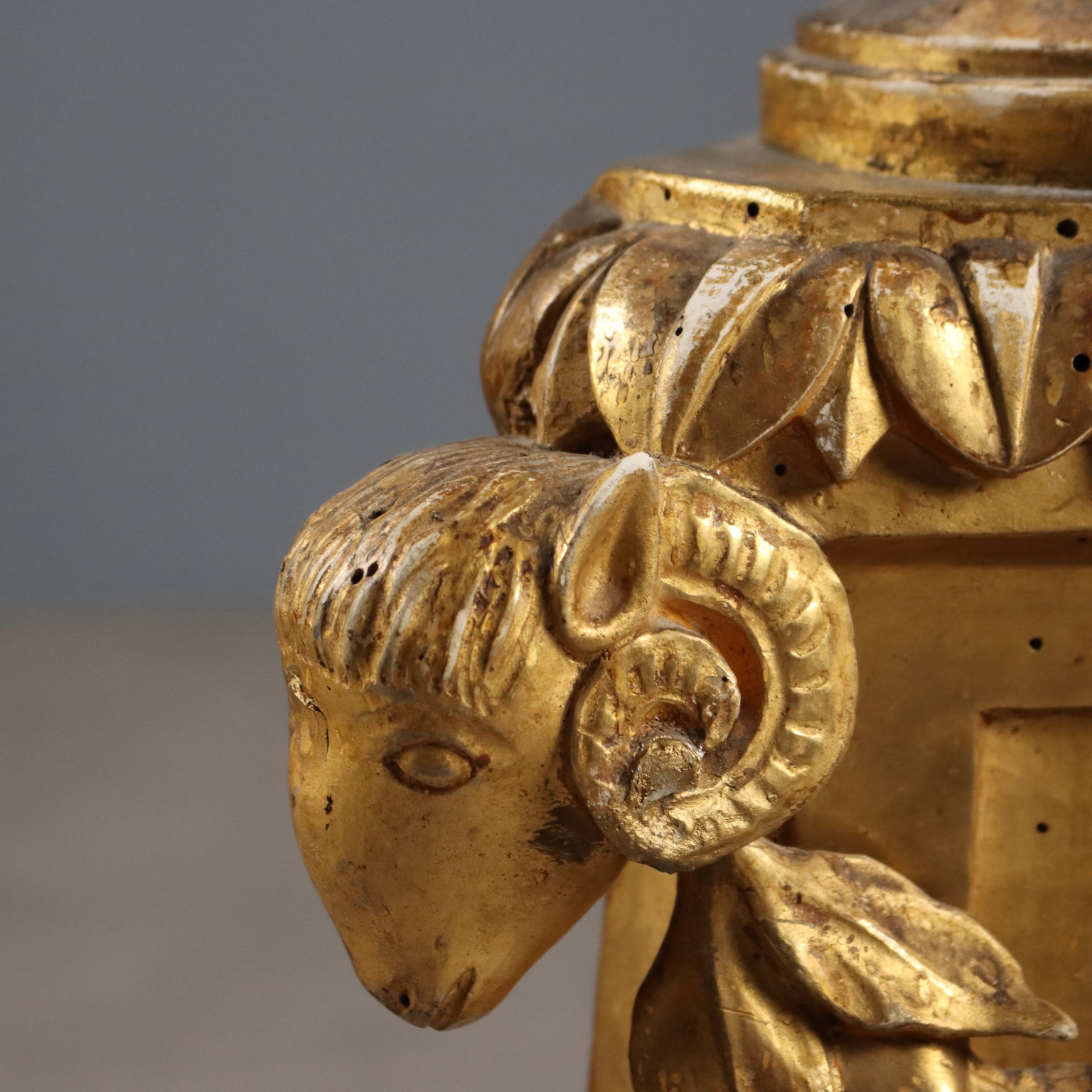 Carved and gilded wooden torch holder. Floral and leaf carvings, festoons, and goat heads. Three feral feet. Italy, mid-19th century.