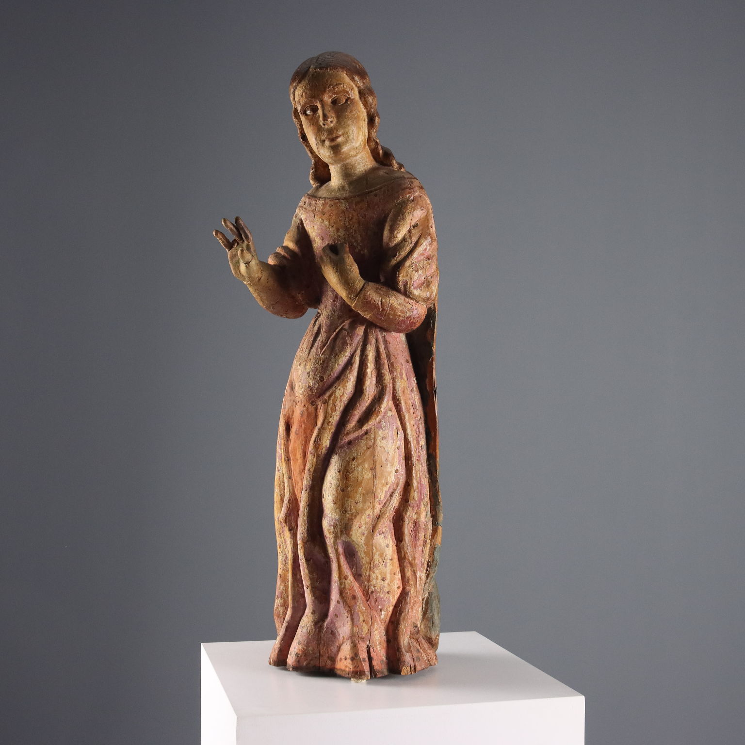 This sculpture represents part of the depiction of the scene of the Virgin's education, which traditionally features Saint Anne seated with a book in her lap, while the young Mary stands beside her, intent on learning. In this case, the statue depicts the young Virgin, the rest of the composition missing. The young woman is depicted with one hand raised and the other at her breast, as if to announce the act of blessing along with the divine motherhood that will characterize her life. She wears a long red dress covered by a blue cloak.