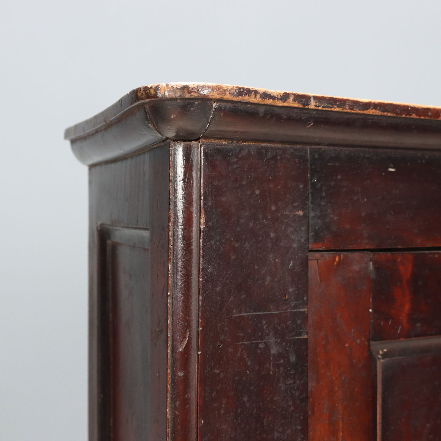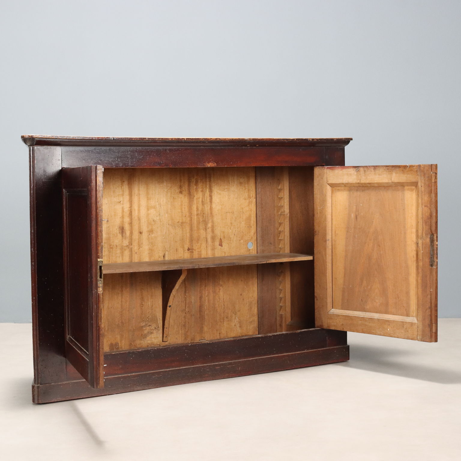 A rounded sideboard for under-window storage. Made of walnut in the mid-19th century with a poplar back, it features two simple framed doors.