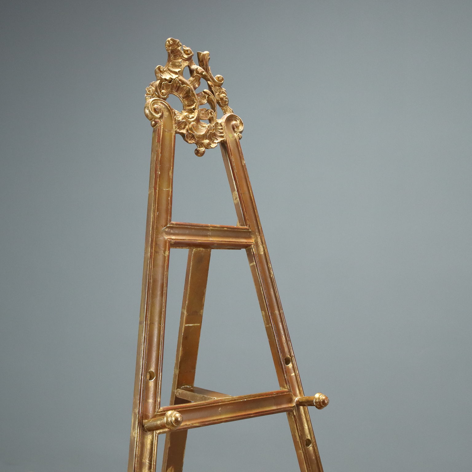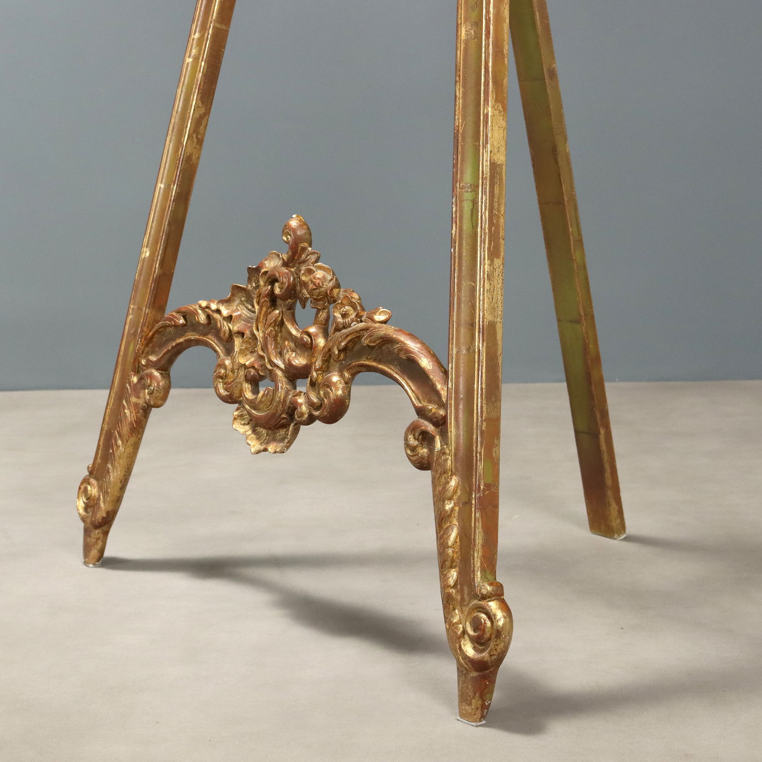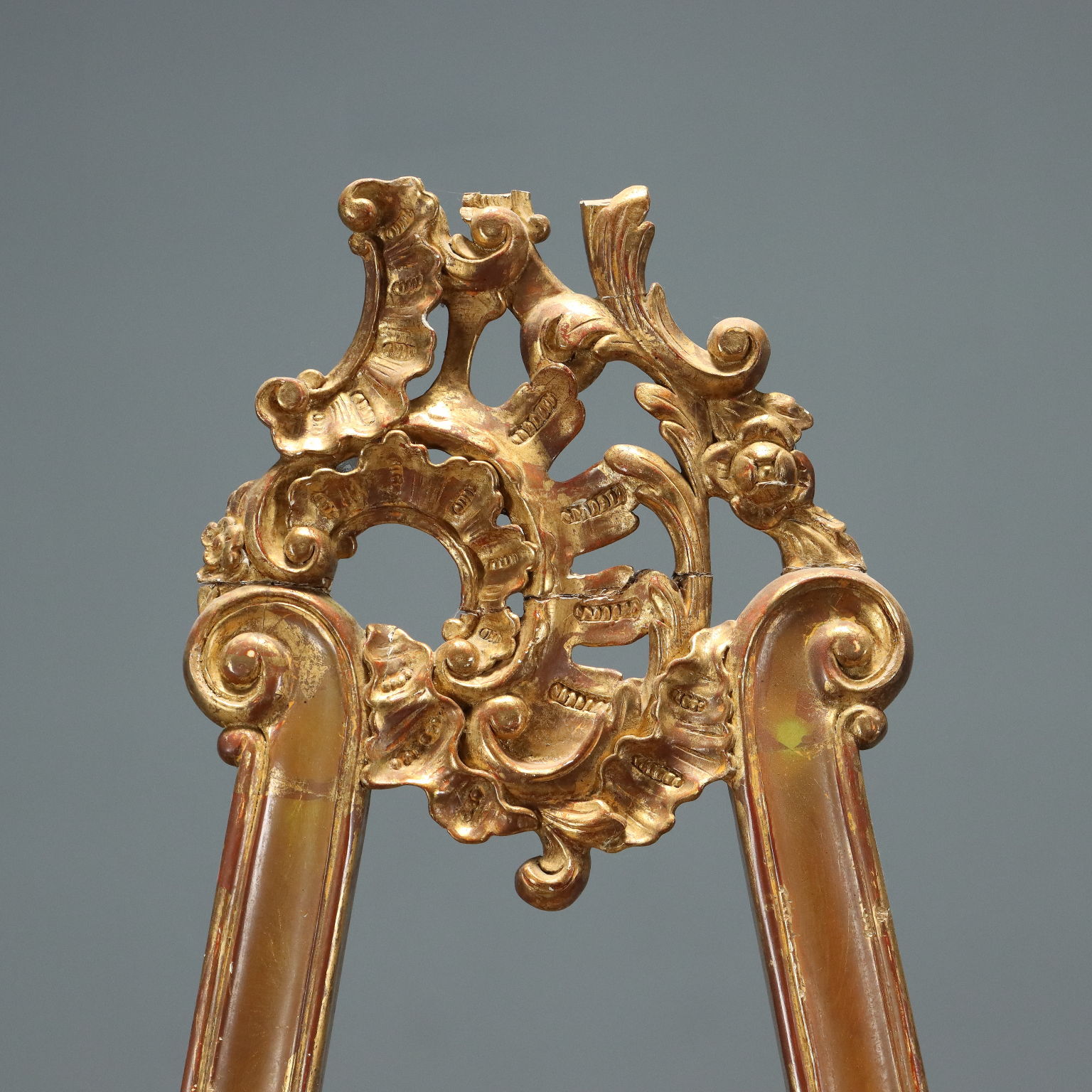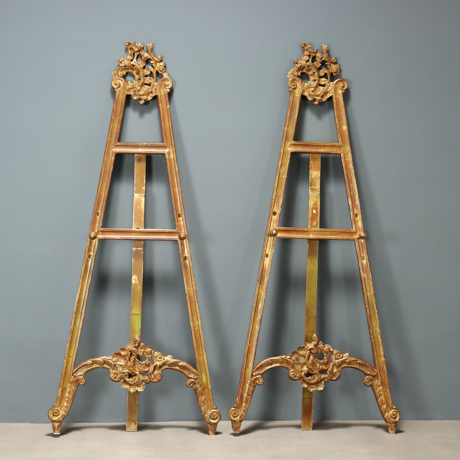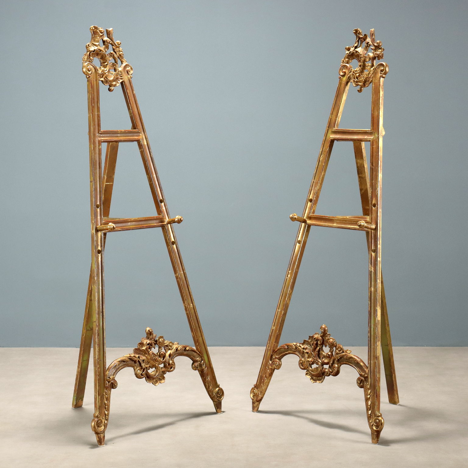 Pair of lacquered and gilded wooden easels, with floral, leafy, and scroll carvings on the base and top. Italy, 20th century.