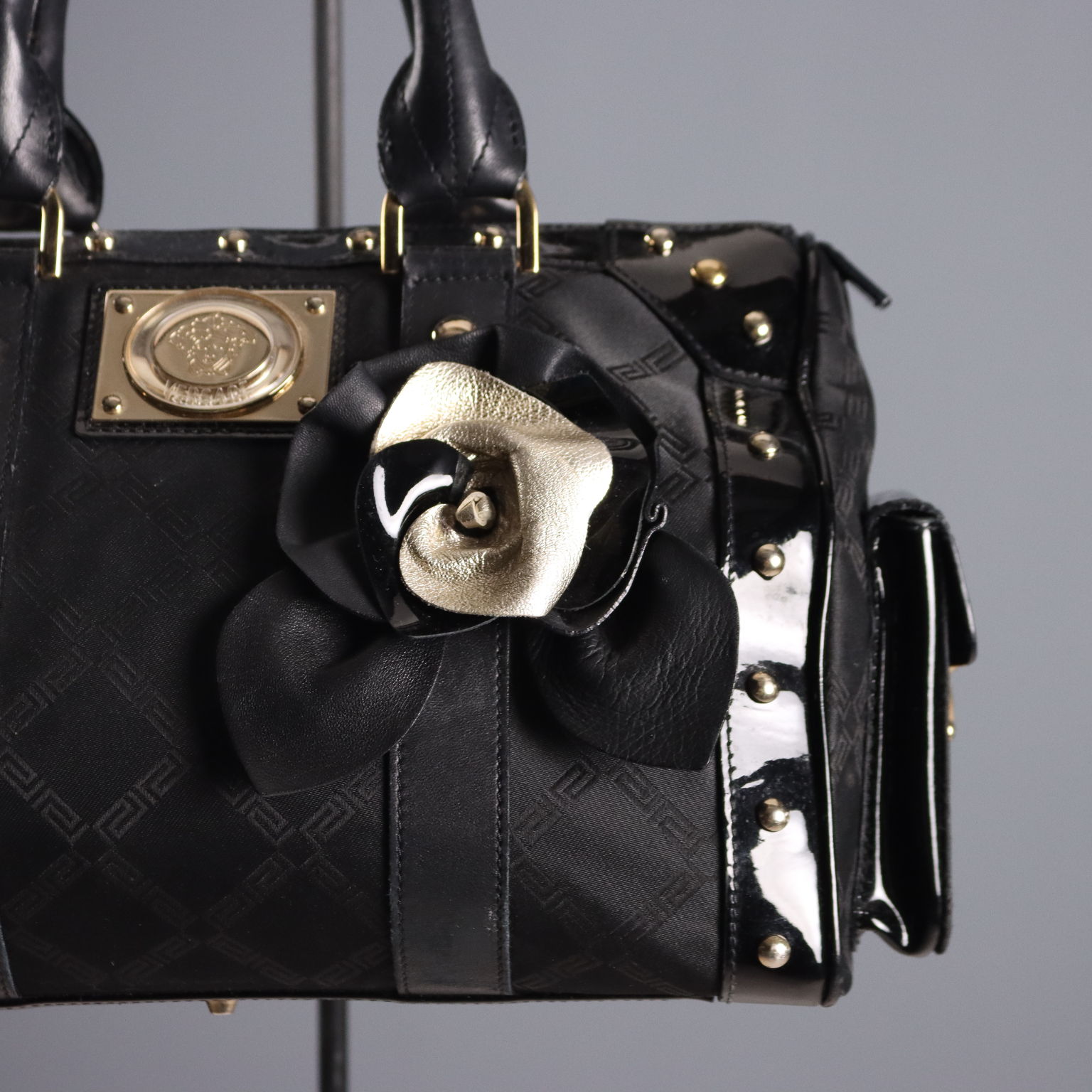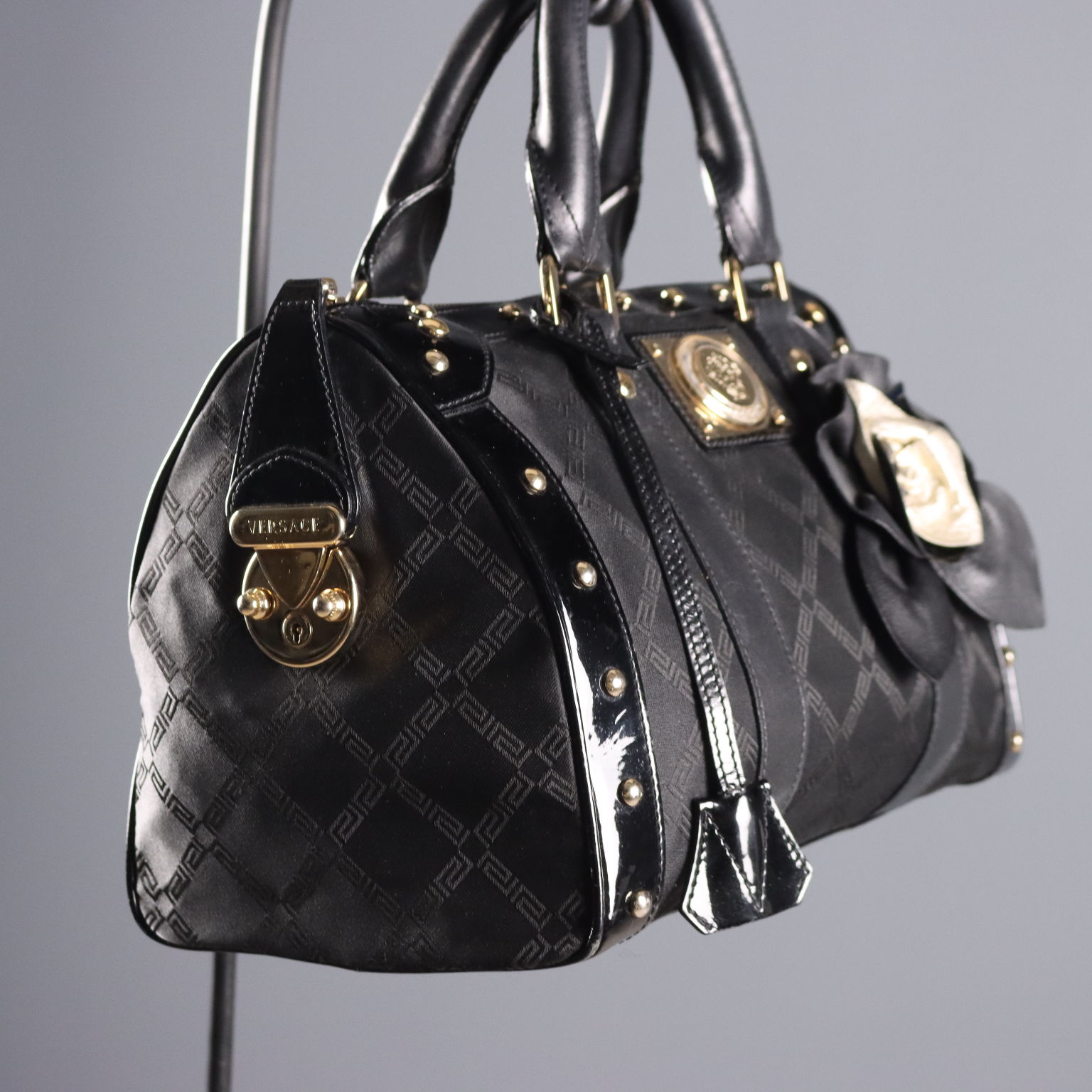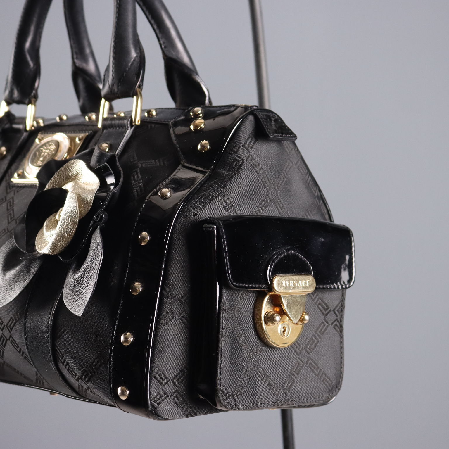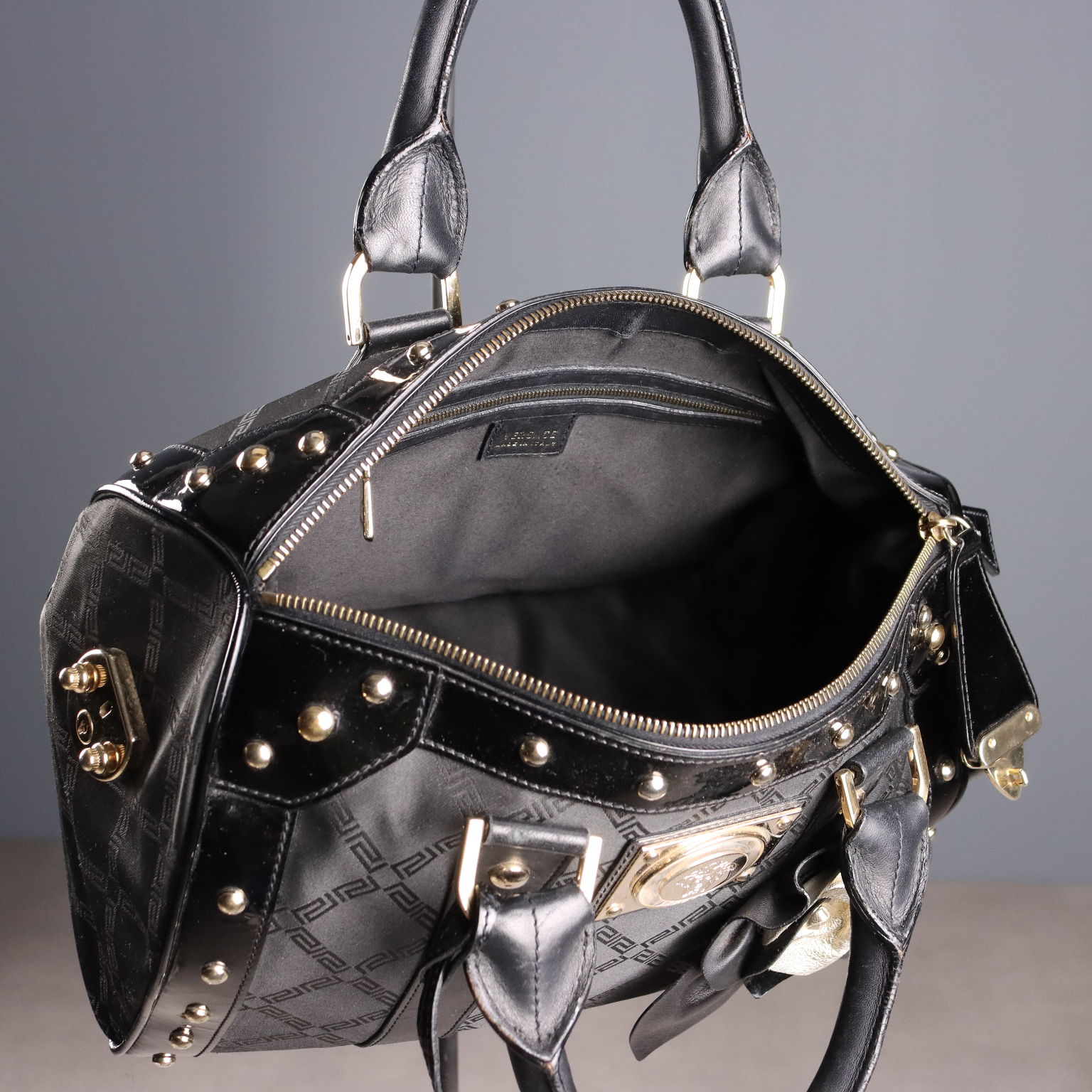 Canvas satchel bag with a Greek key motif, finished with patent leather trim and gold studs. The zipper can be locked on the side using a special hook. A key is included for added security. The interior is lined and features three small pockets. Includes a dust bag.