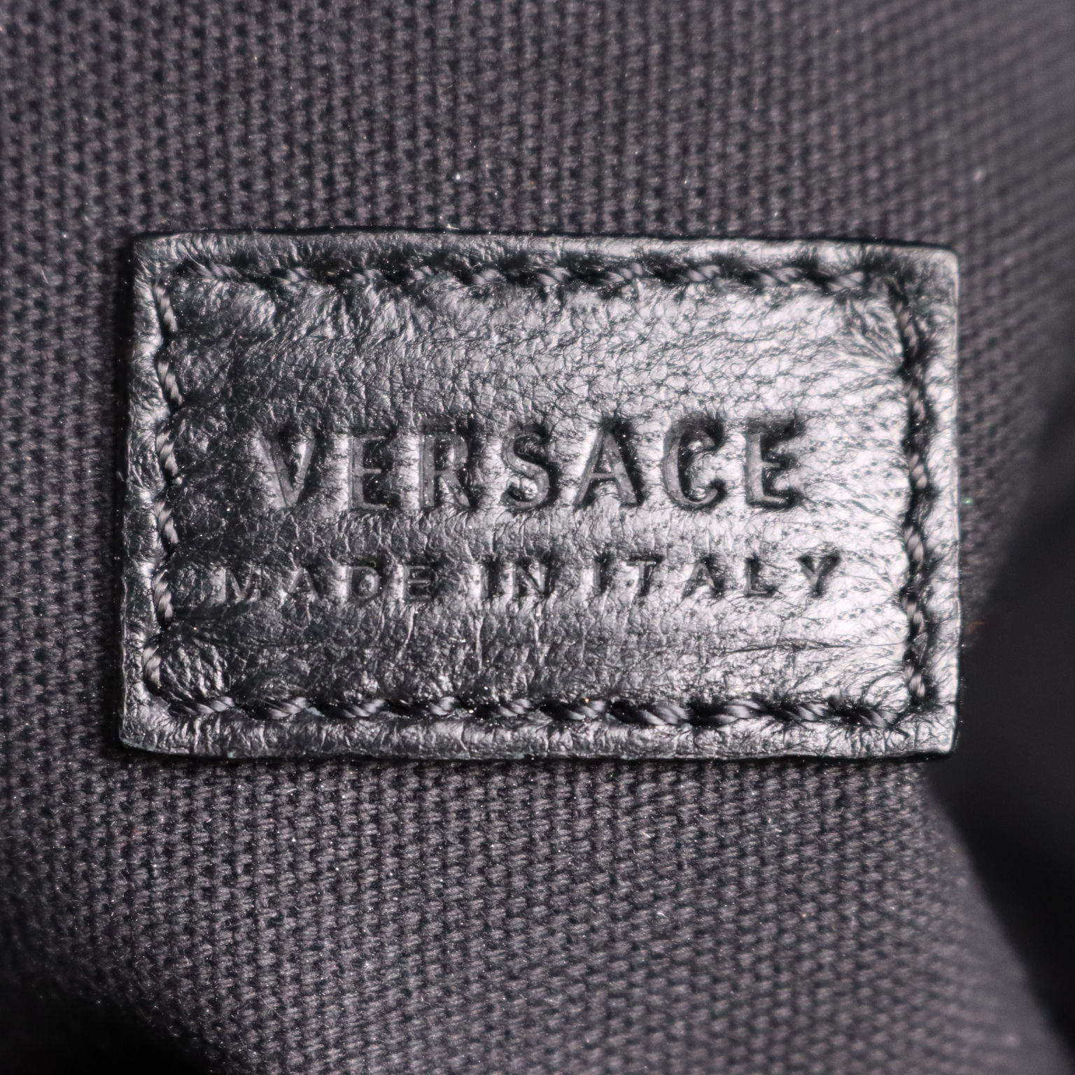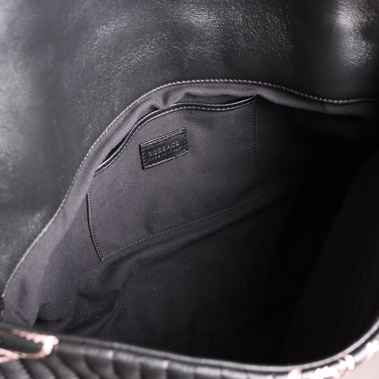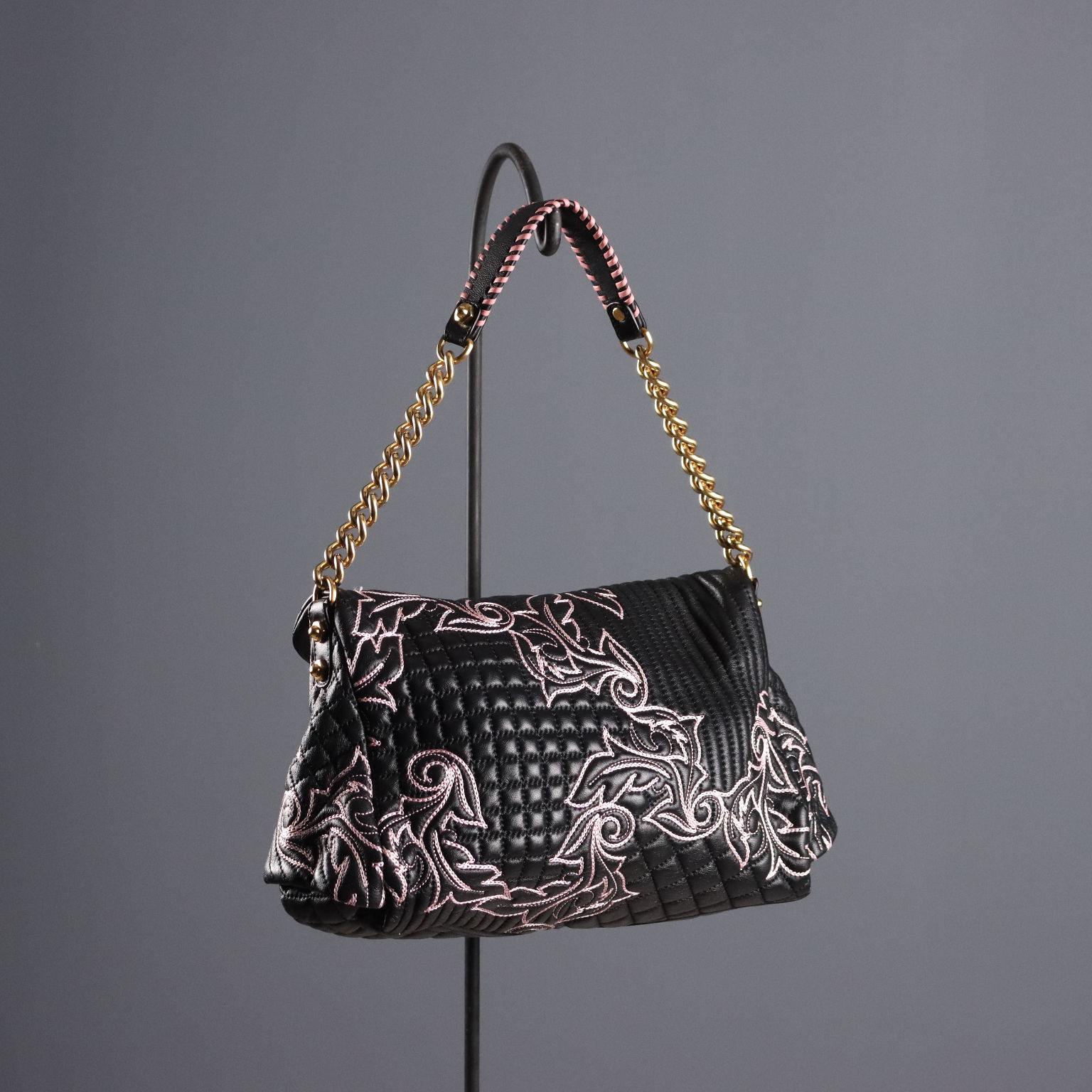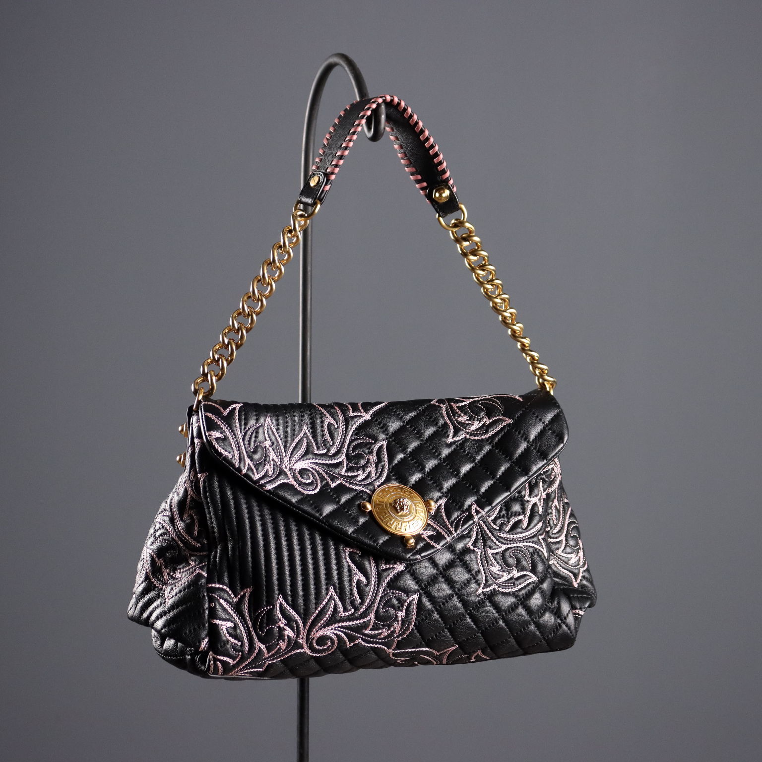 Soft quilted leather bag with pink embroidery, embellished with a gold-tone metal Medusa logo. Snap closure. Leather handle with chain. Lined interior with two small pockets.