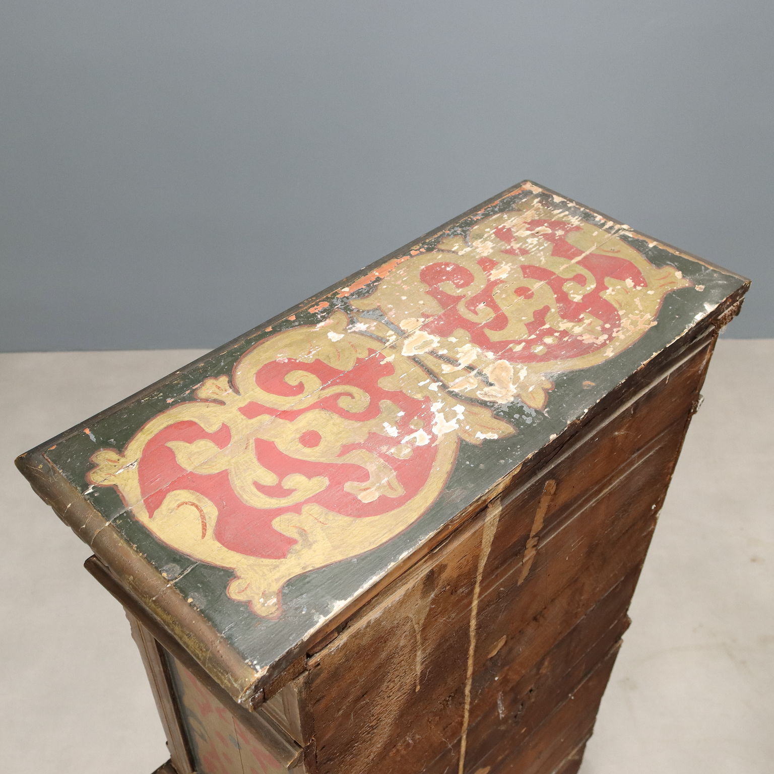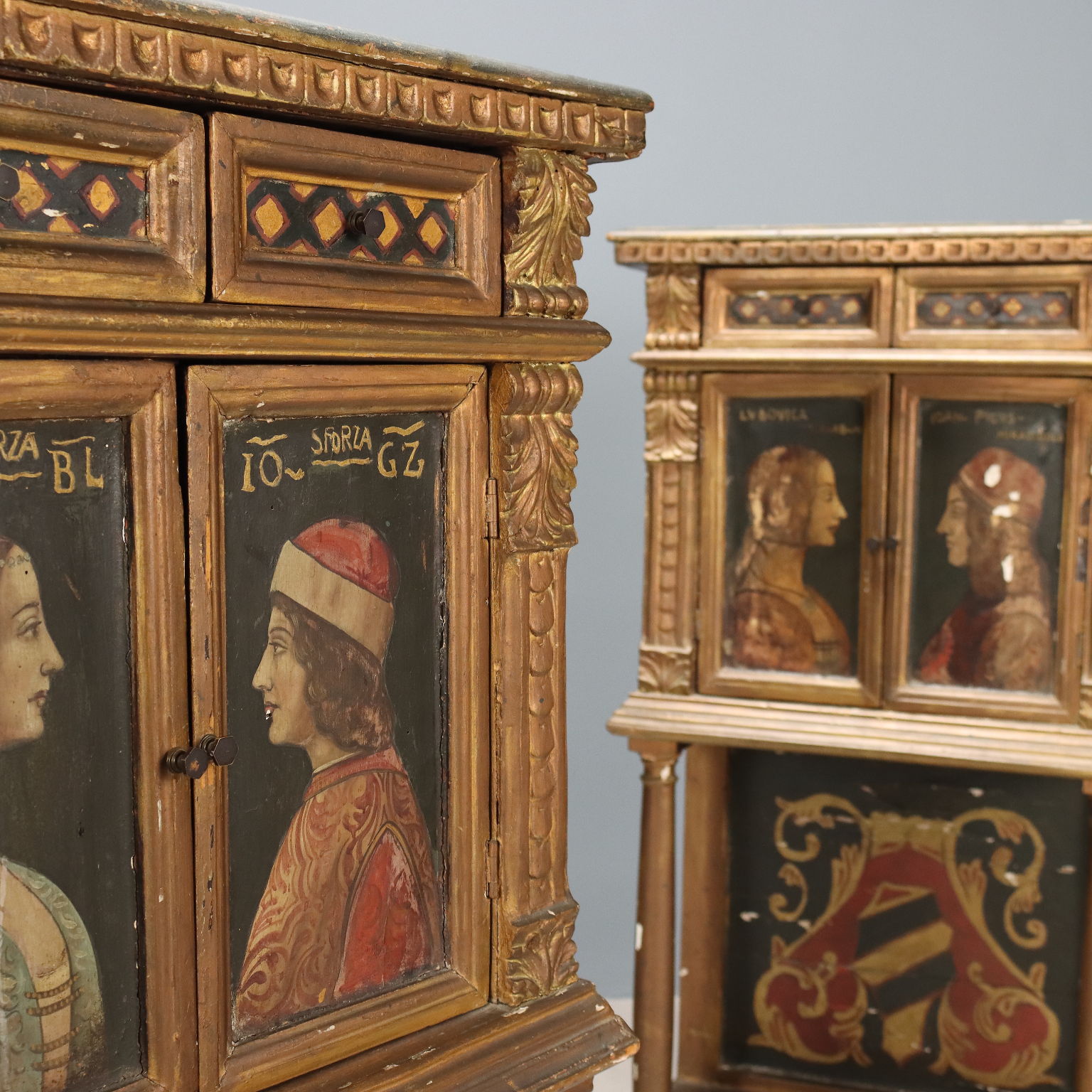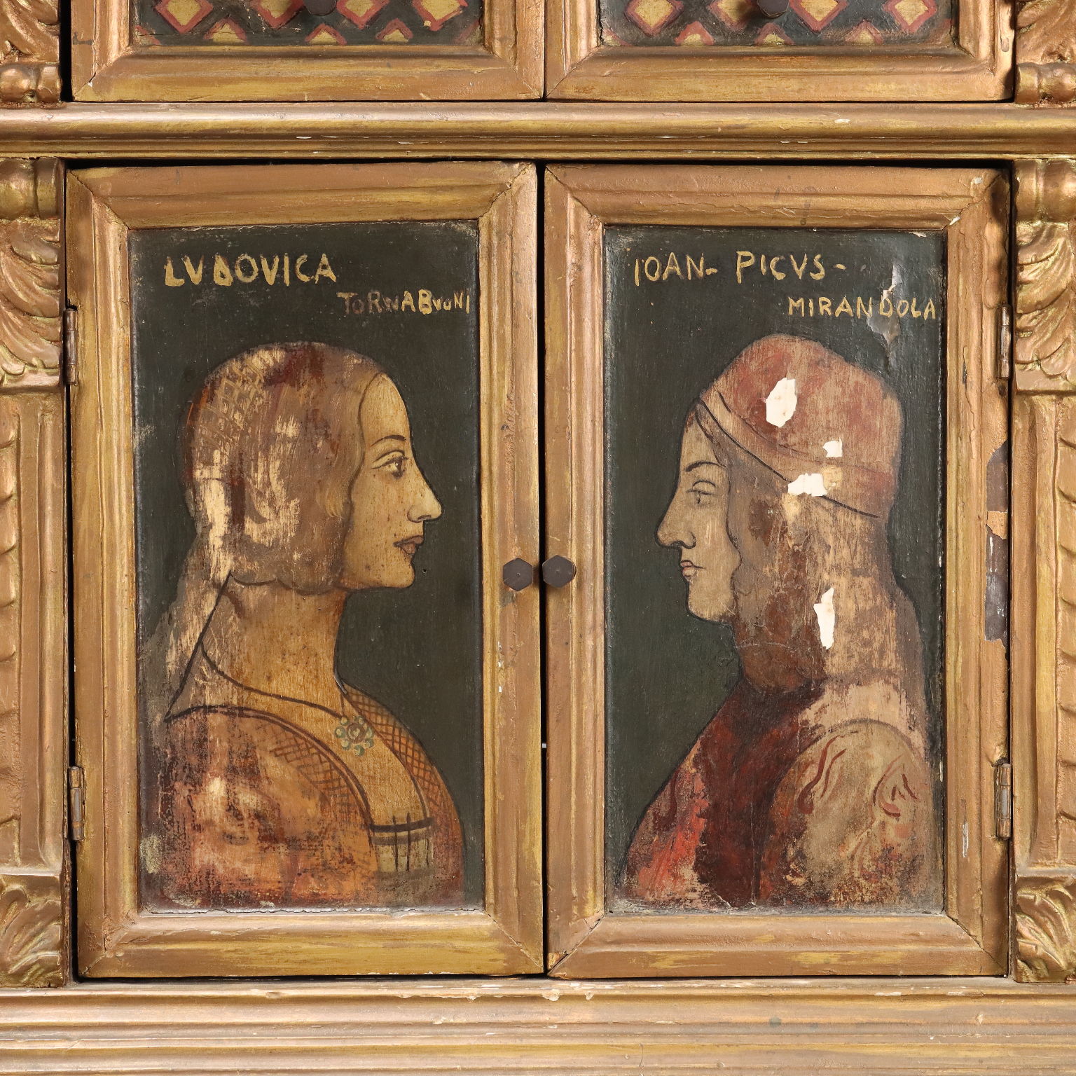 A pair of small cabinets painted in Renaissance style in the early 1900s. Supported by tall columns with a painted panel on the bottom, they feature two doors on the front. The doors depict profiles of Renaissance ladies and knights: the Sforzas on one, Ludovica Tornabuoni and Ioan Picus Mirandola on the other. The Medici coat of arms is on the sides, and other coats of arms adorn the base. Entirely painted in polychrome and partially gilded, with numerous paint losses.