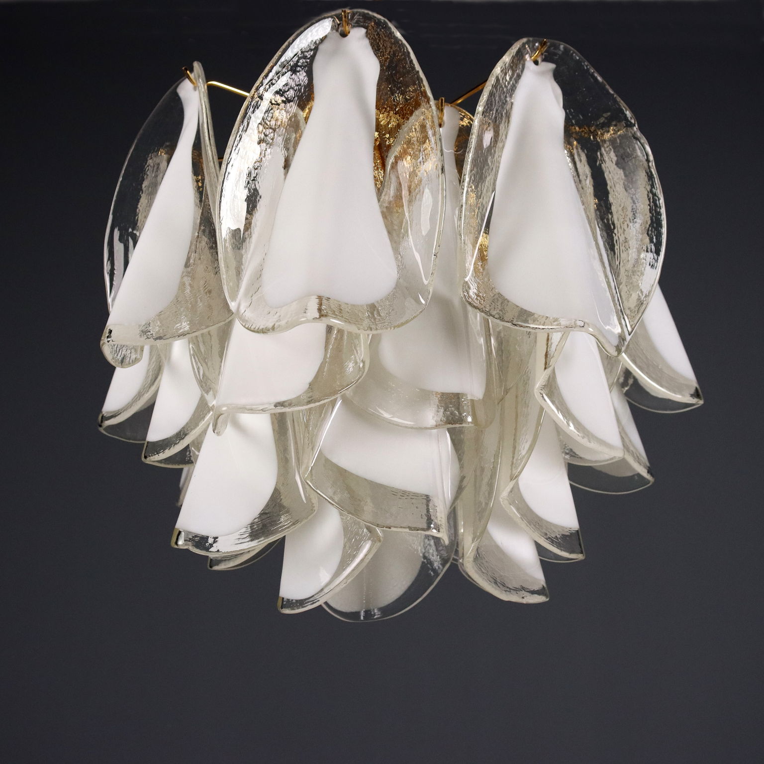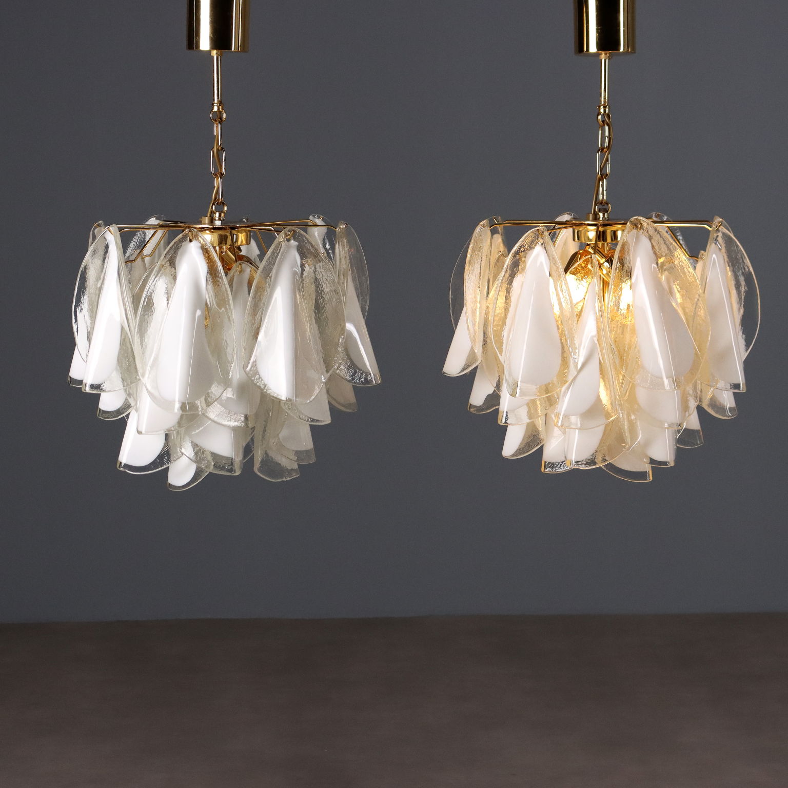 Pair of pendant lamps with a gold-plated metal structure and white and transparent Murano glass elements.