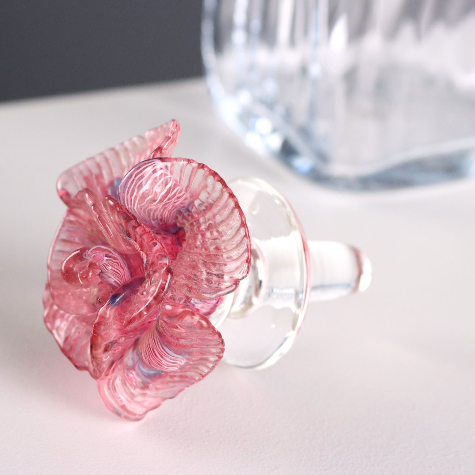 Ribbed blown glass bottle with a rose-shaped cap. Adhesive label and designer's signature.