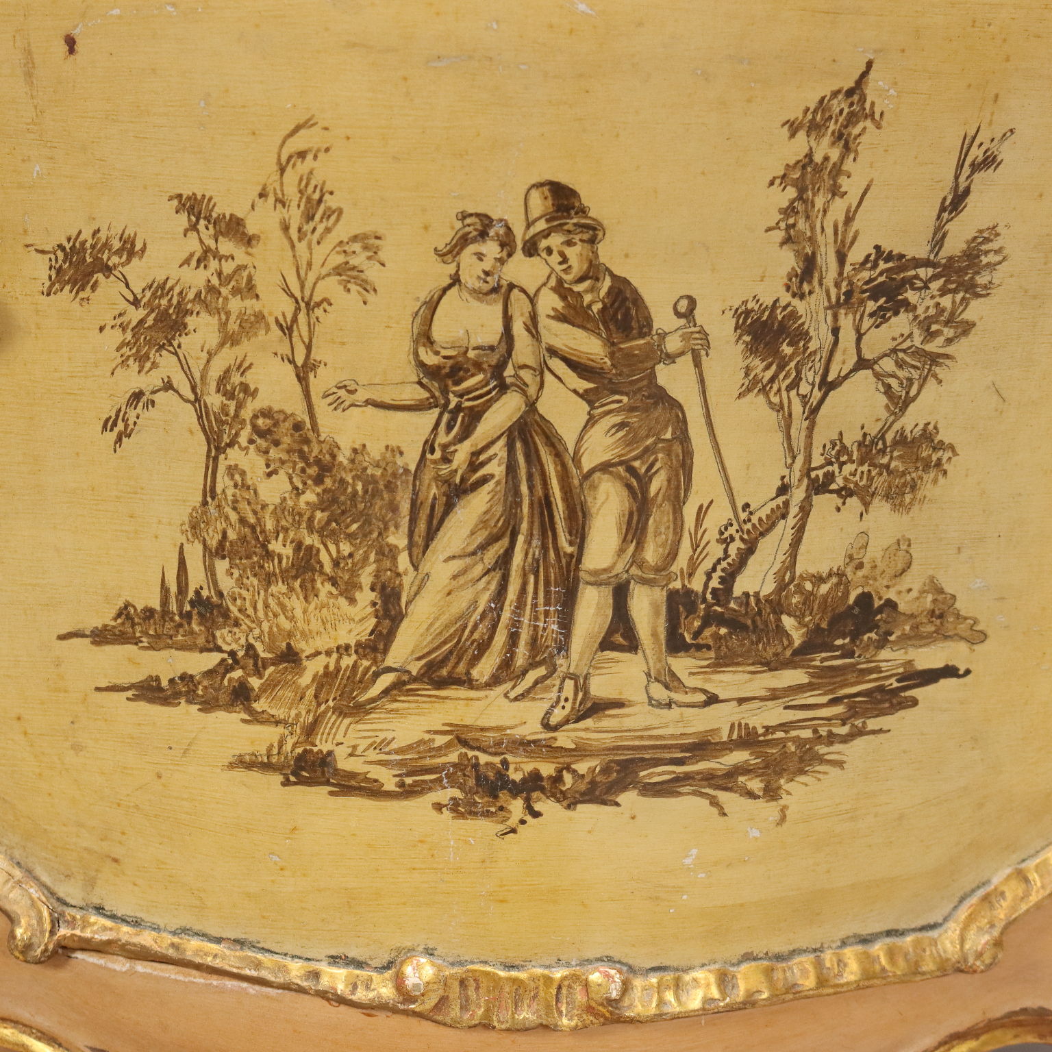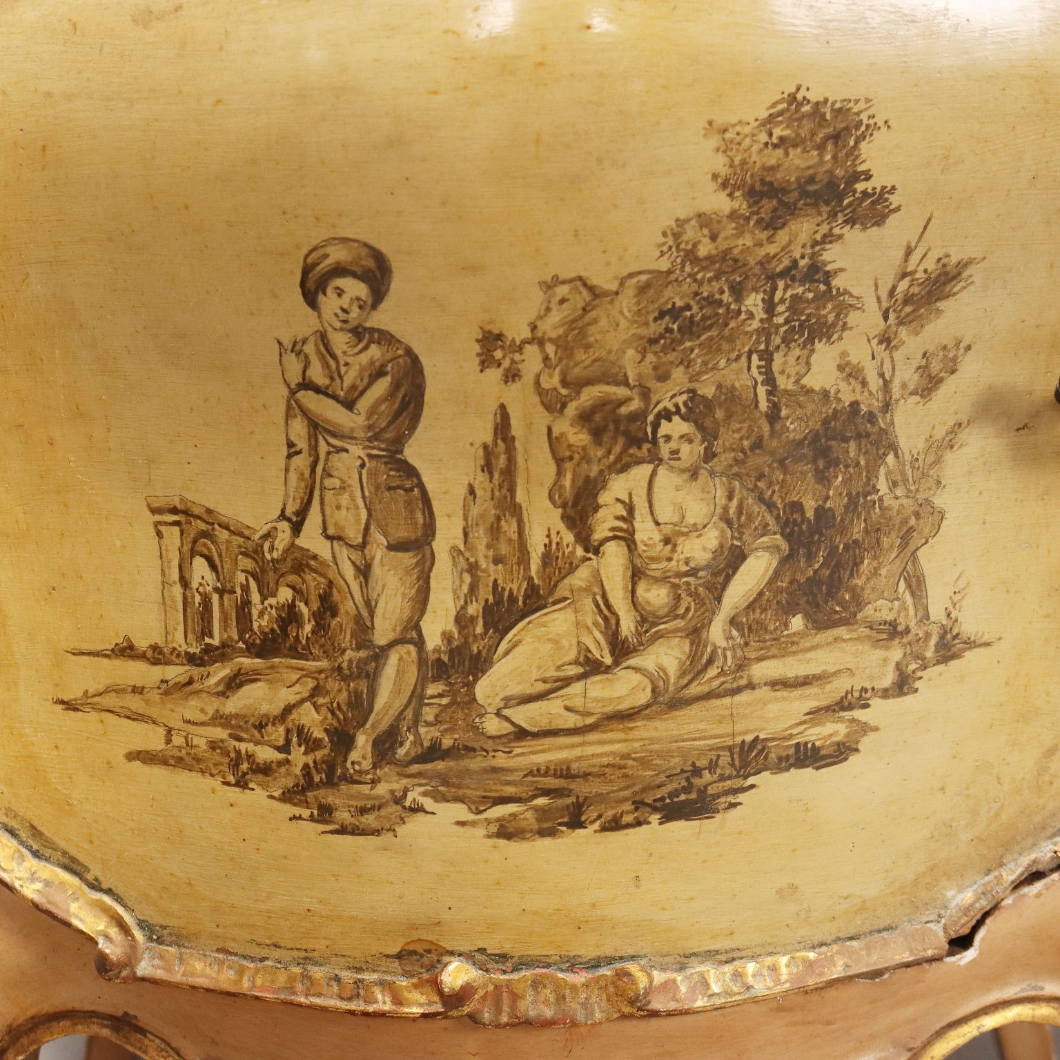 Pair of Venetian Baroque-style bedside tables, lacquered and painted with country subjects. Front and sides with double vertical and horizontal movement, drawer in the band below the top and central door. Faux marble top, gilded and carved moldings. Venice, early 20th century.