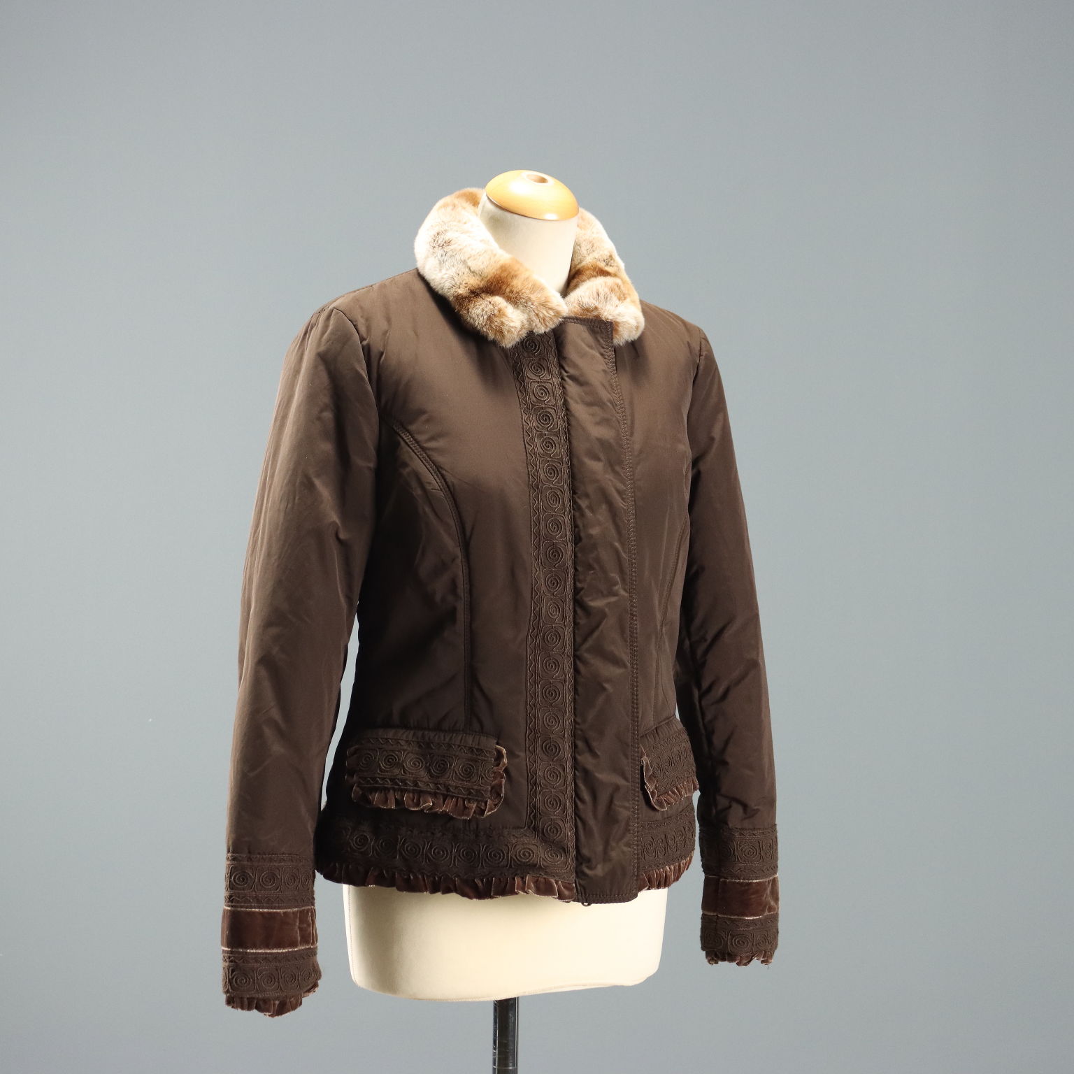 Padded jacket from the "Scervino Street" line, with a fur collar, distinctive embroidery, and smooth velvet inserts in matching colors. Two-way zipper and concealed snap buttons. Length: 60 cm. Shoulder width: 39 cm. Sleeve length: 63 cm.