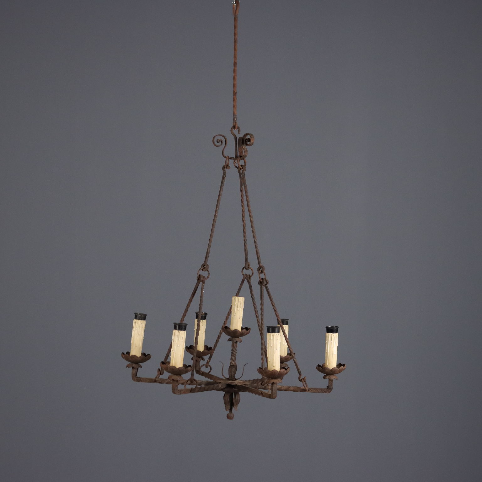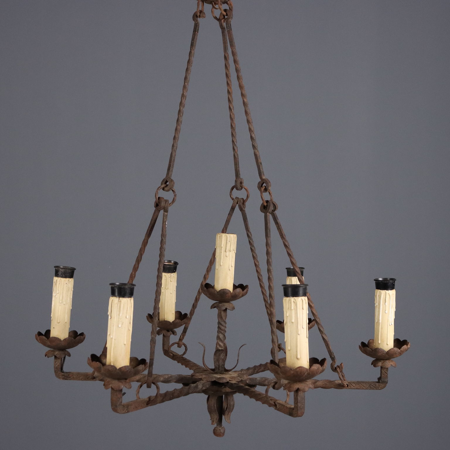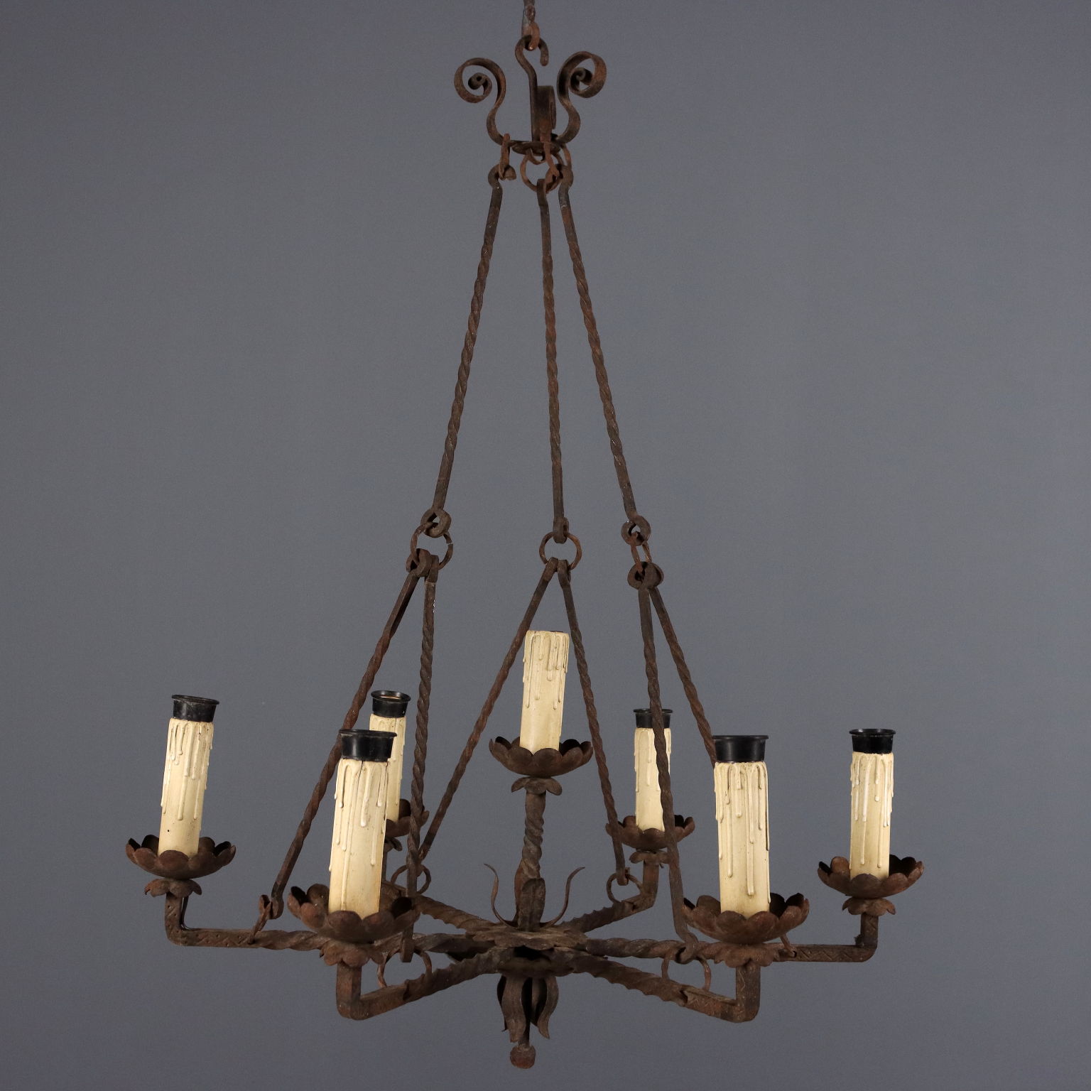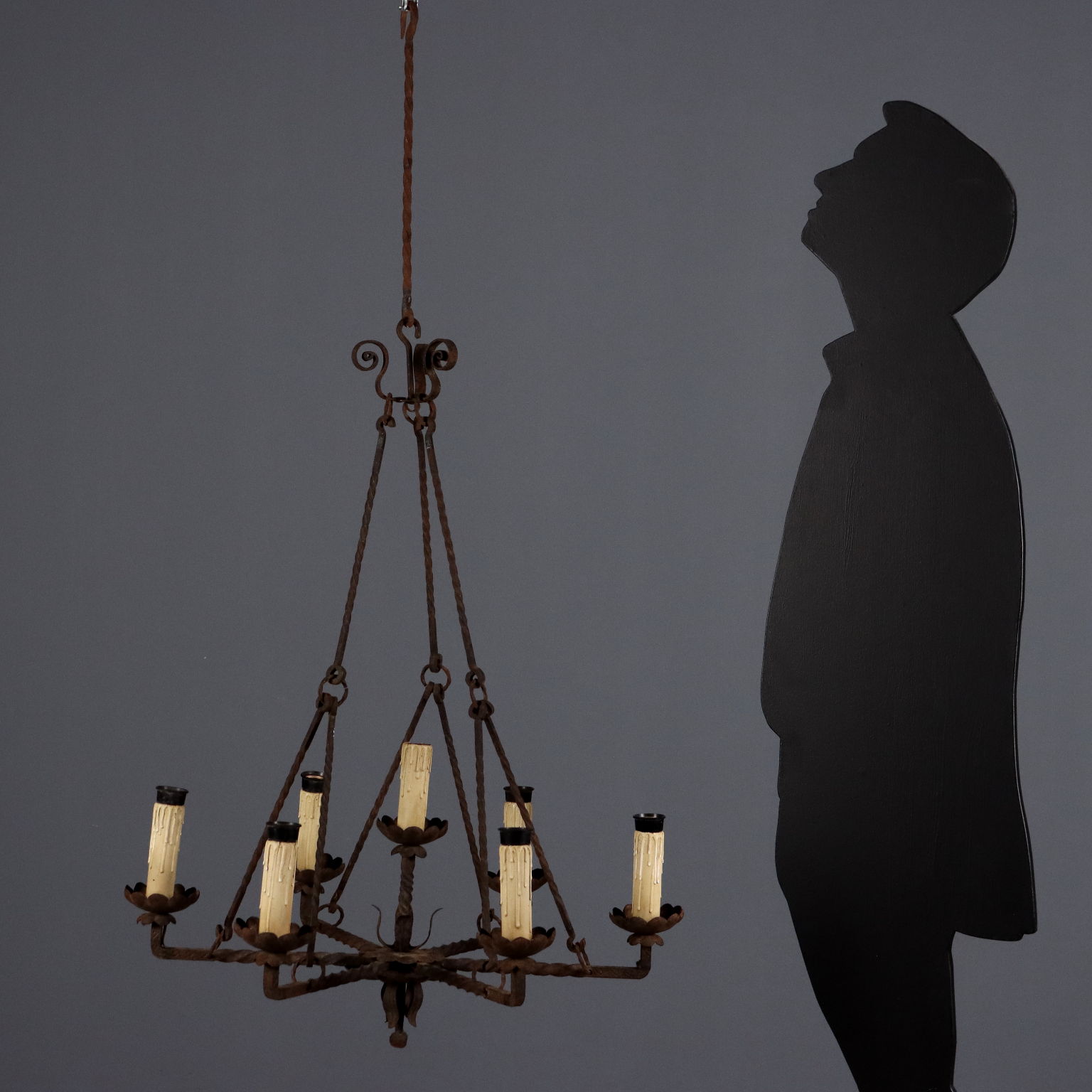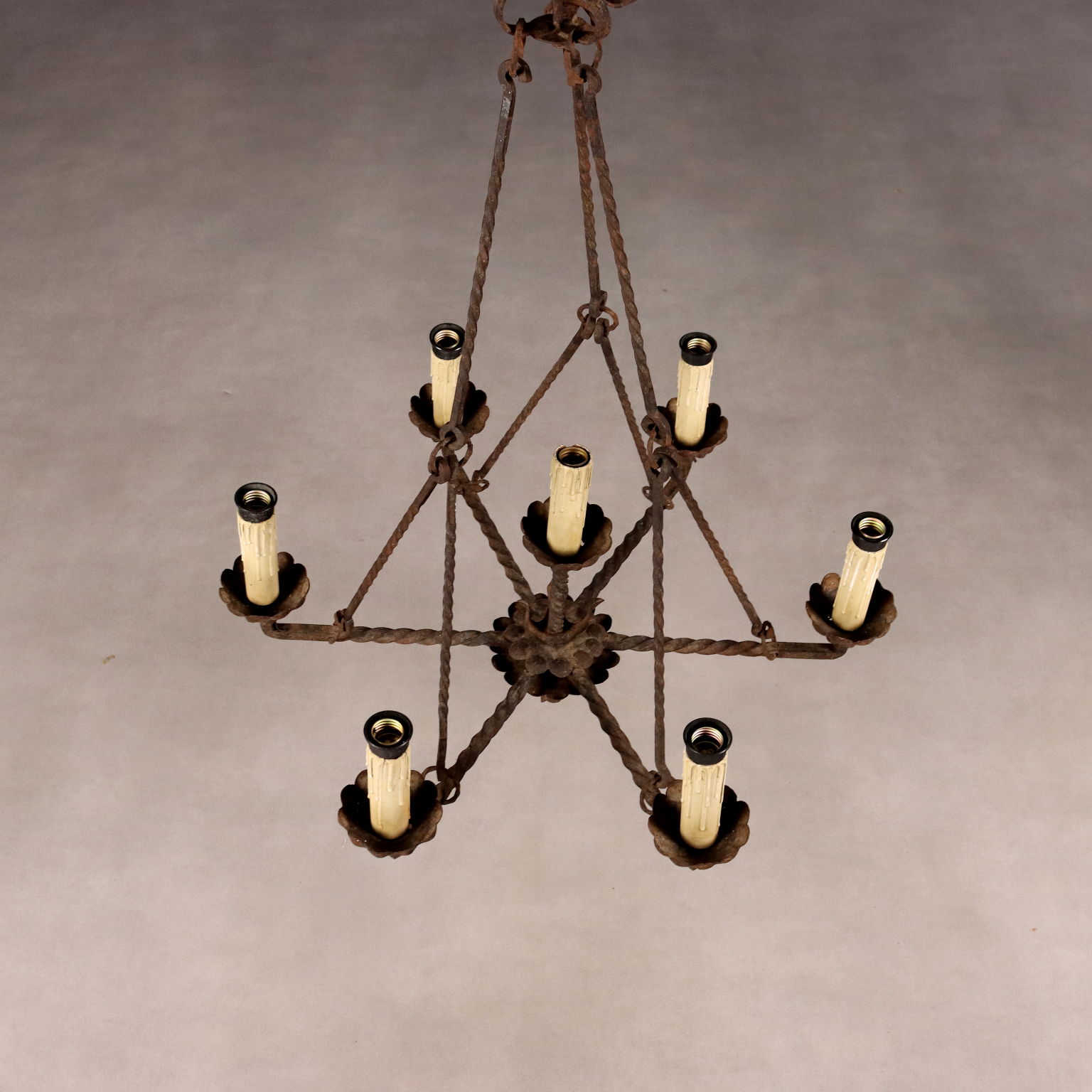 Wrought iron chandelier. Seven lights, one central and six supported by horizontal arms. Seven E27 bulbs. Italy, 19th century.
