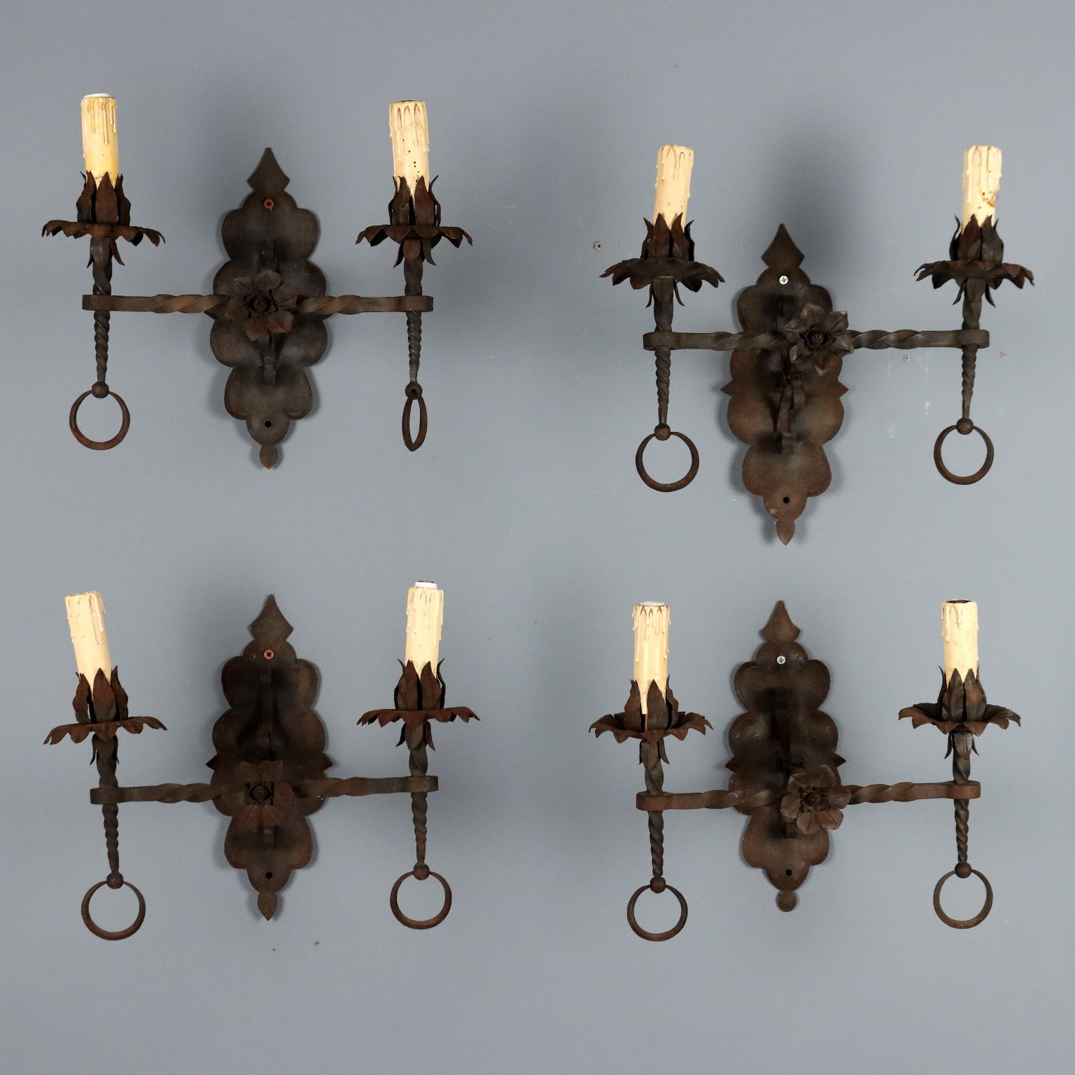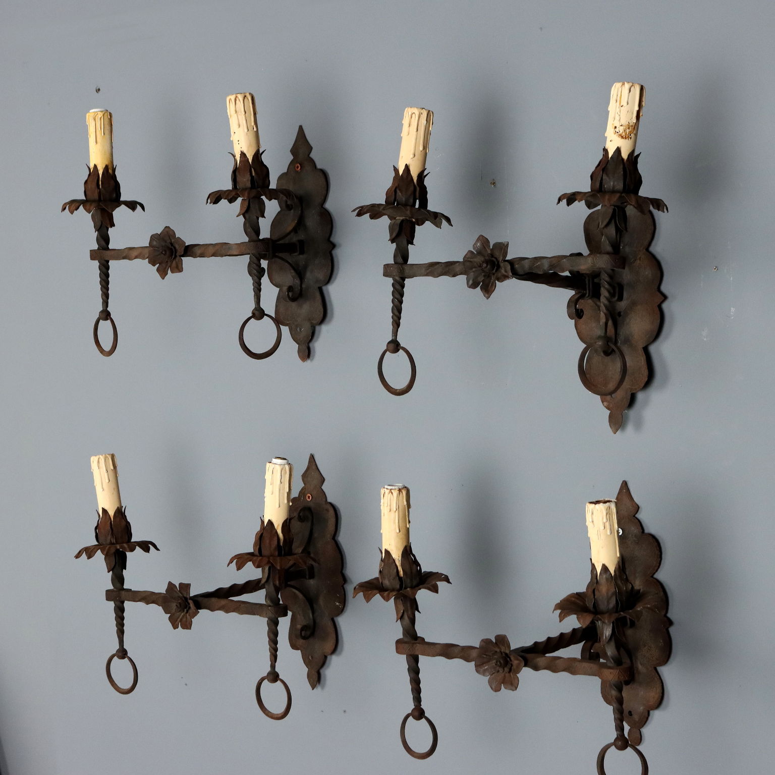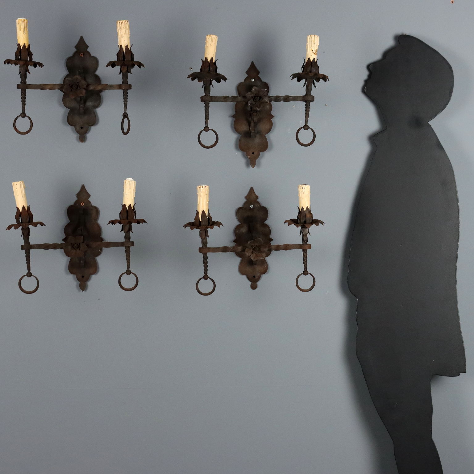 Set of four Neo-Renaissance style torch-shaped wall sconces. Crafted in wrought iron with curls, leaves, and flowers, and stamped with a punch. Two lights supported by horizontal arms. They use two E14 bulbs. Italy, late 19th century.