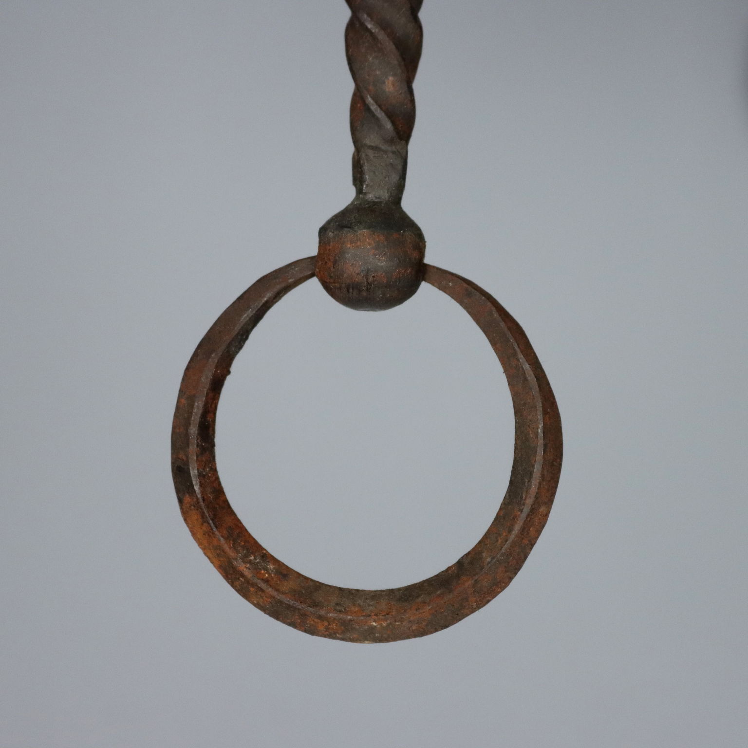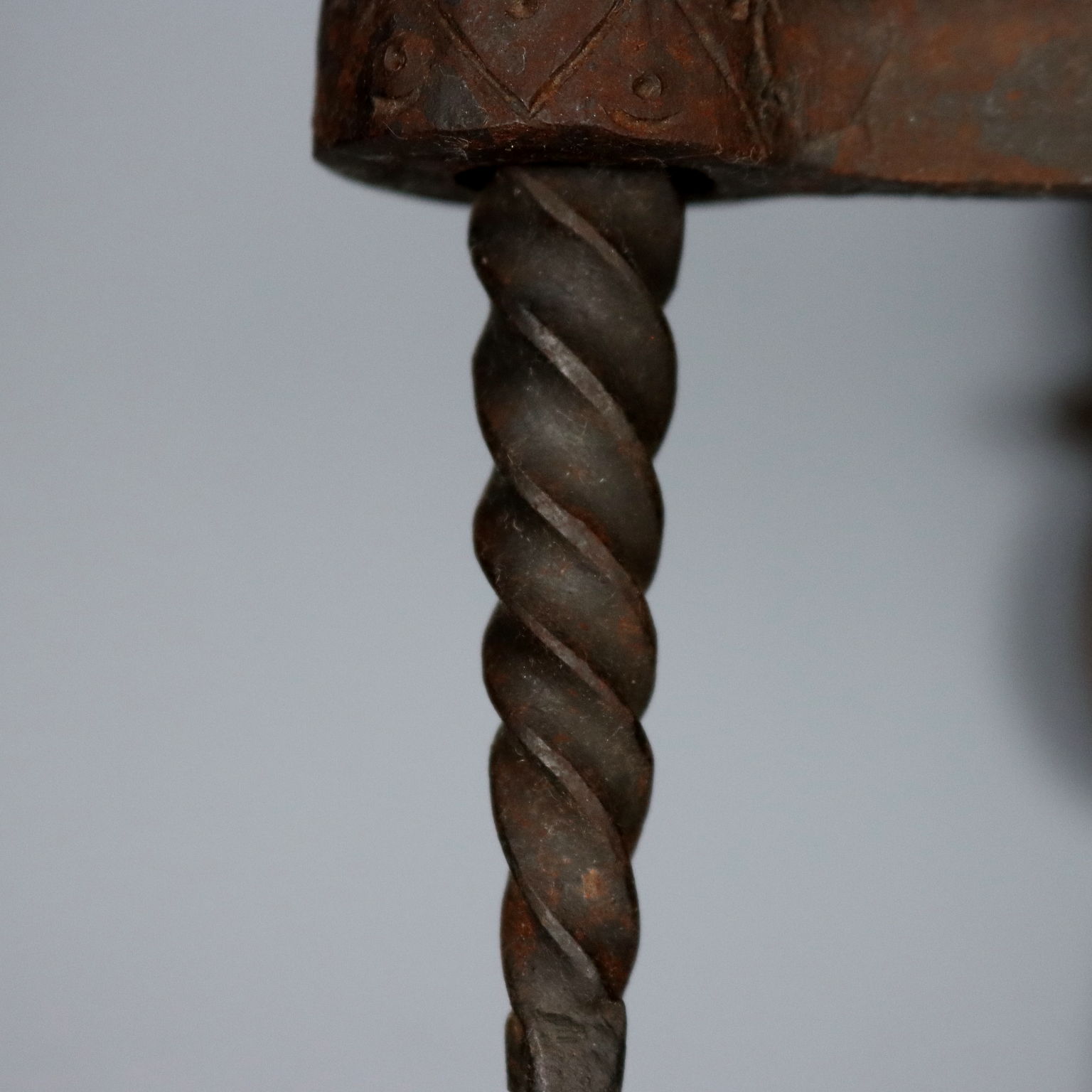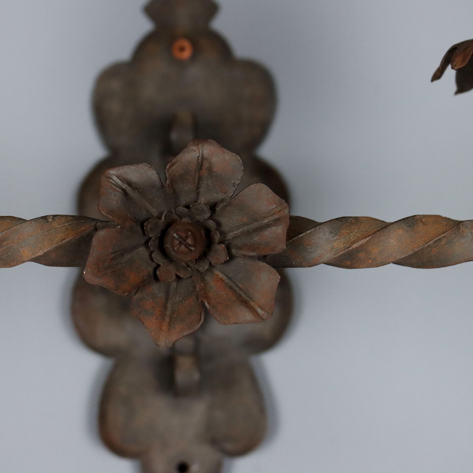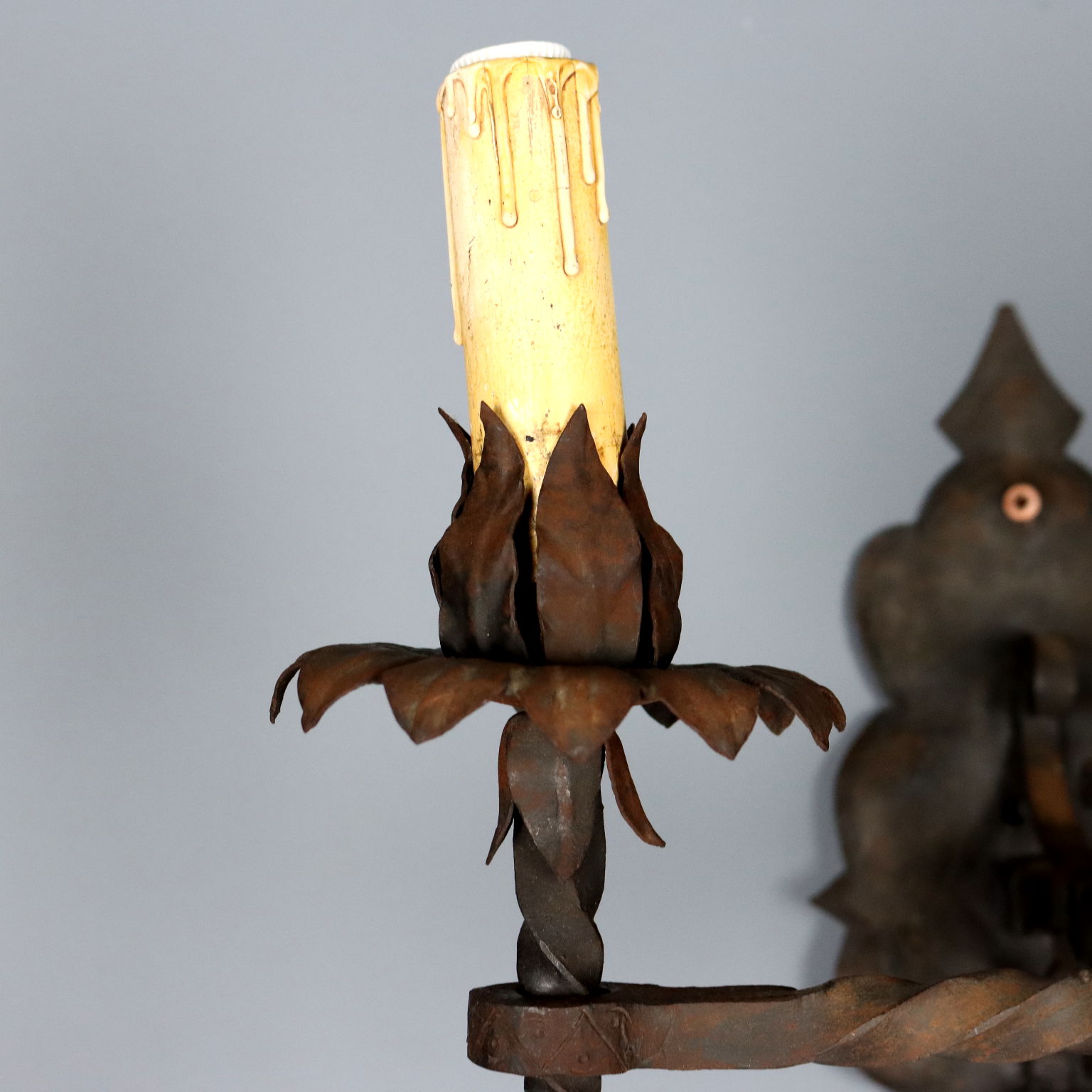 Set of four Neo-Renaissance style torch-shaped wall sconces. Crafted in wrought iron with curls, leaves, and flowers, and stamped with a punch. Two lights supported by horizontal arms. They use two E14 bulbs. Italy, late 19th century.