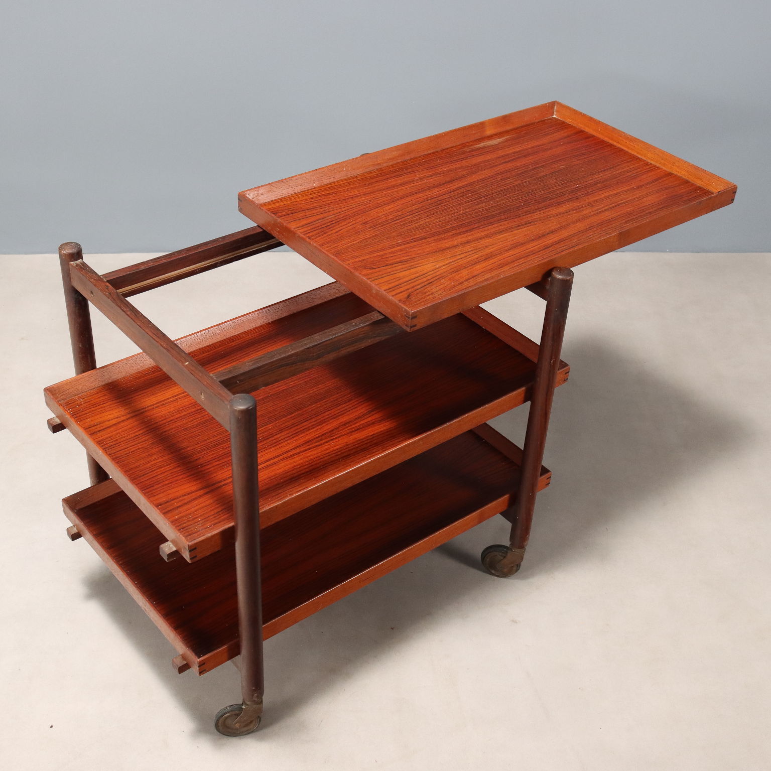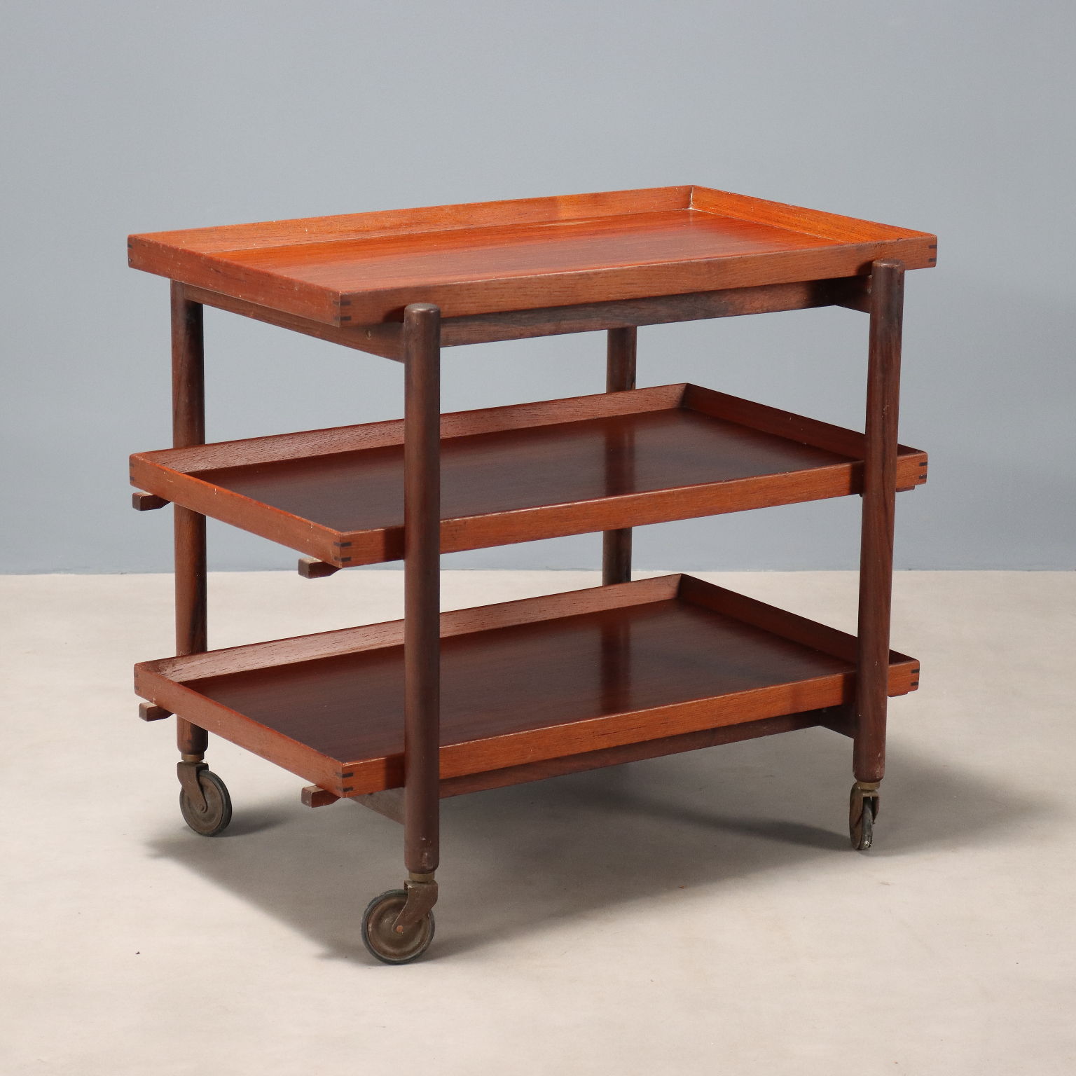 Vintage Italian-made teak veneered serving trolley with three shelves and wheels.