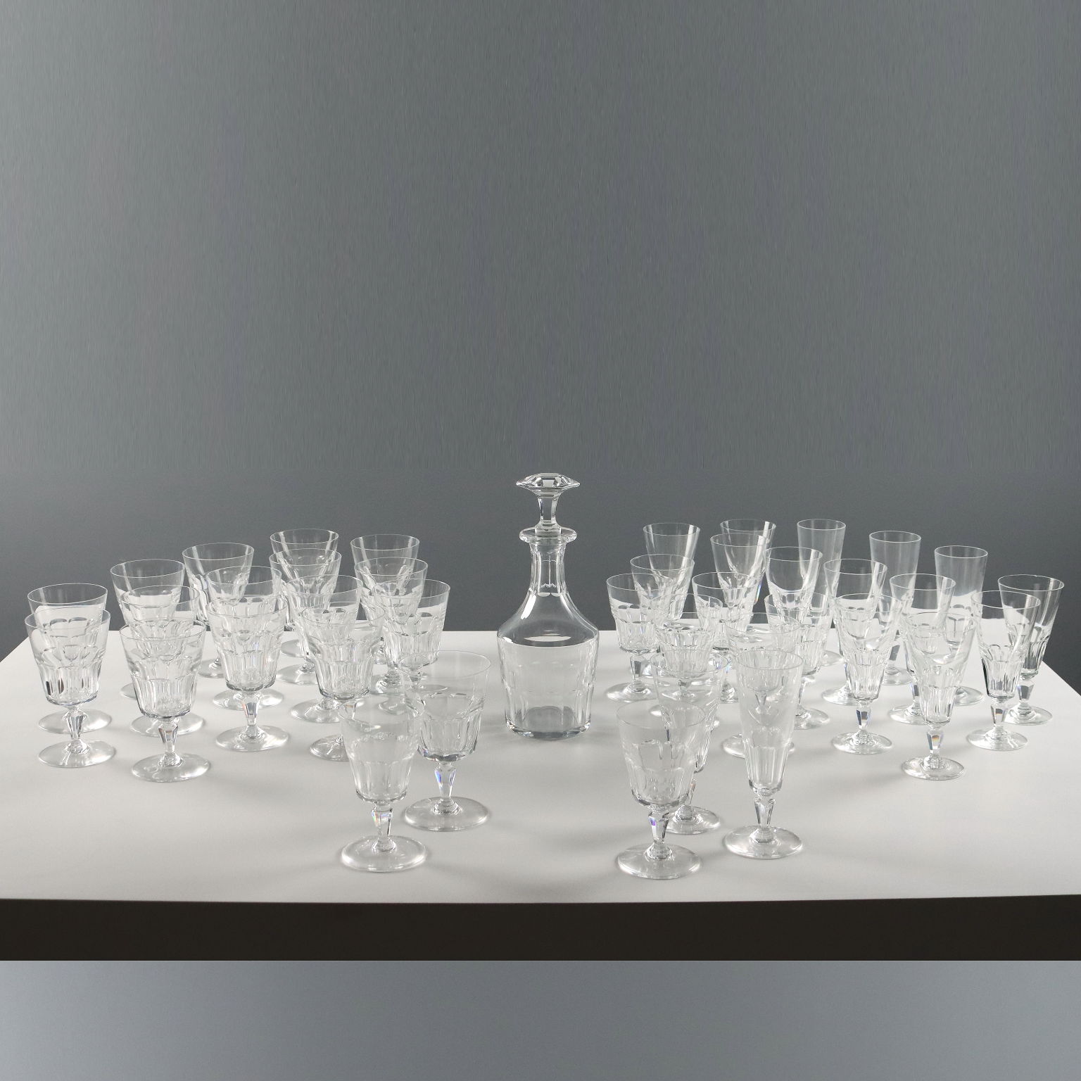 Cut crystal glassware set consisting of 1 bottle with stopper, 16 water glasses, 8 wine glasses, 11 dessert wine glasses, and 4 flutes. Manufacturer's mark under the base.