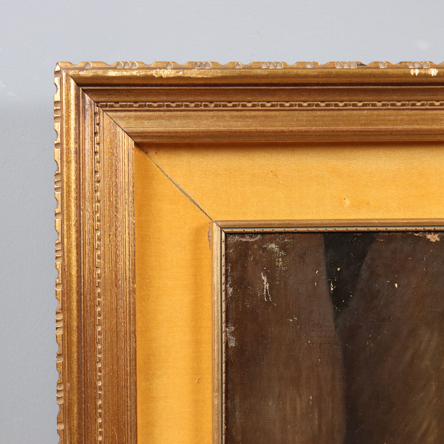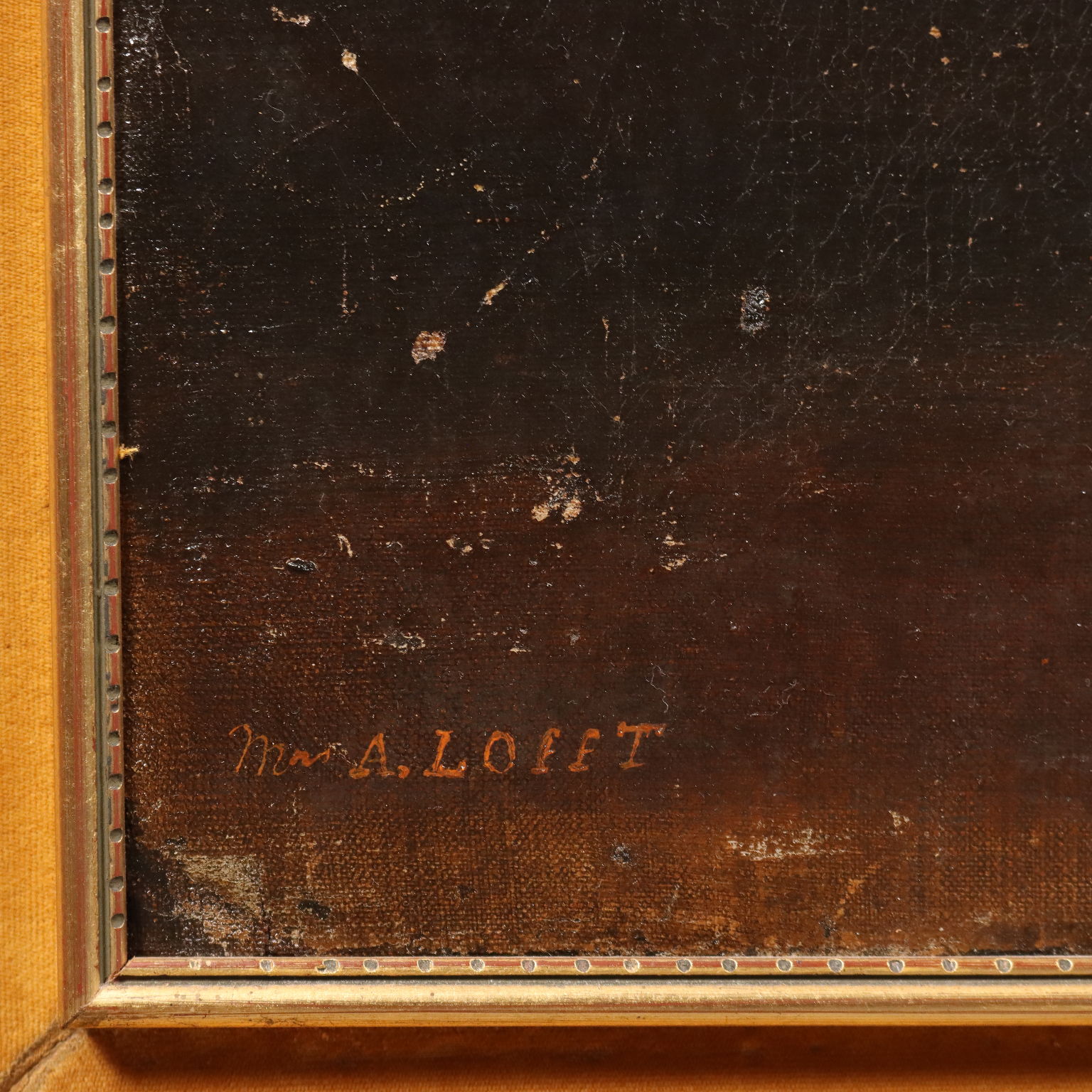 Oil on canvas. Portrait of a young woman with her dog, outdoors, against a vast river landscape. The painting, on the first canvas, shows traces of previous restorations. It is presented in a period frame.