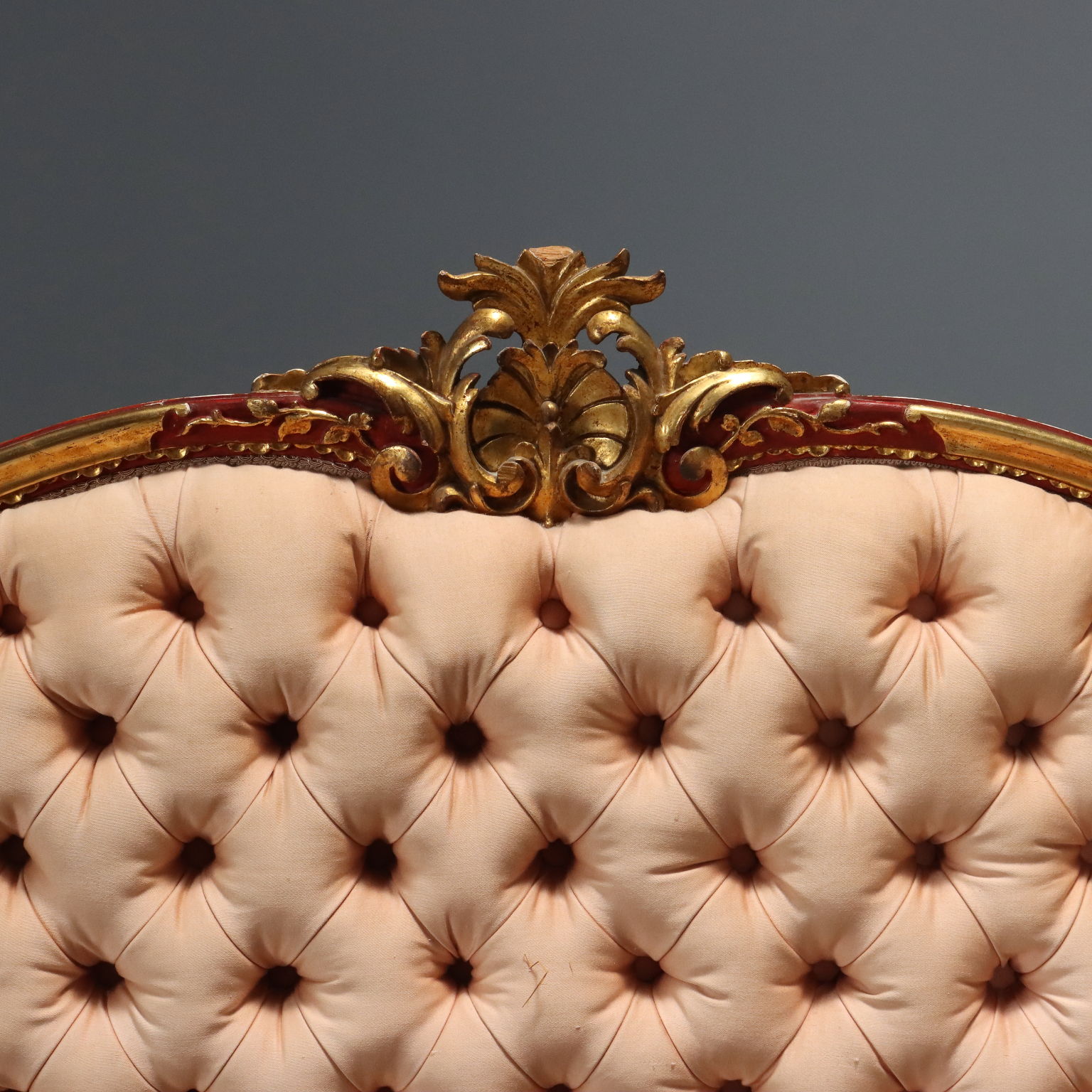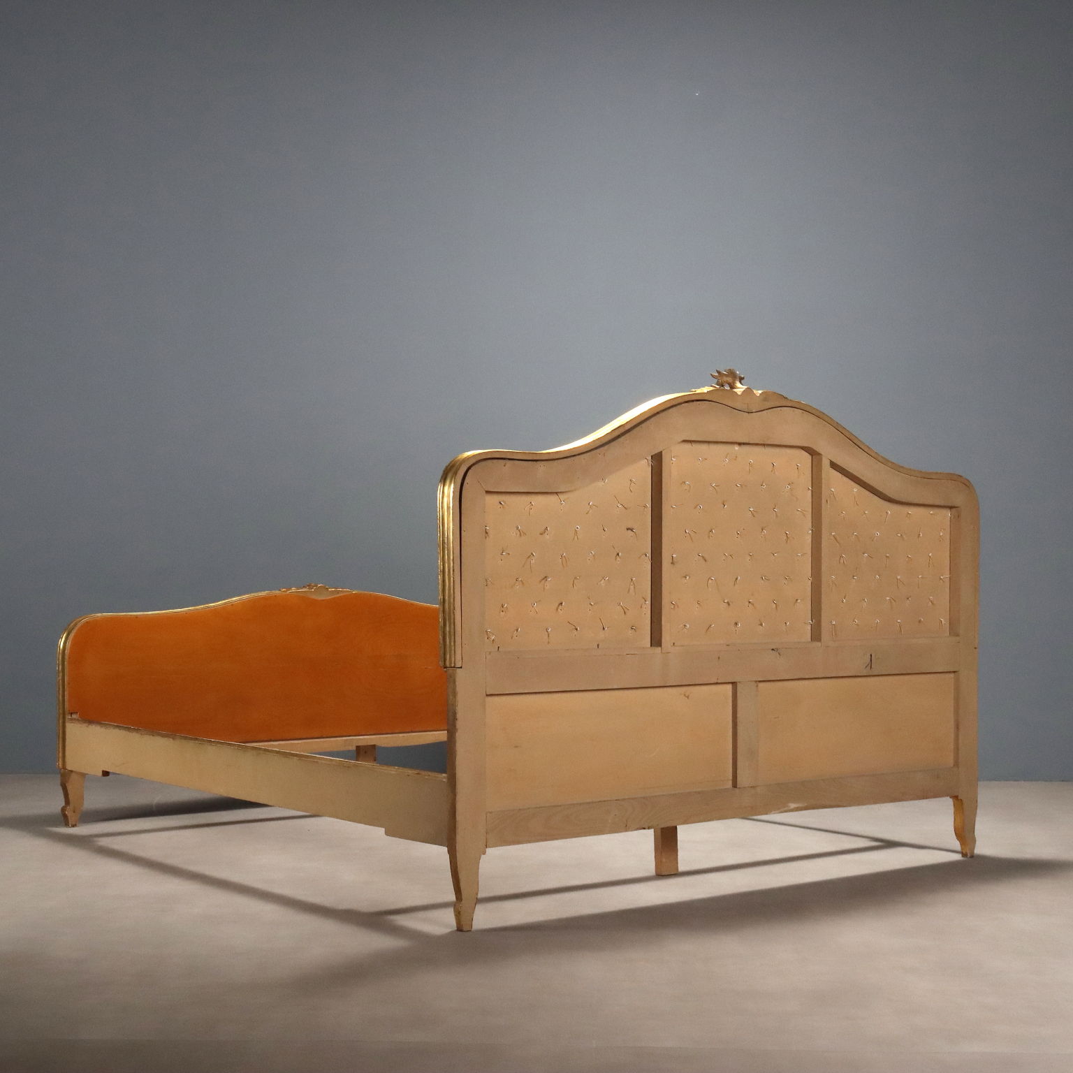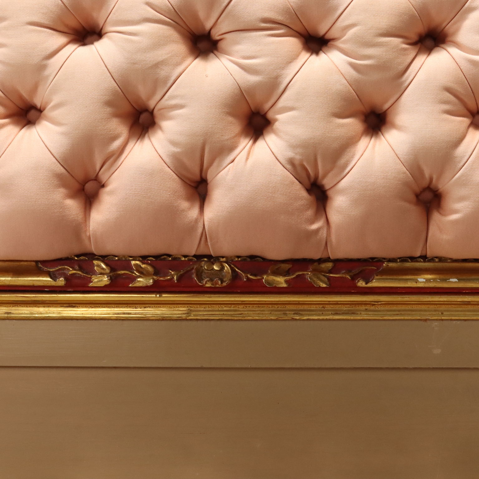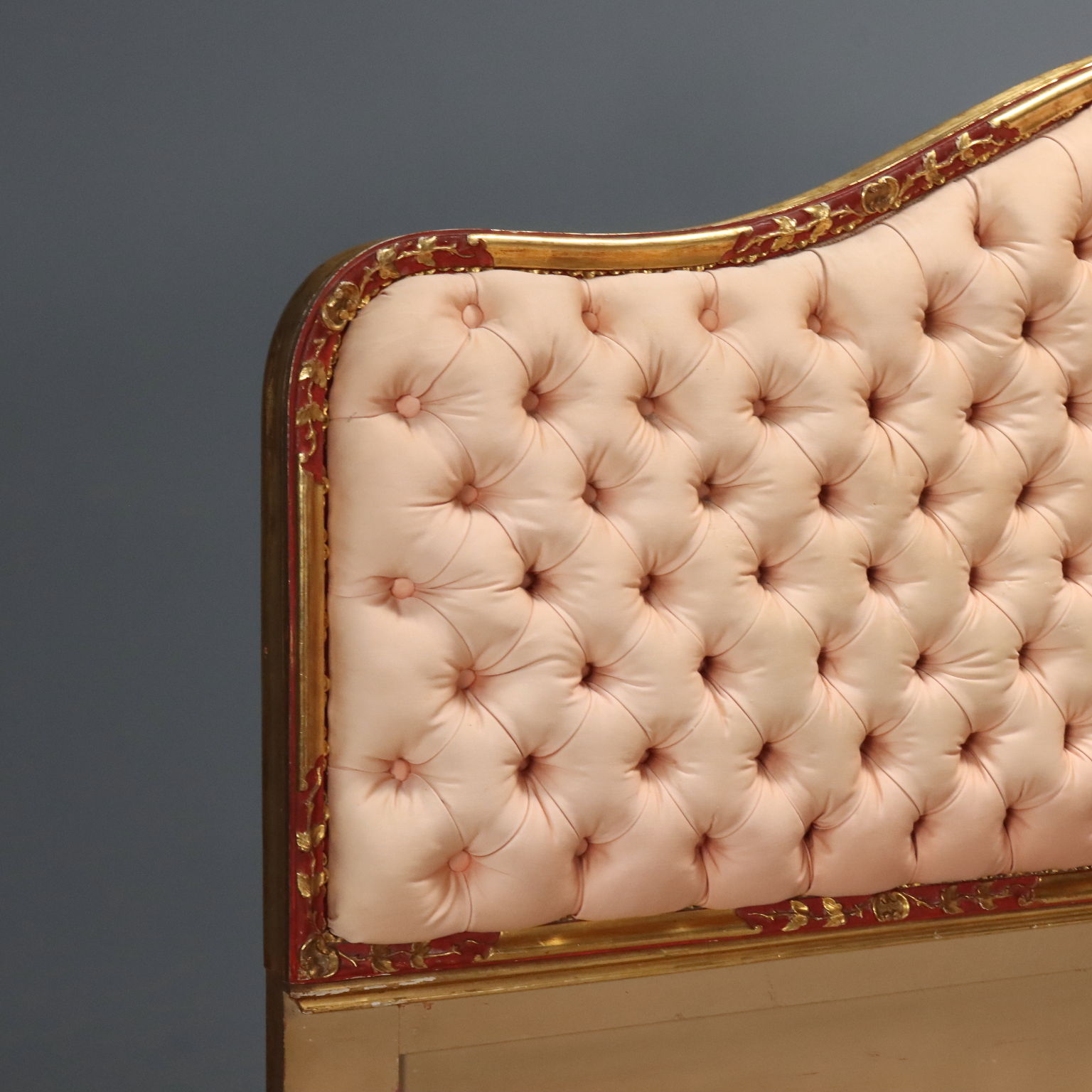 Upholstered wooden bed with a capitonné finish, featuring a gilded and lacquered wood frame. Rocaille-style carvings and curved legs. Italy, 20th century.