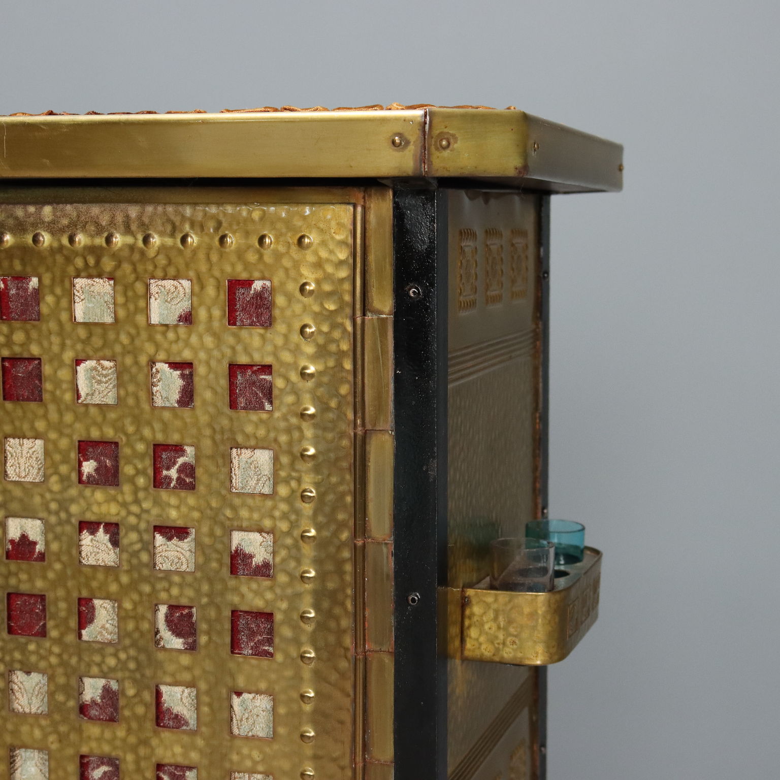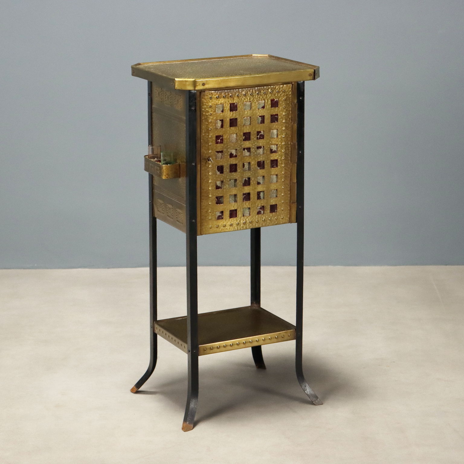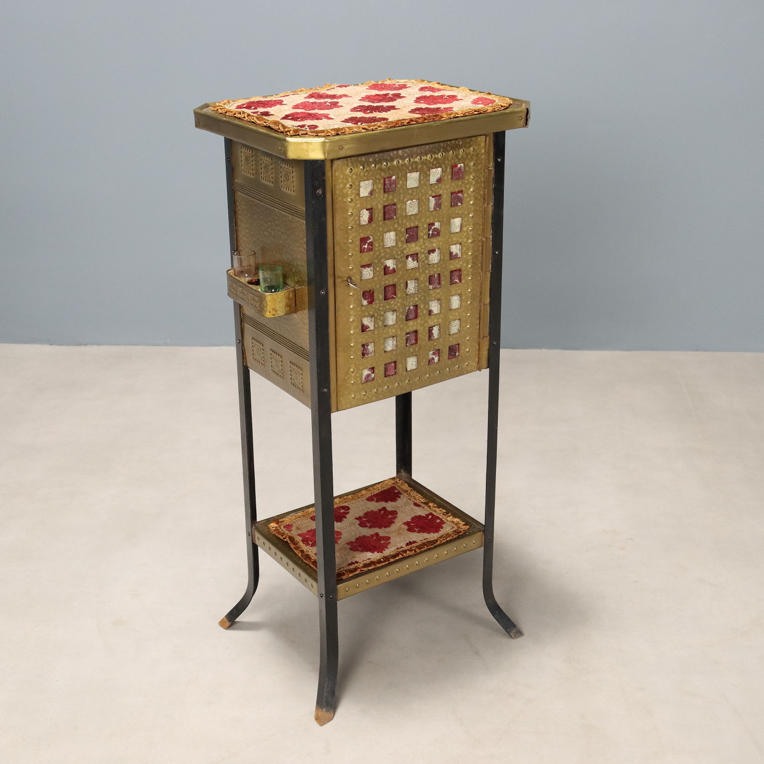 Art Nouveau bar cabinet. Brass-plated copper sheet frame, worked with a burin, supported by four iron legs with saber feet. Central door under the top, two glass holders on the sides, two glasses missing. Germany, early 20th century.