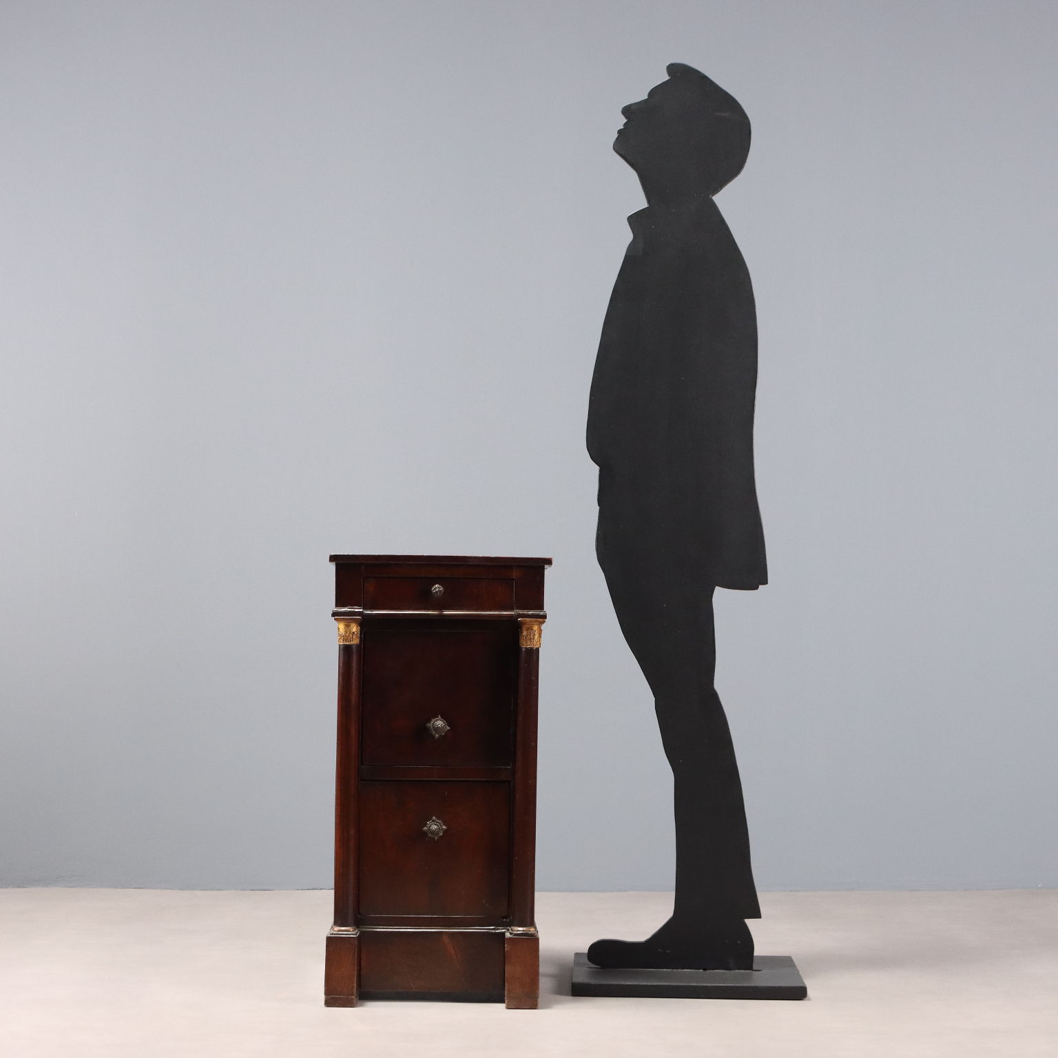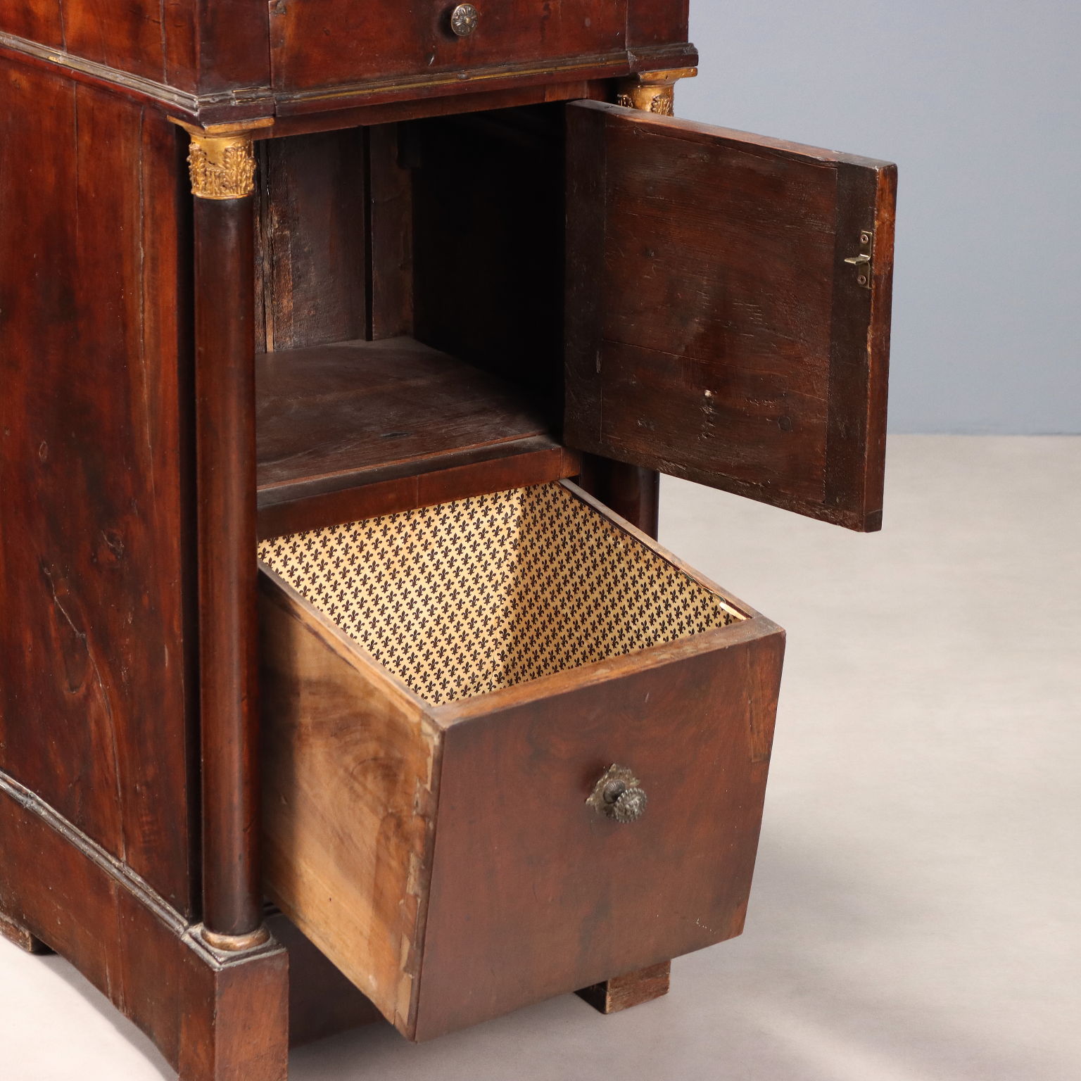 Empire walnut nightstand. Front with a drawer projecting from the under-counter band, central door and drawer below. Pair of turned columns with carved and gilded capitals and plinth feet. Italy, first quarter of the 19th century.