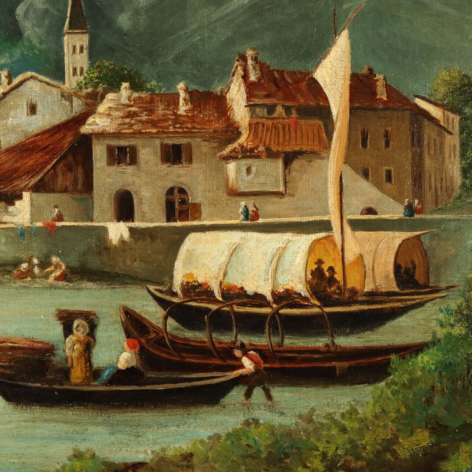 Oil on canvas. A pleasant view of the small village of Omegna, in the province of Verbano-Cusio-Ossola, located at the northern end of Lake Orta; the Alpine peaks rise behind it. Village life is a hive of activity, with numerous figures both on land and afloat in small boats. The painting shows signs of restoration on the back.