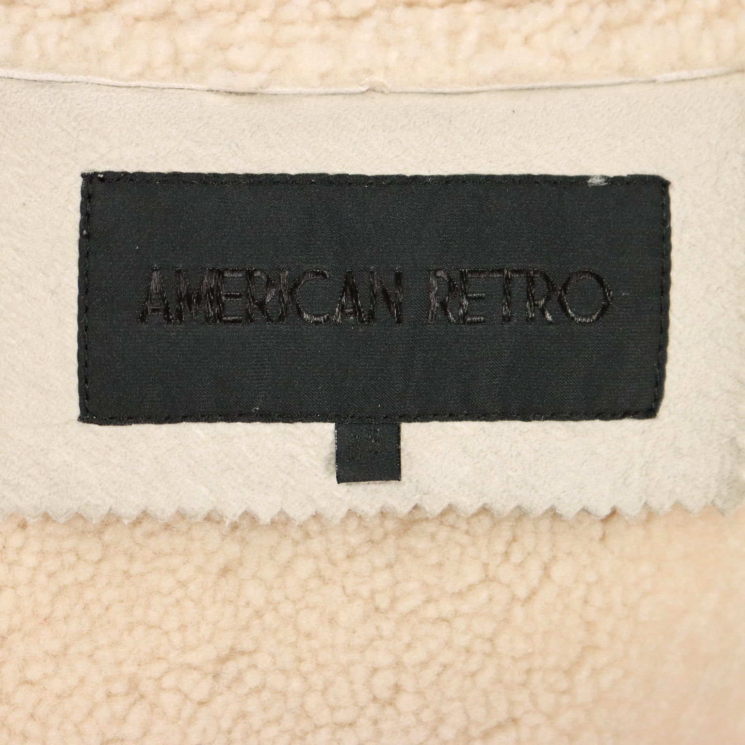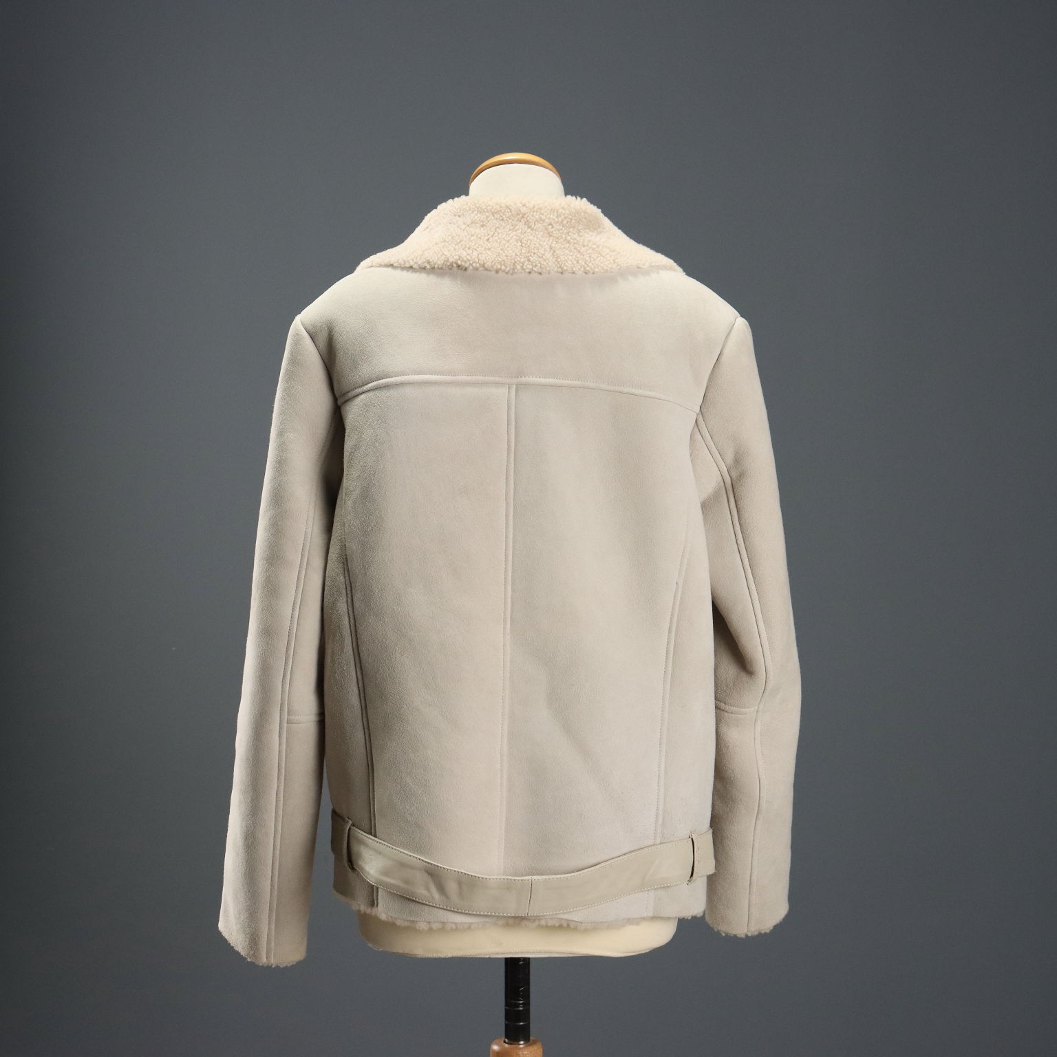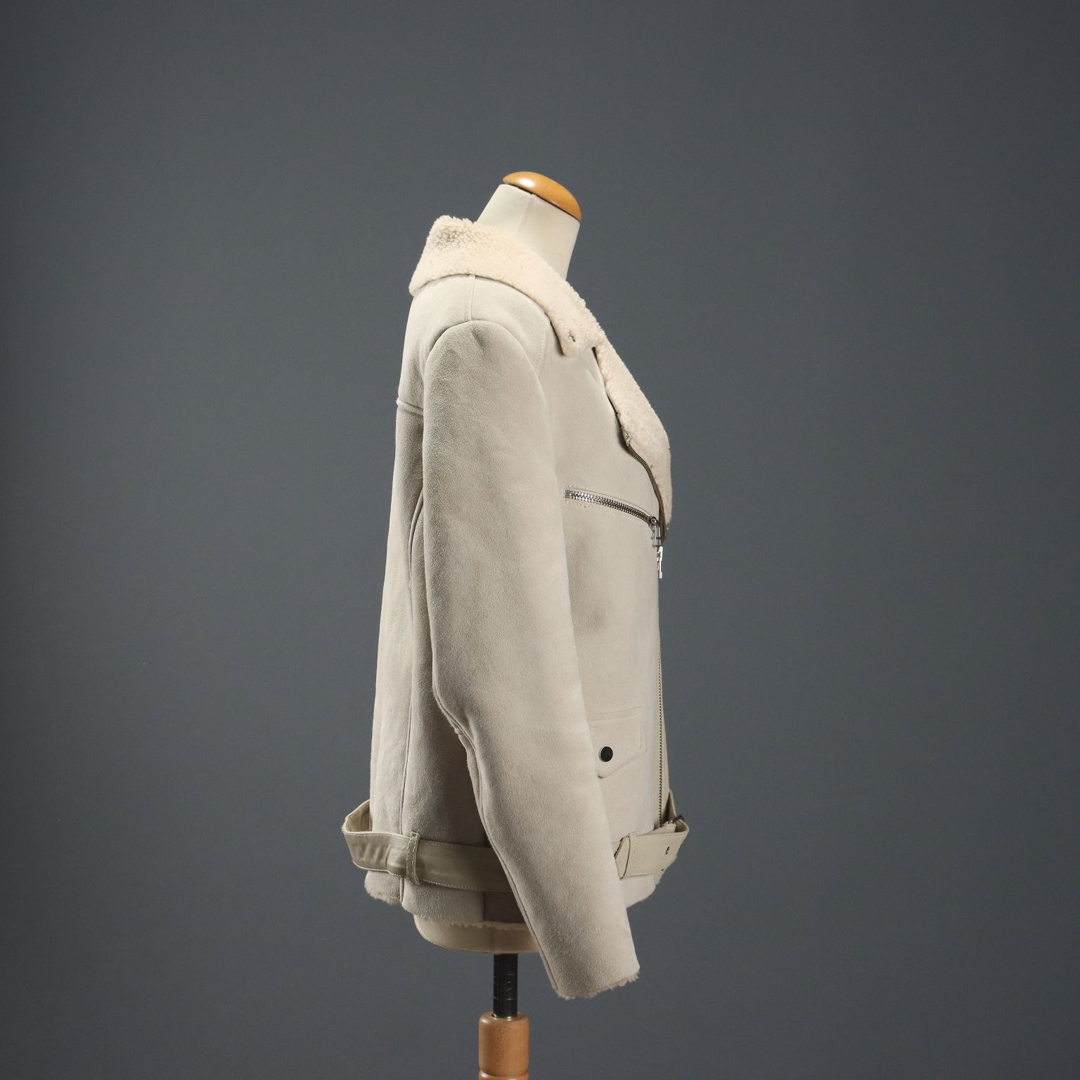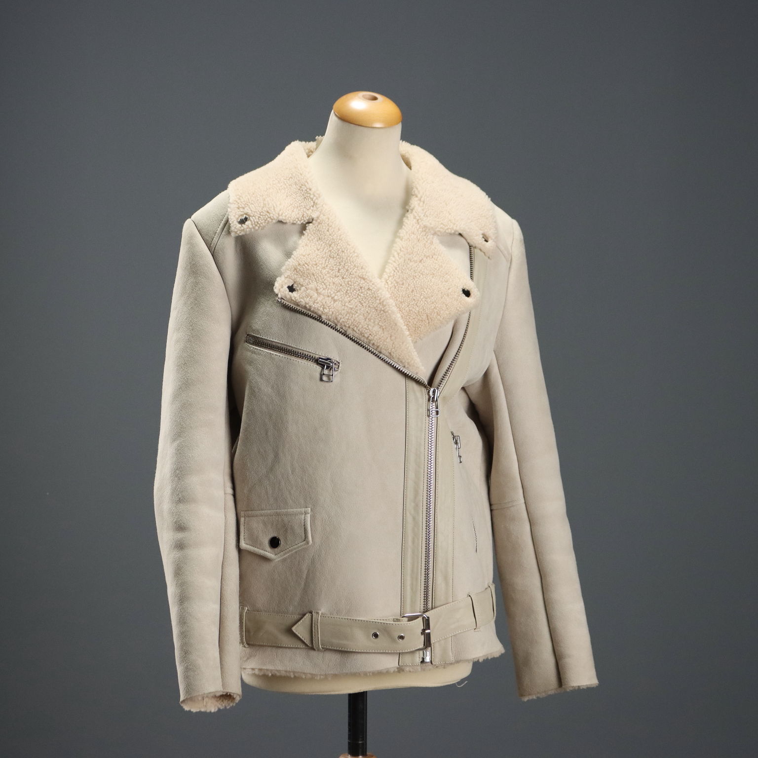 Jacket made of light beige lamb shearling. The piece features various details that distinguish a biker-style jacket. The belt and zipper trim are made of soft, matching leather. Please note a slight defect in the leather on the left sleeve. The size shown on the label is a 38, probably French; in fact, the garment fits a medium. Below are some measurements. Length: 64 cm. Shoulder width: 44 cm. Sleeve length: 62 cm. Armhole: 56 cm.