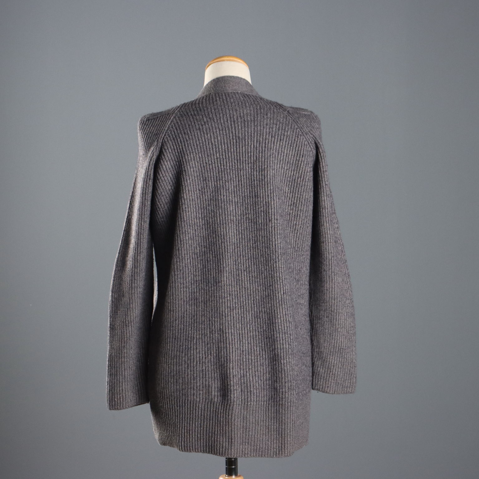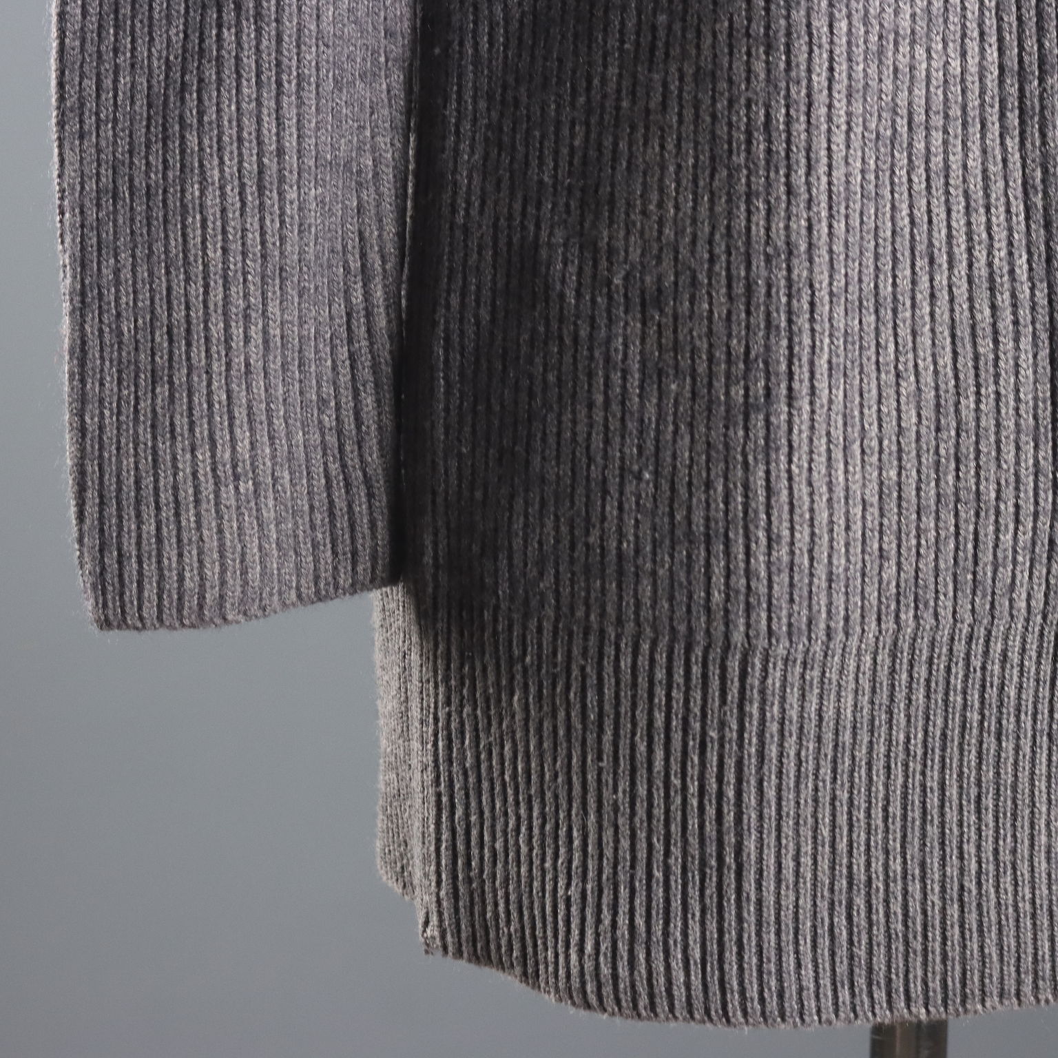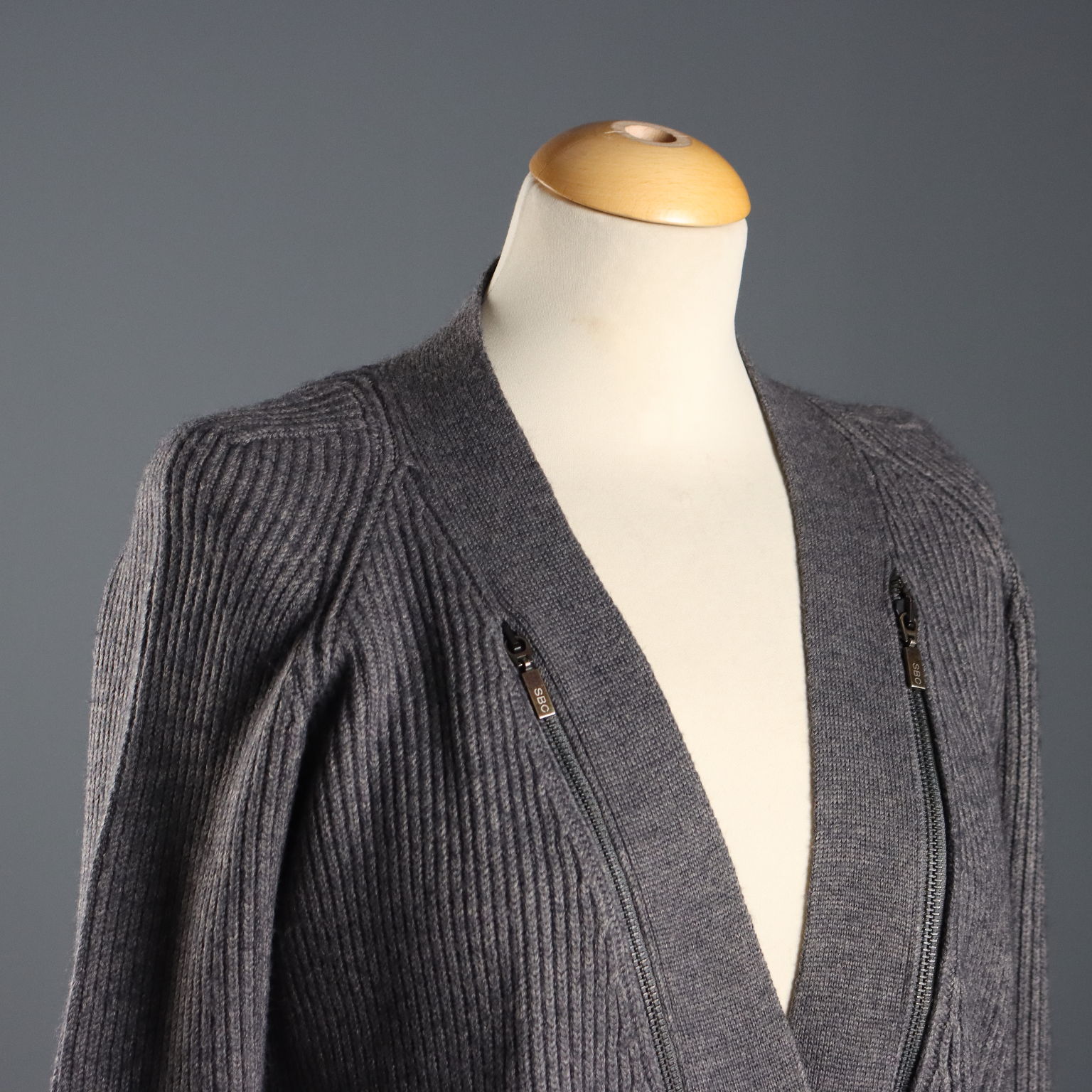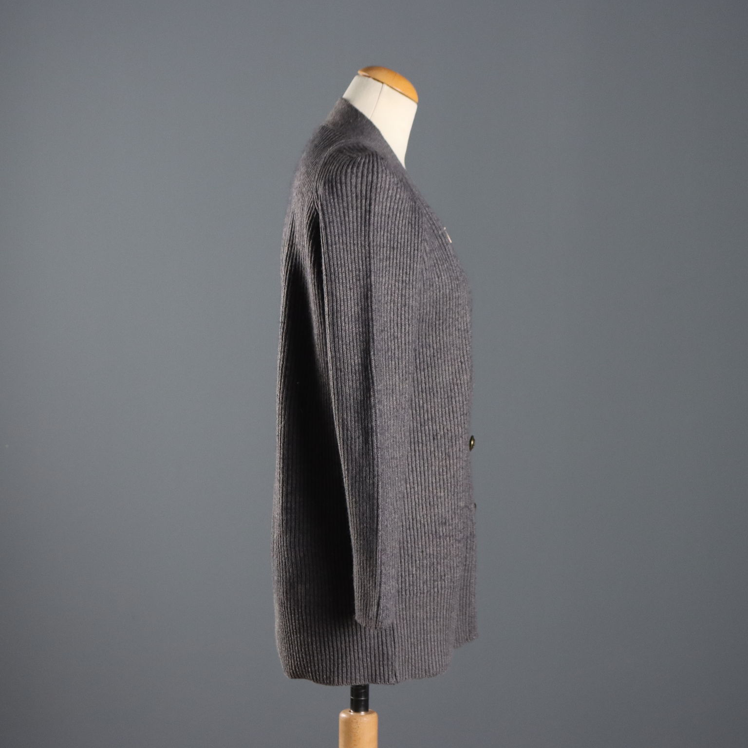 Gray wool blend cardigan with metal button placket. Unique zipper detailing on the sides of the lapels. Length: 72 cm. Chest: 55 cm. Sleeve length: 64 cm.
