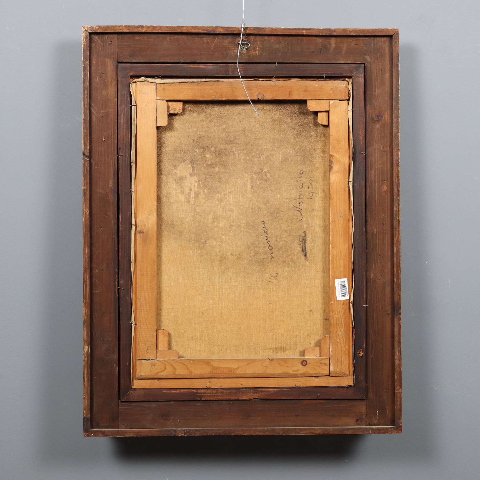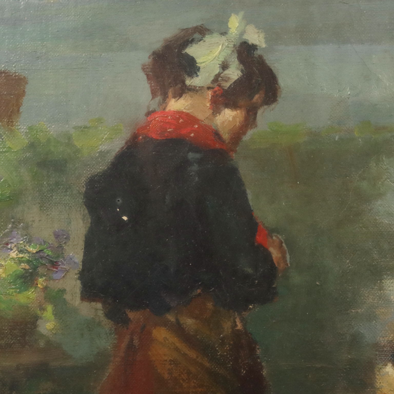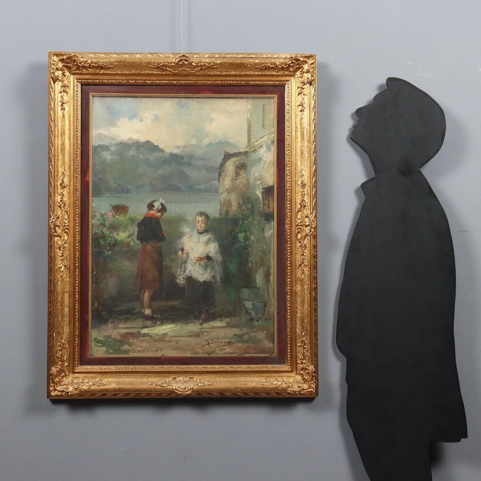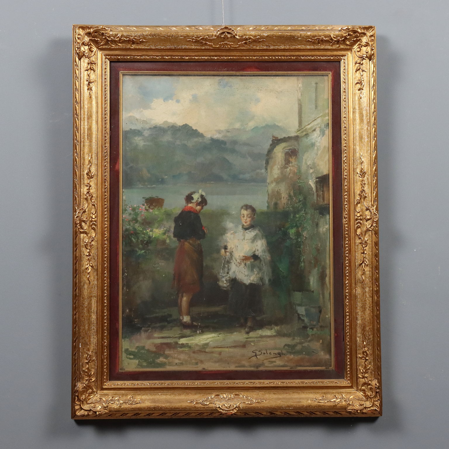 Oil on canvas. Signed lower right. Title, date, and location (Nobiallo, a hamlet of Menaggio on Lake Como) are on the back. Giuseppe Solenghi's extensive oeuvre, rich in lyricism expressed with delicate, refined tones and strokes, predominates with Milanese cityscapes and Venetian lagoon views, but there are also several countryside views, predominantly Lombardy, as well as rustic interiors. Here, a scene with figures is depicted, albeit set in a Lombard landscape, with Lake Como clearly visible in the background: on the cobbled path behind the church, an altar boy carrying an incense burner shows it to a young girl, proud of his role! The work is presented in a contemporary frame.