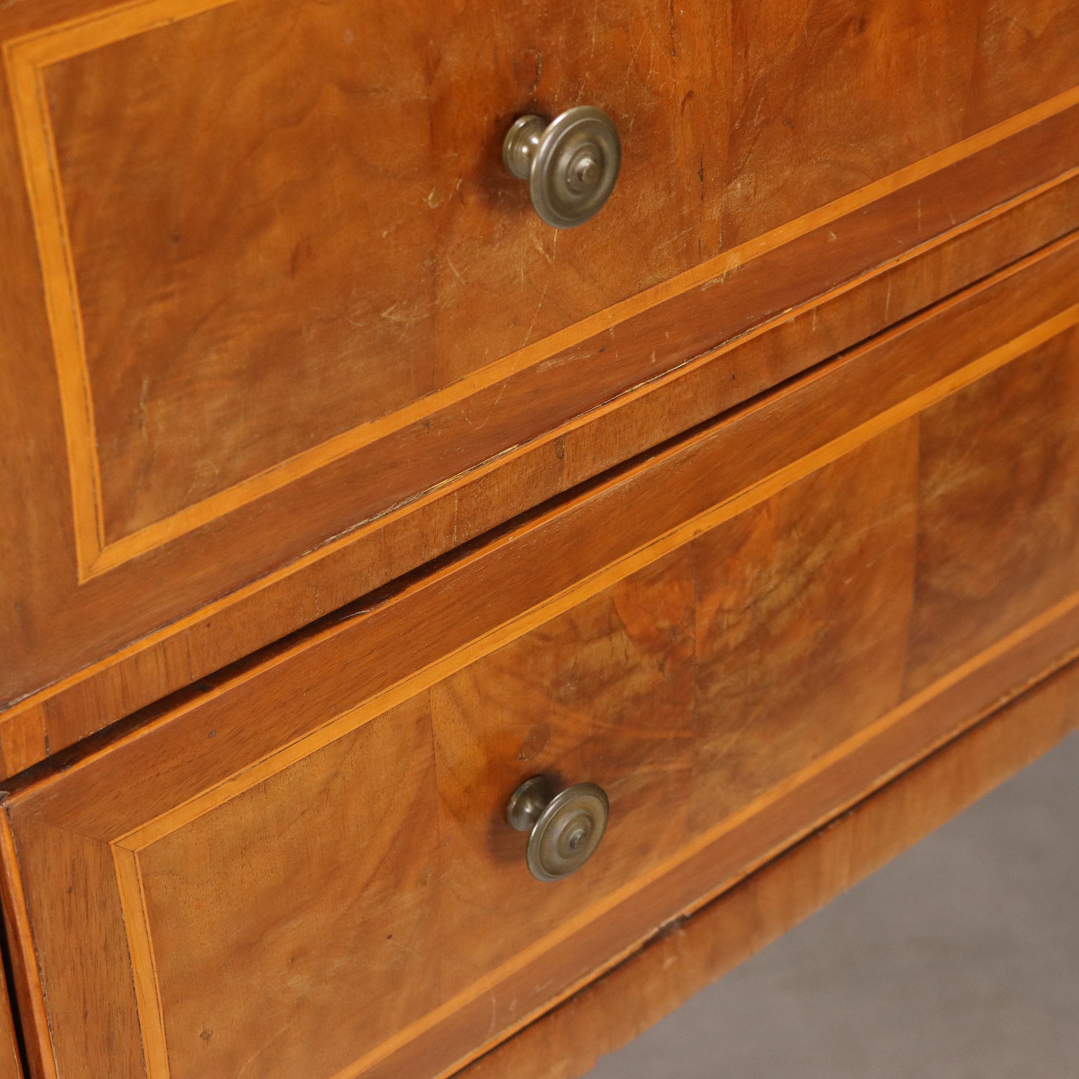 Neoclassical mahogany chest of drawers. Two drawers with maple trim and borders, truncated pyramidal legs. Bronze escutcheons and knobs. Italy, third quarter of the 18th century.
