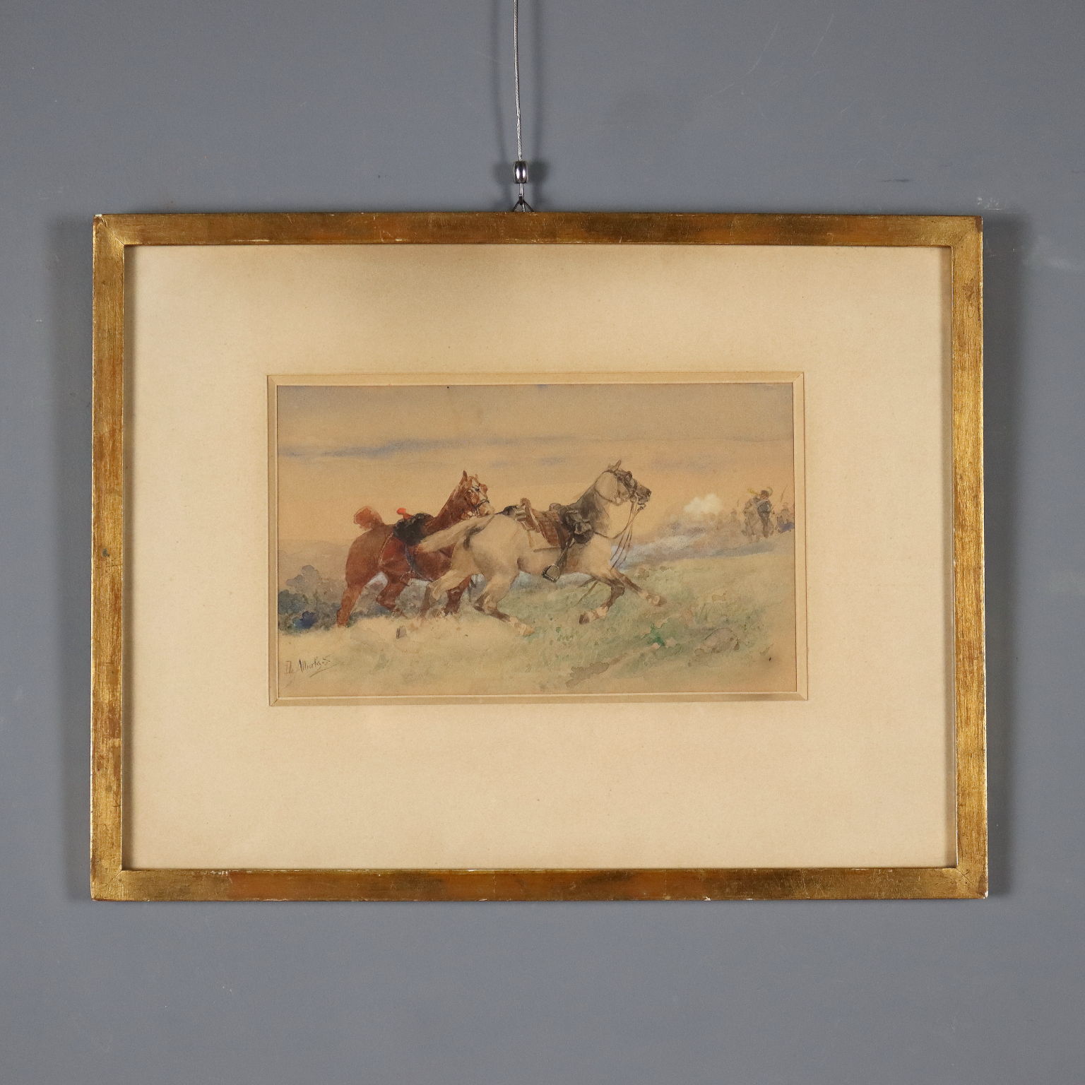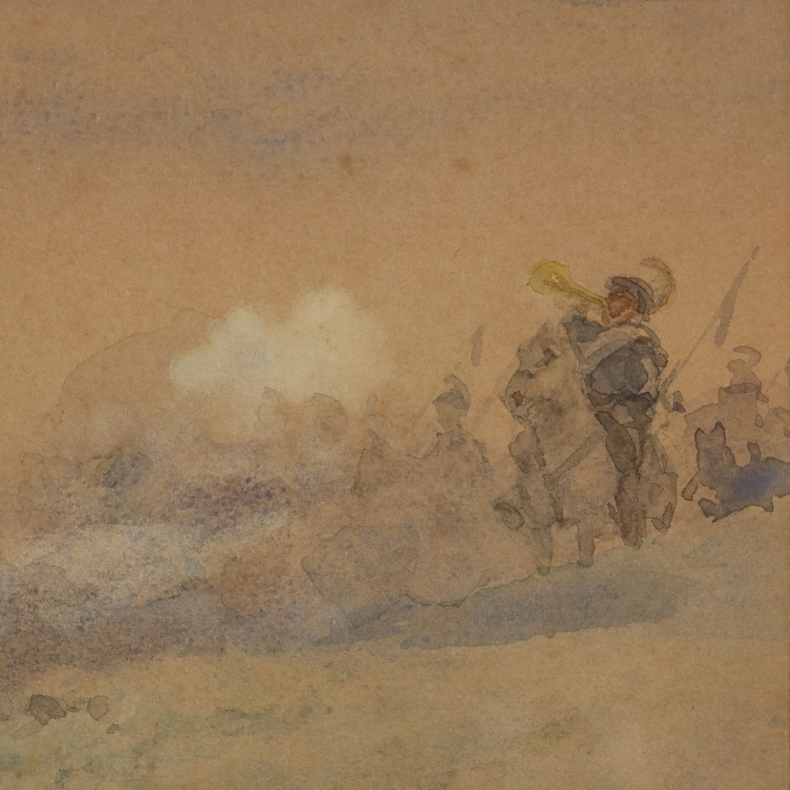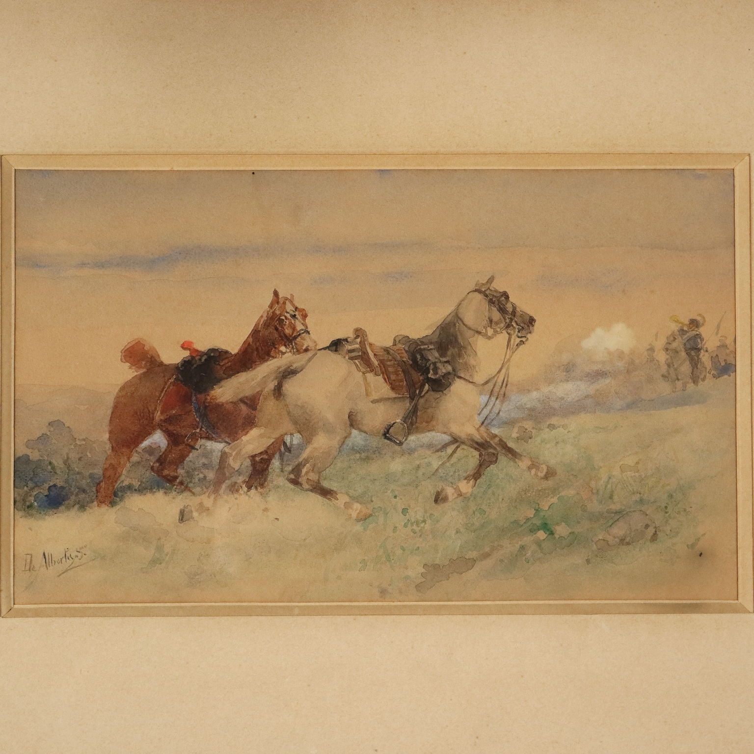 Watercolor on paper. Signed lower left. De Albertis devoted himself to the military-patriotic genre, producing a rich repertoire of battles, replicated in various variations, which gradually became his specialty. Later, he turned to watercolor, but military subjects, often featuring horses, continued to dominate his work. This watercolor, in fact, features two saddled but unridered horses, responding to the trumpet call—the rallying call—sounded by the rider at the head of the squadron, visible on the right. The work is presented in a frame.