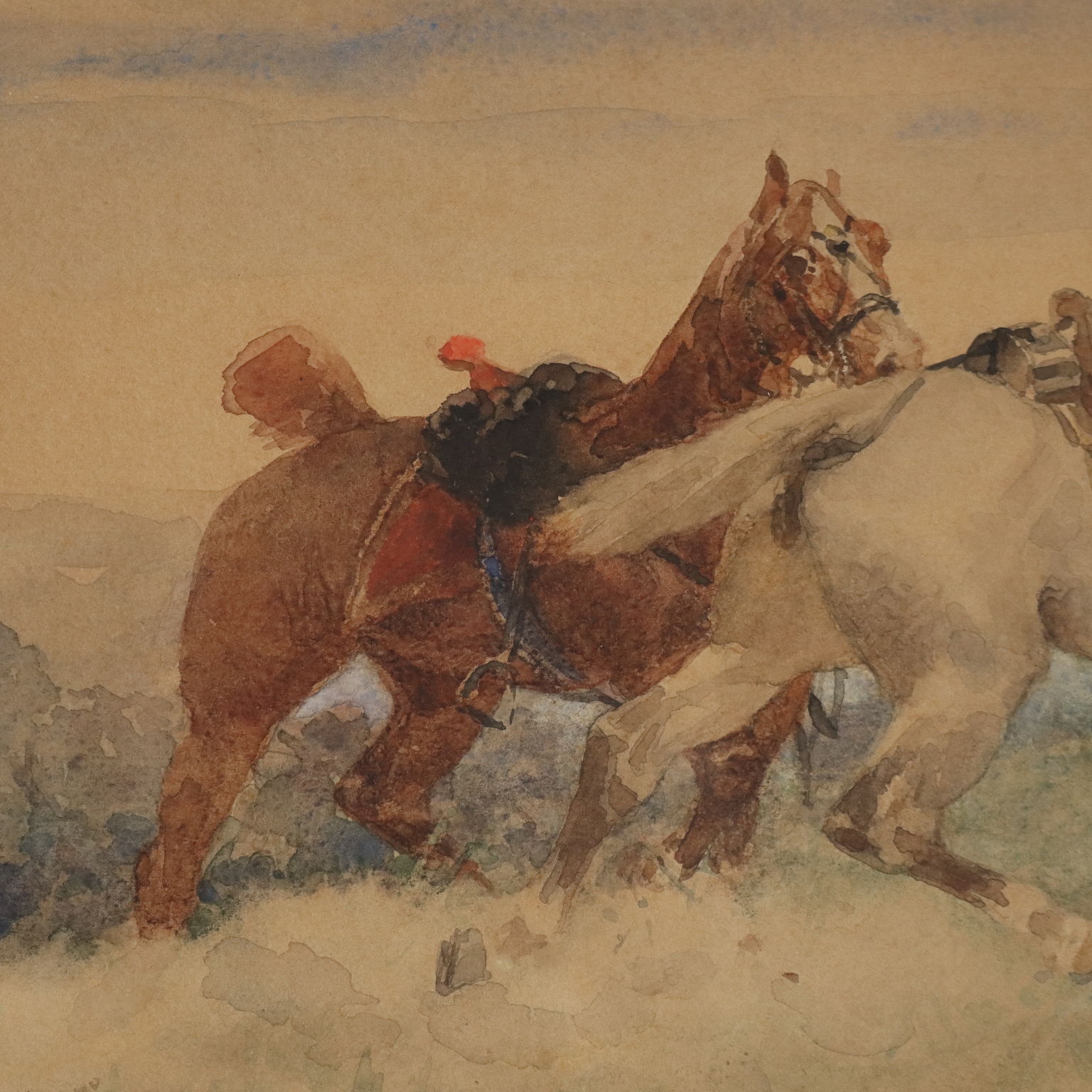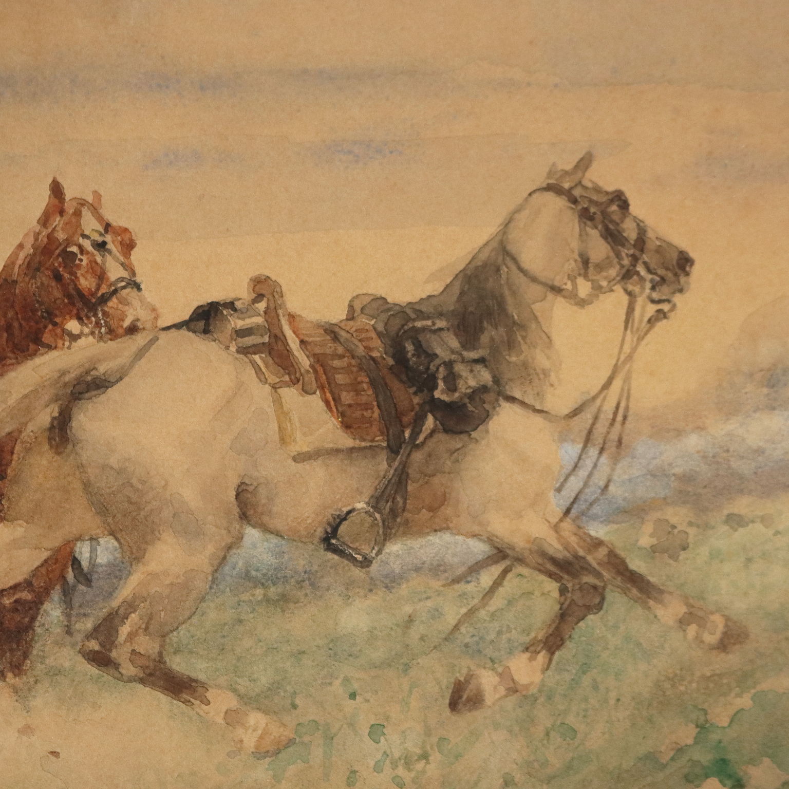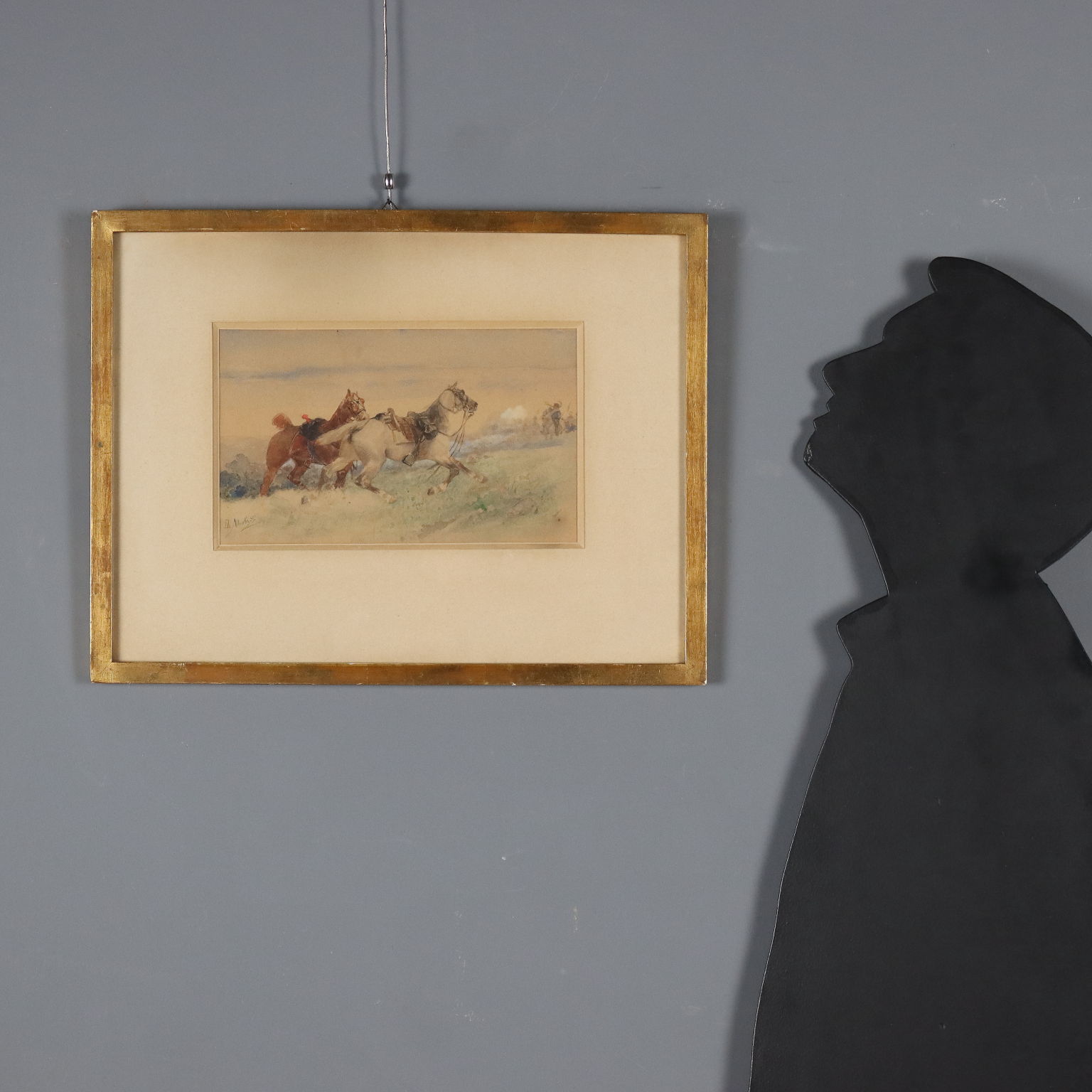 Watercolor on paper. Signed lower left. De Albertis devoted himself to the military-patriotic genre, producing a rich repertoire of battles, replicated in various variations, which gradually became his specialty. Later, he turned to watercolor, but military subjects, often featuring horses, continued to dominate his work. This watercolor, in fact, features two saddled but unridered horses, responding to the trumpet call—the rallying call—sounded by the rider at the head of the squadron, visible on the right. The work is presented in a frame.