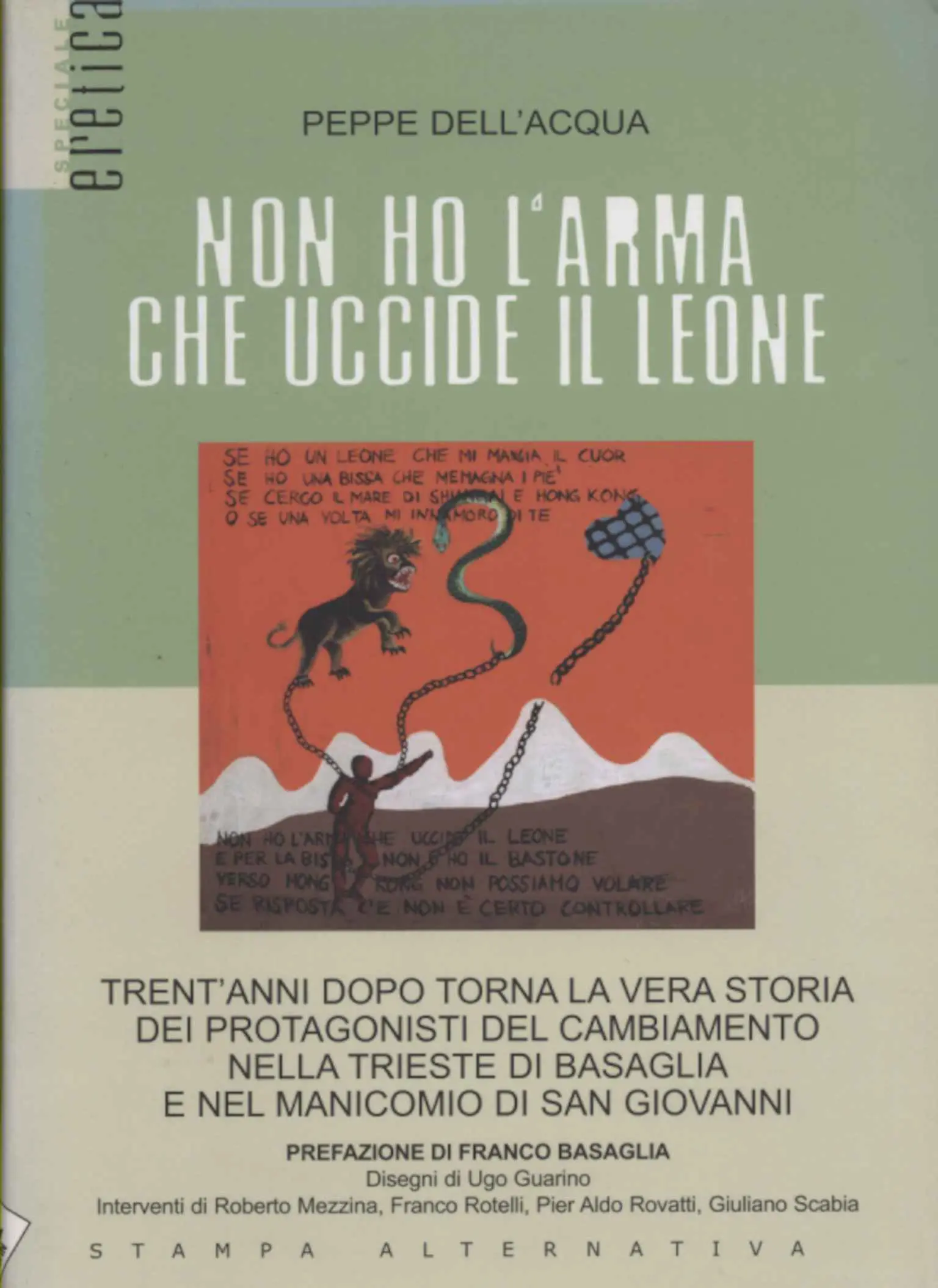 Siamo agli inizi degli anni settanta. Prima a Gorizia, poi nell'ordinato e fiabesco parco sulla collina di San Giovanni che nasconde il manicomio di Trieste, Franco Basaglia inizia a scardinare i cancelli della psichiatria, a liberare - una a una - le persone che vi sono rinchiuse, a cancellare per sempre dai corpi e dalle menti il duplice marchio del "pericolo" e dello "scandalo" che leggi, usanze e costumi conferivano alla follia e al folli: poveri, pericolosi e scandalosi. Che ricominciano a respirare, a parlare, uscire, camminare, sognare e raccontare i propri sogni, ritornando a essere ciò che sono. Persone, cittadini con un nome, un cognome, un indirizzo, una professione, un conto in banca, uno stato civile, un campo d'azione dove giocarsi un futuro. Peppe Dell'Acqua, giovane psichiatra arrivato a Trieste, registra queste voci. E da quell'ascolto prende vita una grande e unica testimonianza, mai sentita prima. Ed ecco che "Non ho l'arma che uccide il leone" diventa un classico che, come tutti i classici, ha la fortuna di trovarsi nel posto giusto al momento giusto: quell'attimo fuggente e magico in cui viene scritto un pezzo di storia, dopo il quale niente sarà più come prima.